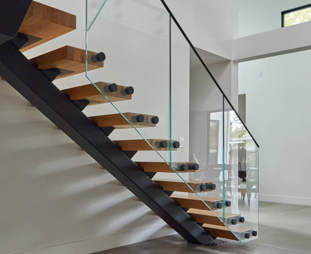 Modern glass is the perfect complement to the natural warmth of wood. The glass railing adds safety and stability without compromising the open feel or line of sight throughout the space. This single stringer FLIGHT design keeps all of the attention focused on the beautiful wood treads and glass railing.
