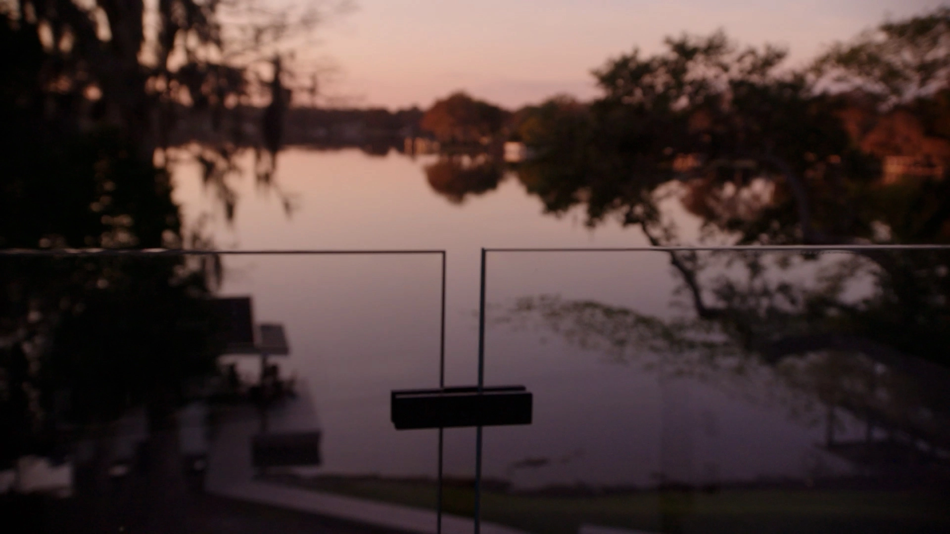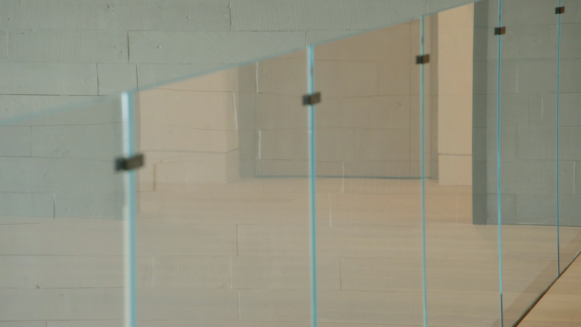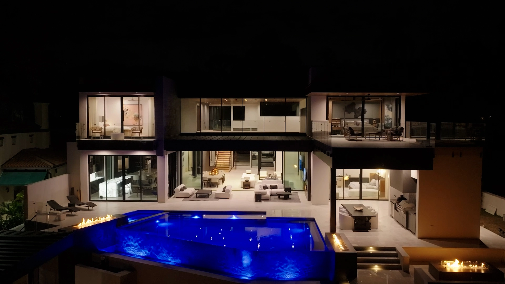 Best of all, Viewrail provided its own fully-custom product made just for TNAH 2026: FLIGHT Blade. Its gravity-defying design is the perfect centerpiece for the home's central area. Switchback, cantilevered stairs are paired with structure-reinforcing glass railing, recessed handrail, and integrated LEDs. The system also features a wall of custom, over-sized glass panels.