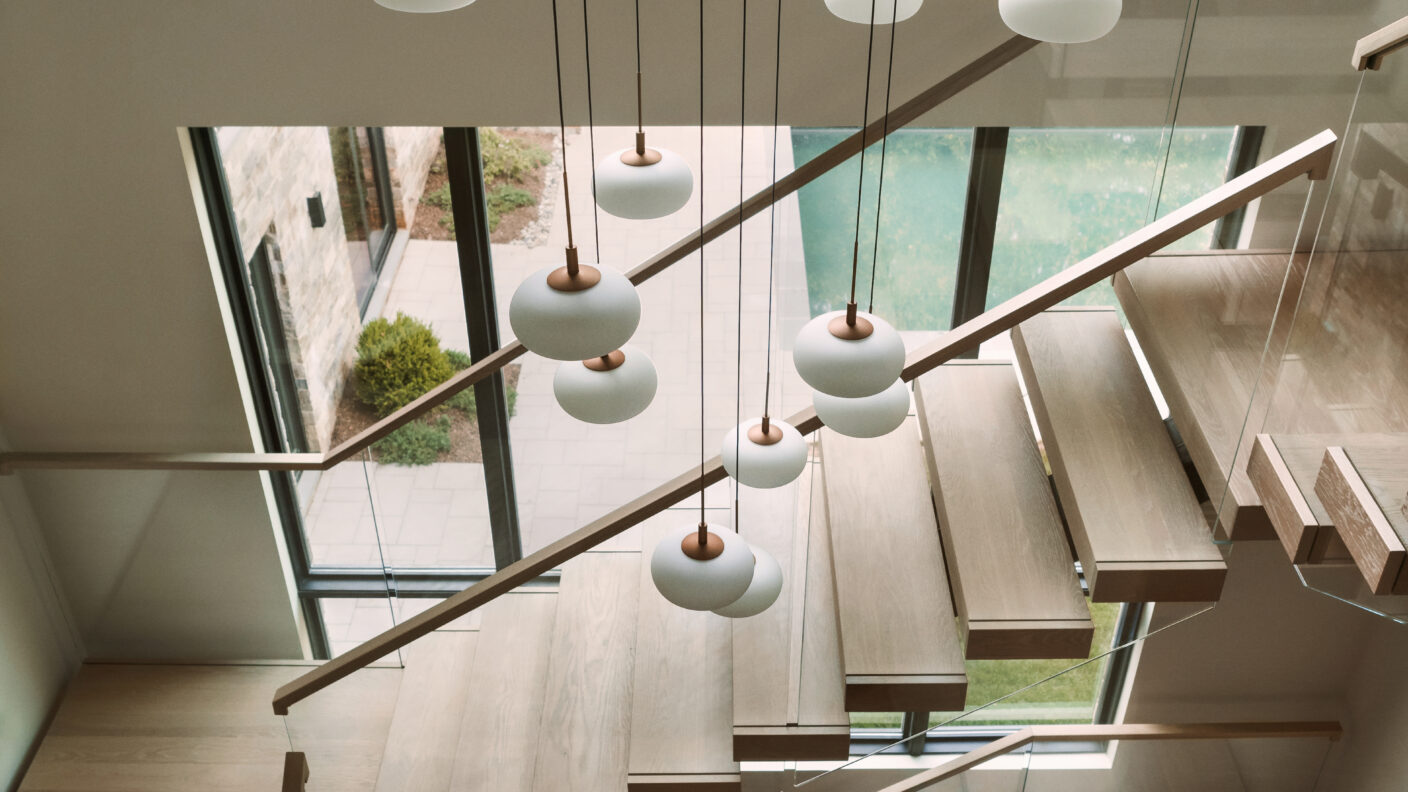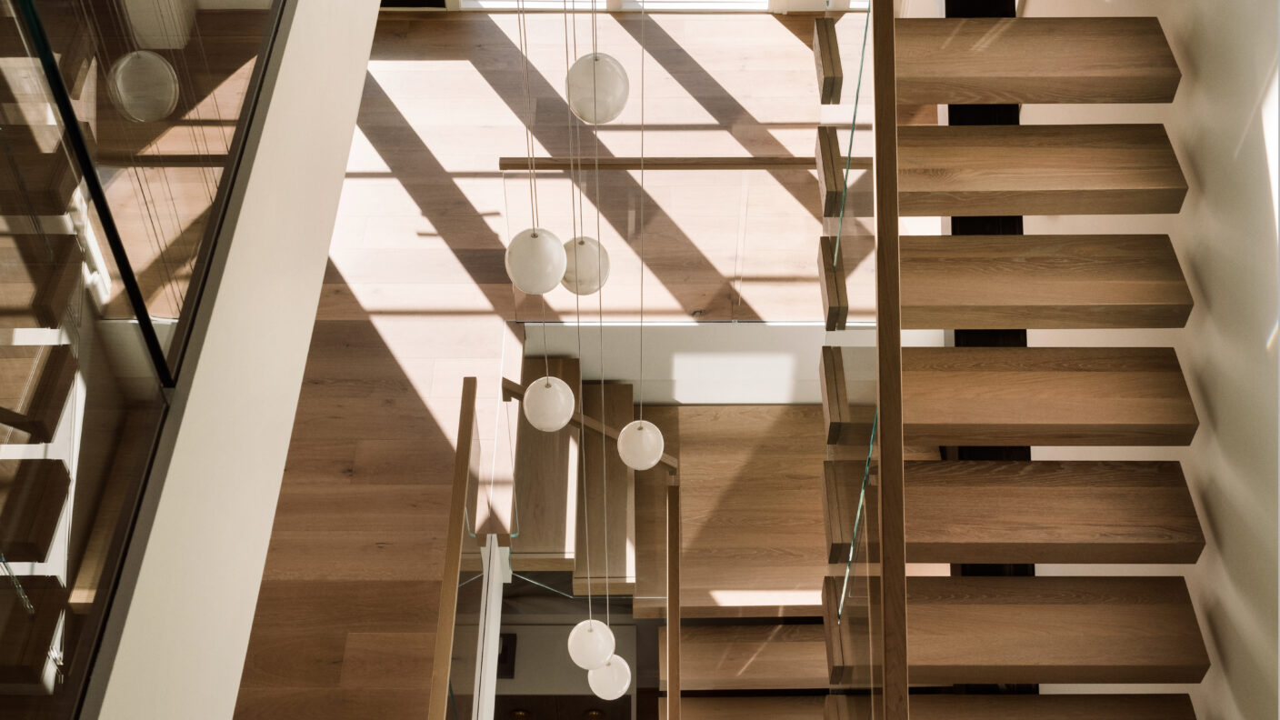 This FLIGHT Mono rises multiple stories, circling the classic modern chandelier suspended in the middle of the stairway. The windows allow natural light to cascade in bringing out the warmth of the wood. Together these elements, create not just a passage between levels, but a stunning fixture of the home.