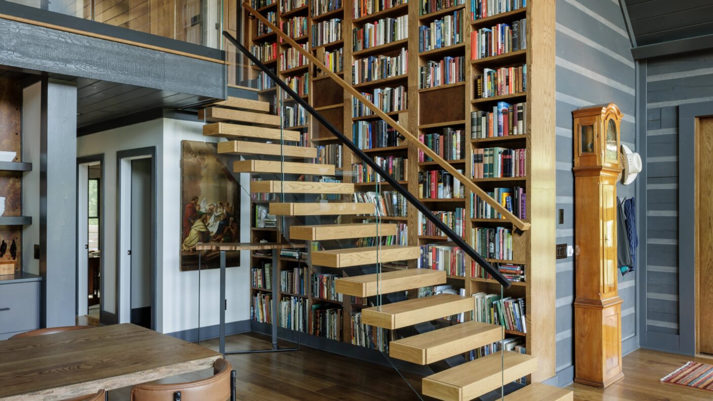 These cabin owners built a jaw-dropping, floor-to-ceiling book shelf, so they couldn't cover it up with stairs. FLIGHT Mono with Vedera Glass Railing was the perfect fit for their project.