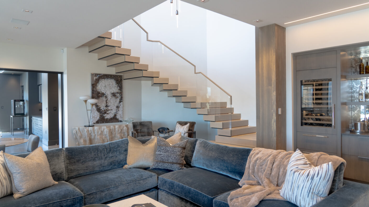 This stunning space showcases how a beautiful staircase can tie a home's design together. This FLIGHT Stack system turns the corner with intriguing light features and sleek glass railing.