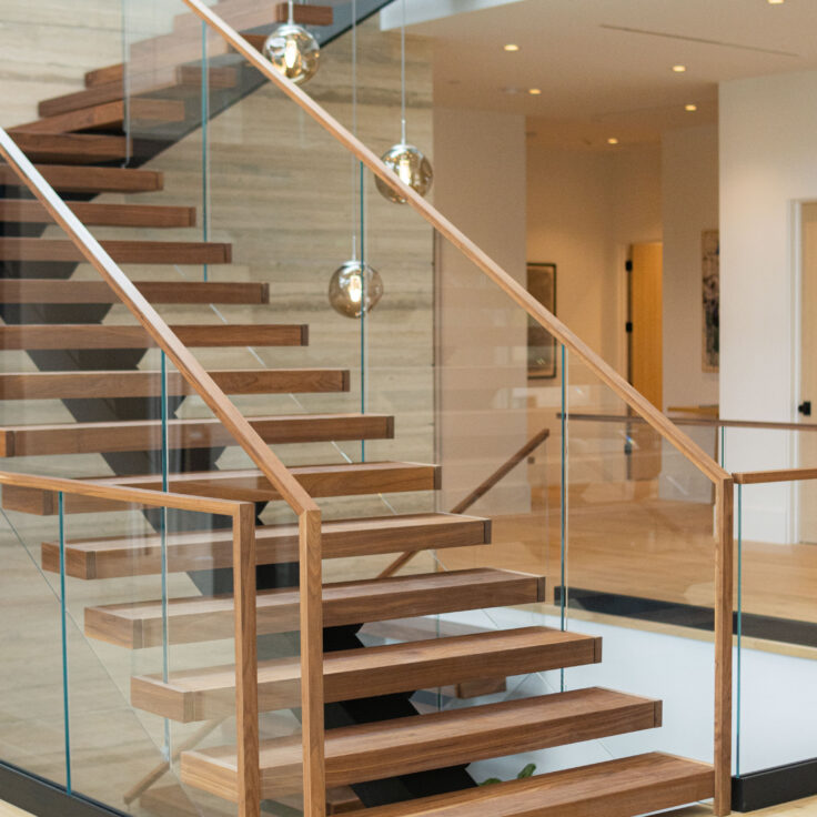 Products: Base Rail, FLIGHT Floating Stairs, FLIGHT Mono, Glass Railing, 4″ Thick Stair Treads, 6008 Square Wood Cap Rail