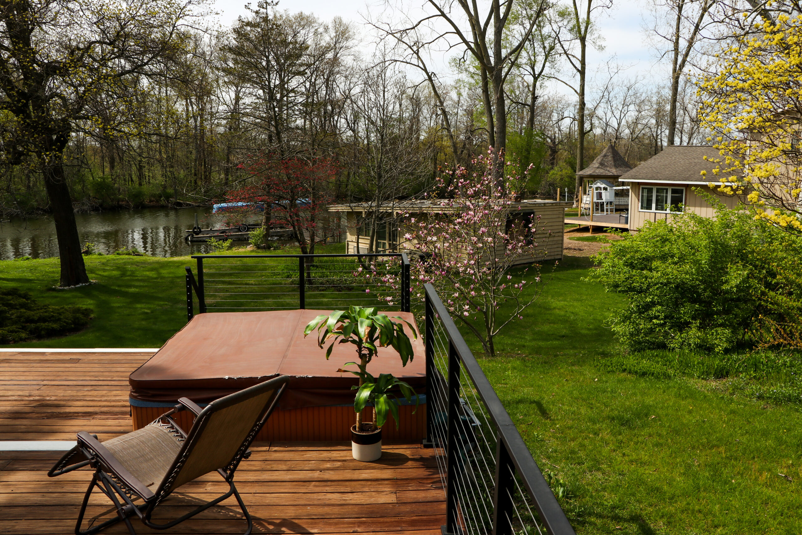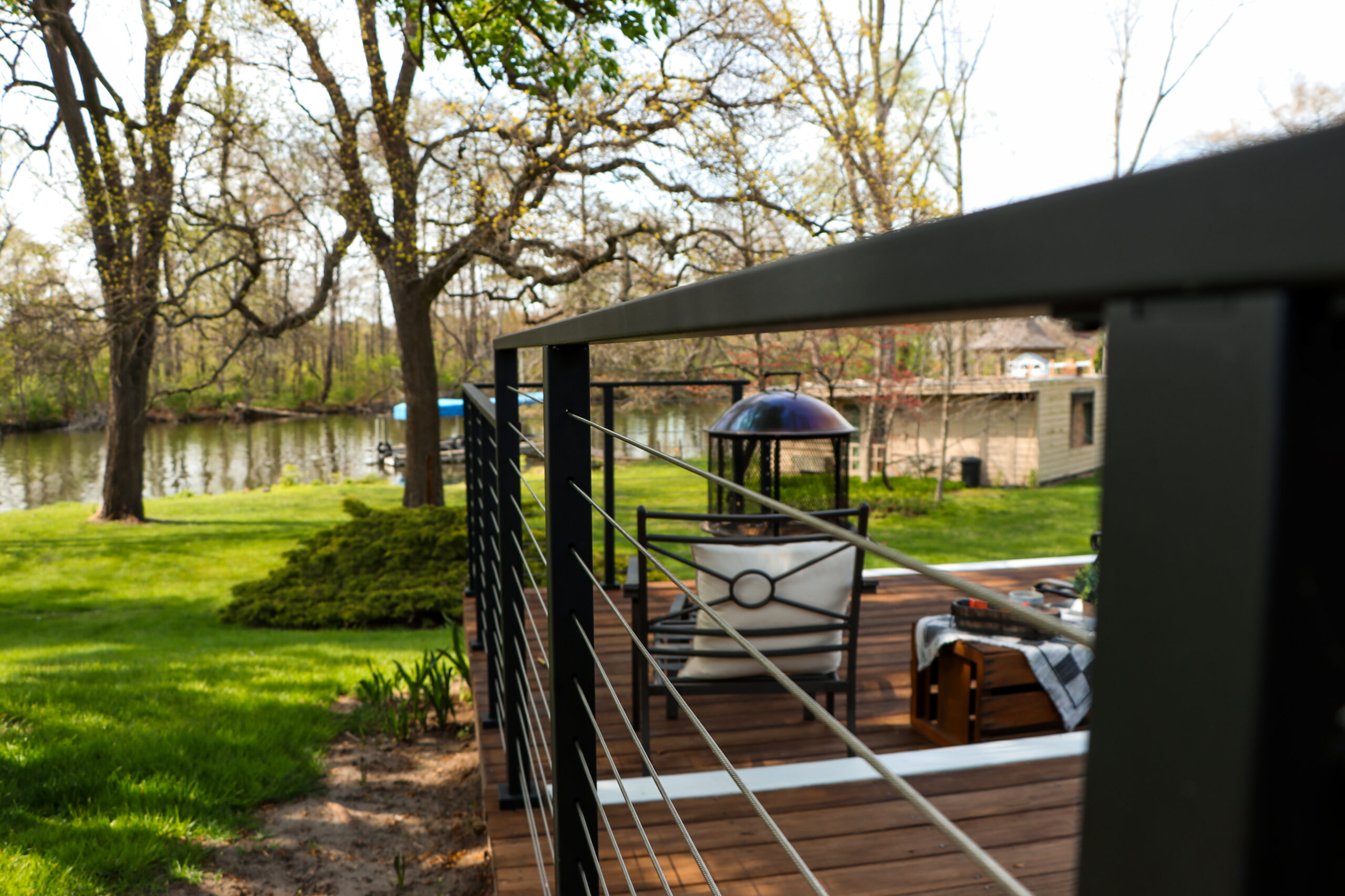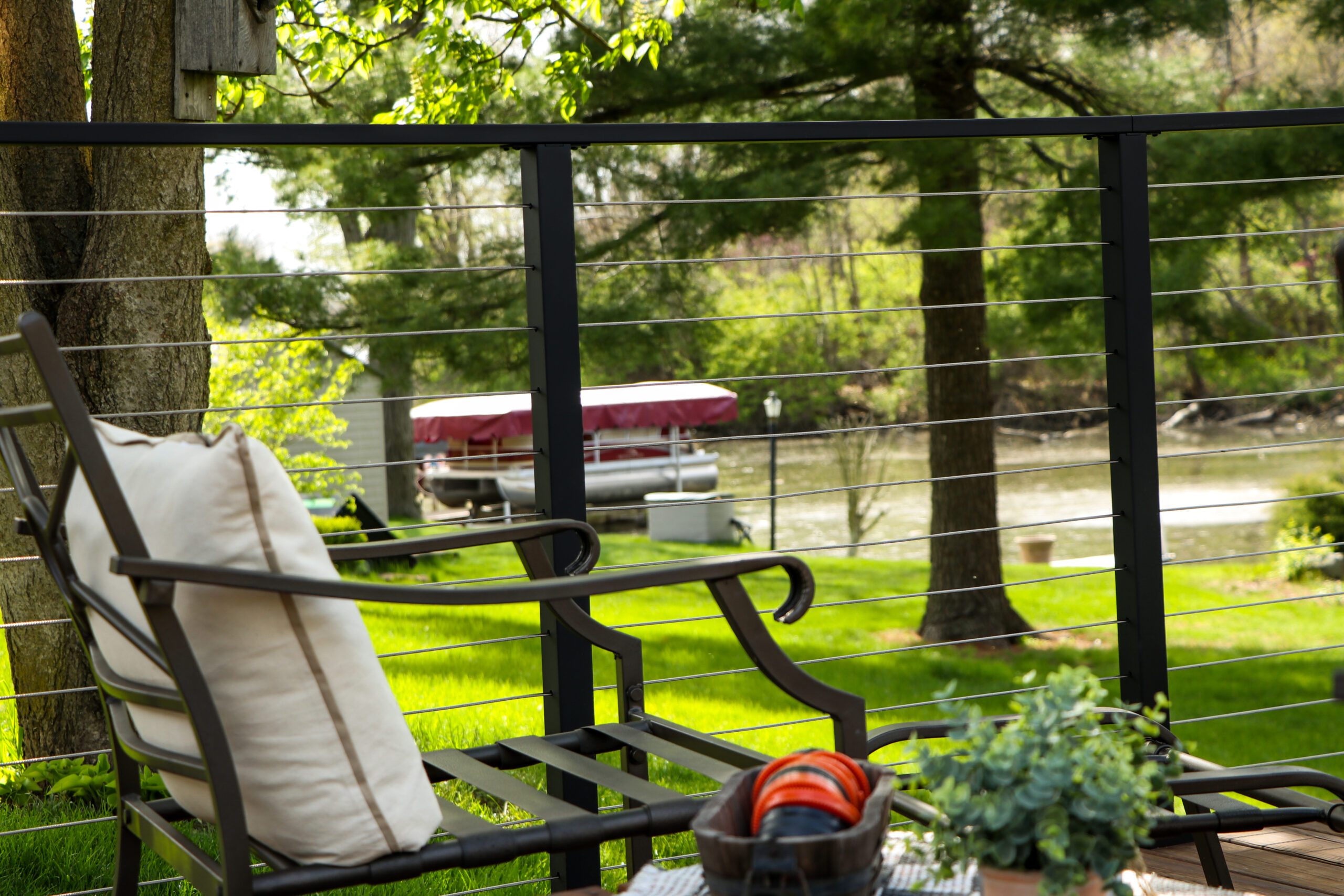 Viewrail’s own CJ decided his deck of 20 years needed a complete renovation. Years of weathering had taken its toll and a large, blocky wood railing obstructed their view of the yard and river. He first started by removing the previous wood railing system. He then moved onto sanding, power washing and refinishing the deck boards. Finally, after all the prep work was completed, he installed this beautiful Express Cable Railing System, which opened the view to their beautiful back yard.