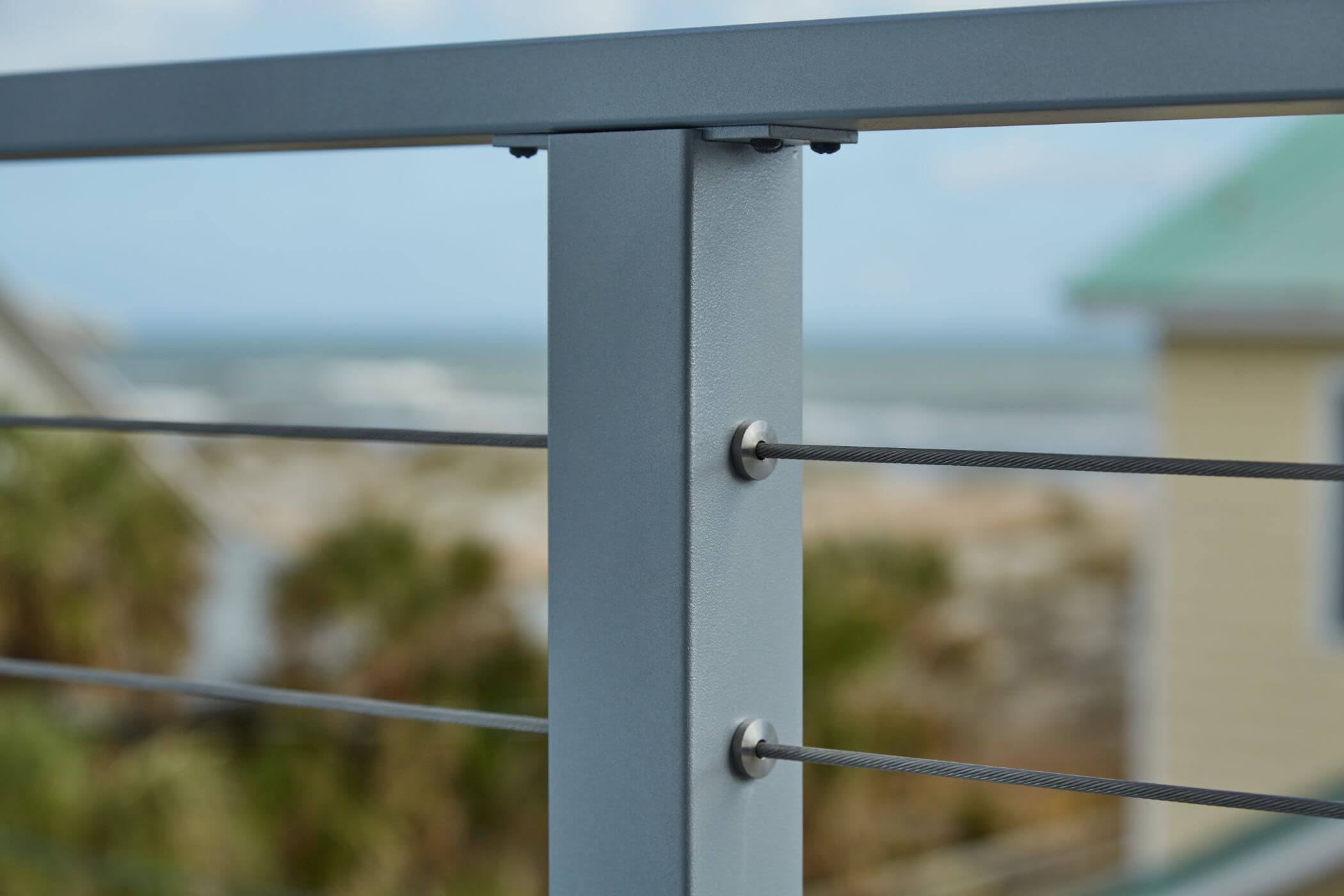 A sturdy cable railing system wraps around both outdoor deck railing balconies in this beach home.
