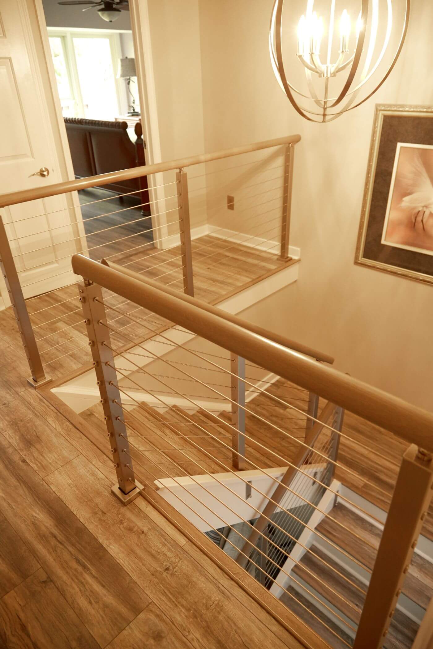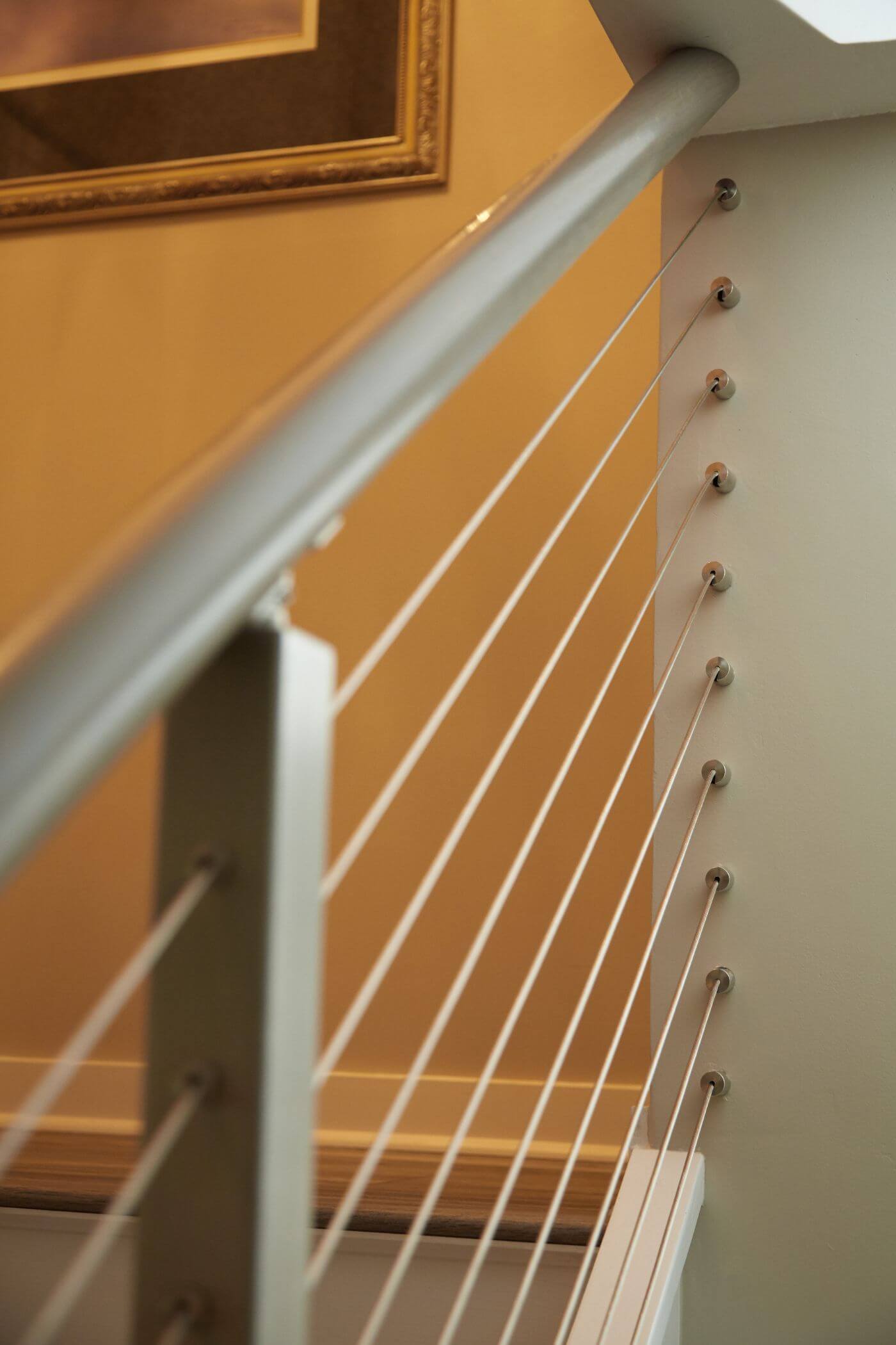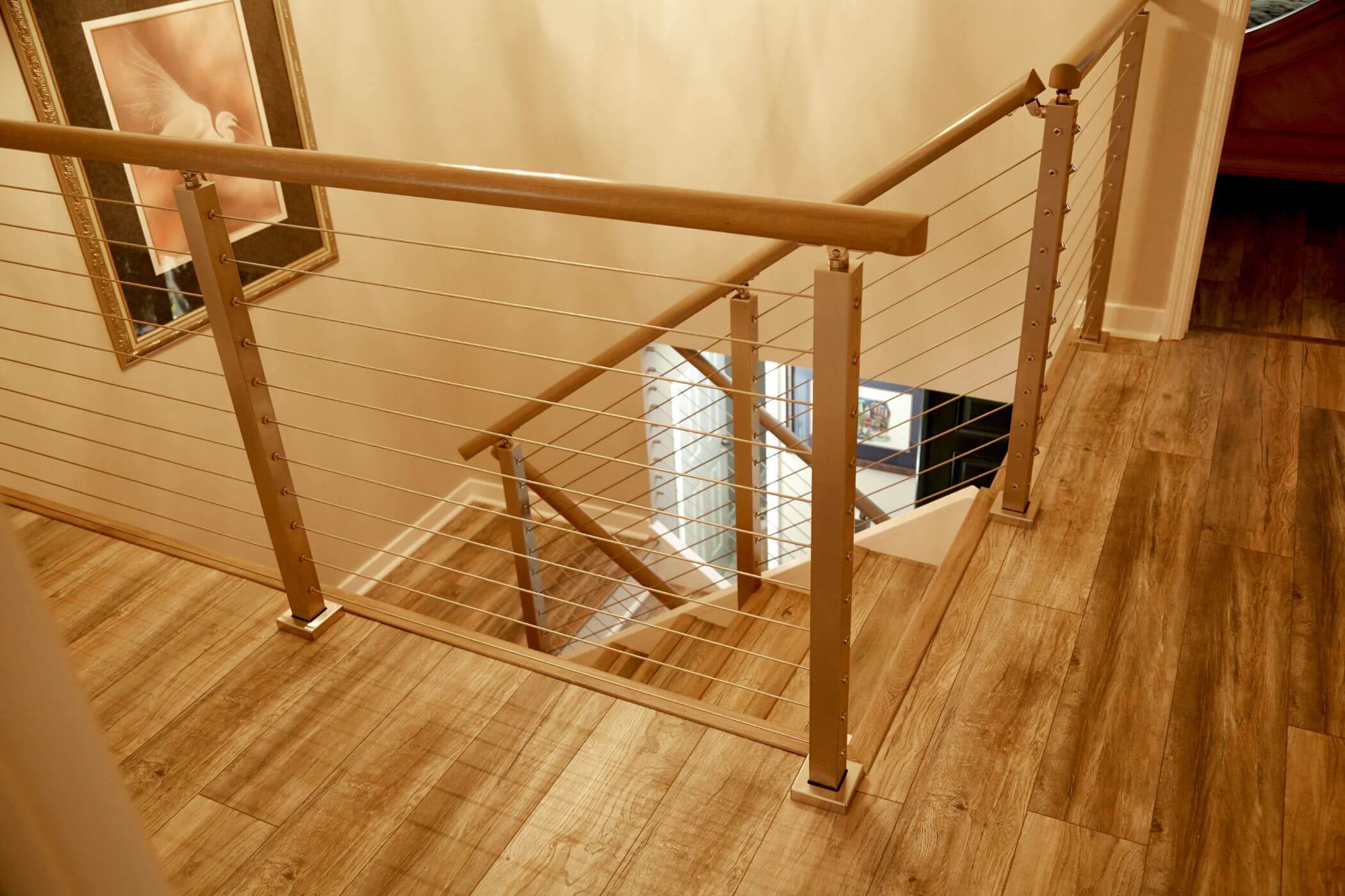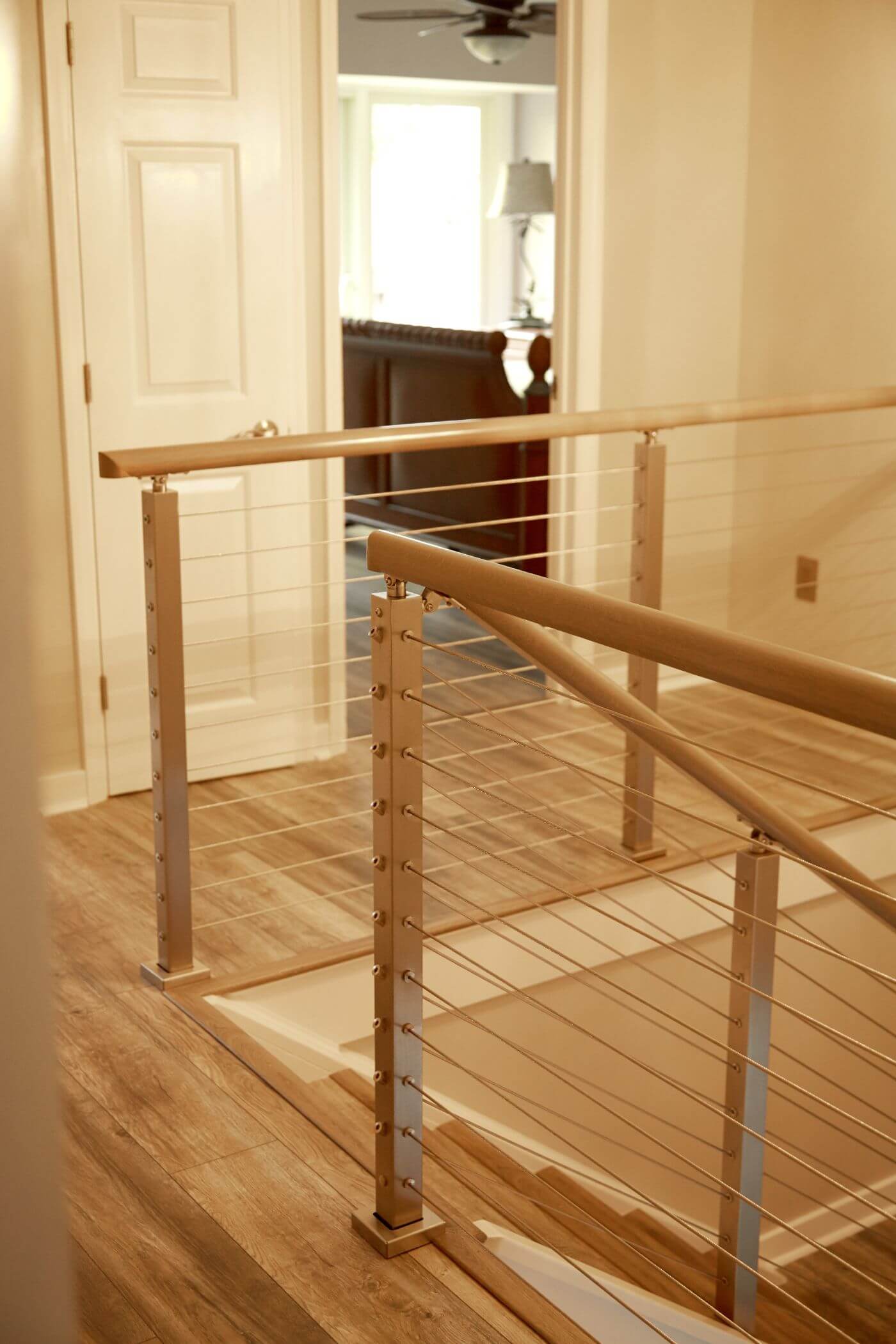 A gorgeous beach home in Fernandina, Florida gets an indoor cable railing makeover. Round metal handrail leads up the main staircase, while side mount posts keep the stair treads wide open. At the top of the stairs, the homeowners chose to mix wooden handrail with the sleek, steel cable for a homey yet industrial look. The entire system was simple to install, and it will be simple to maintain for years to come — so these homeowners can enjoy the salt and sand of the beach without worrying about their home’s interior.