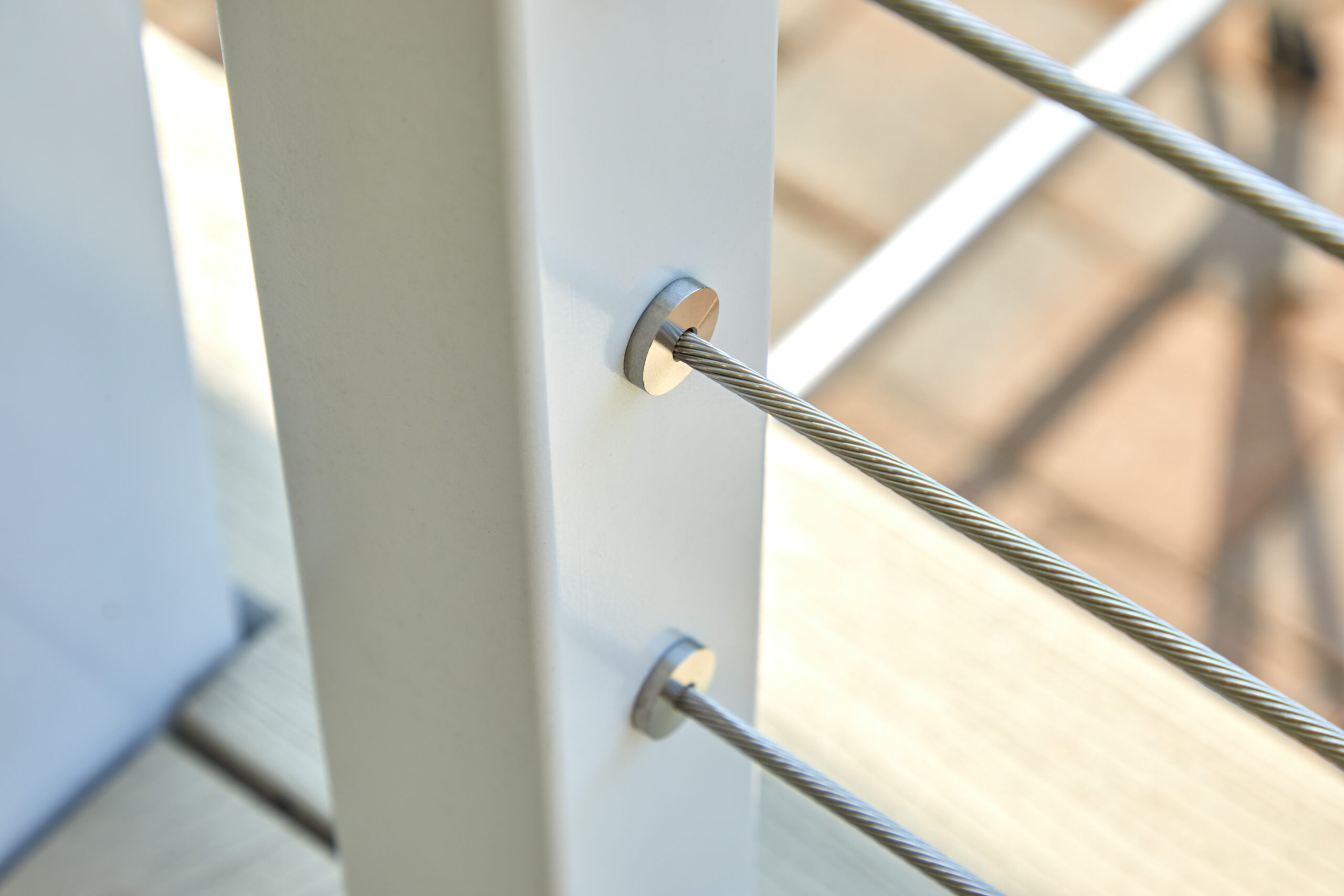 This Apollo White cable railing system blends in with the white trim color of the house and helps preserve the beautiful view of the water. Functional and strong, the beverage handrail provides a perfect place to set a drink down while leaning on or standing near the railing.