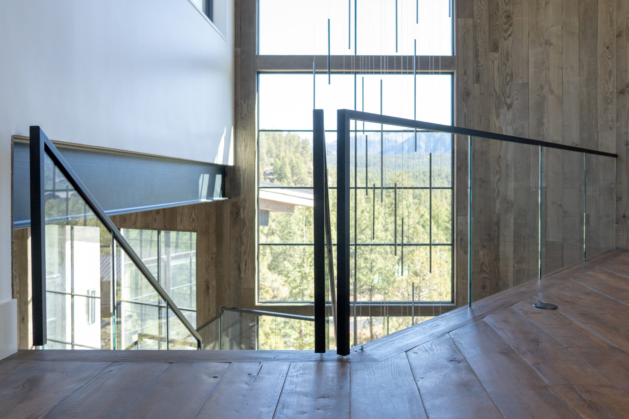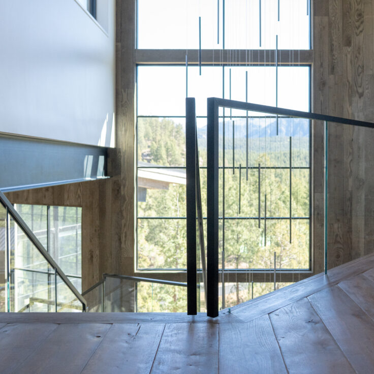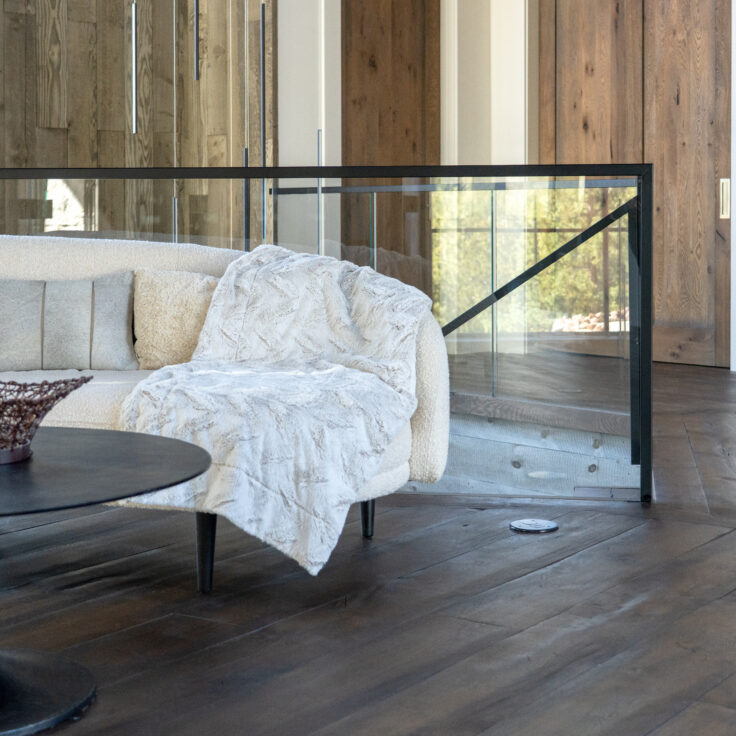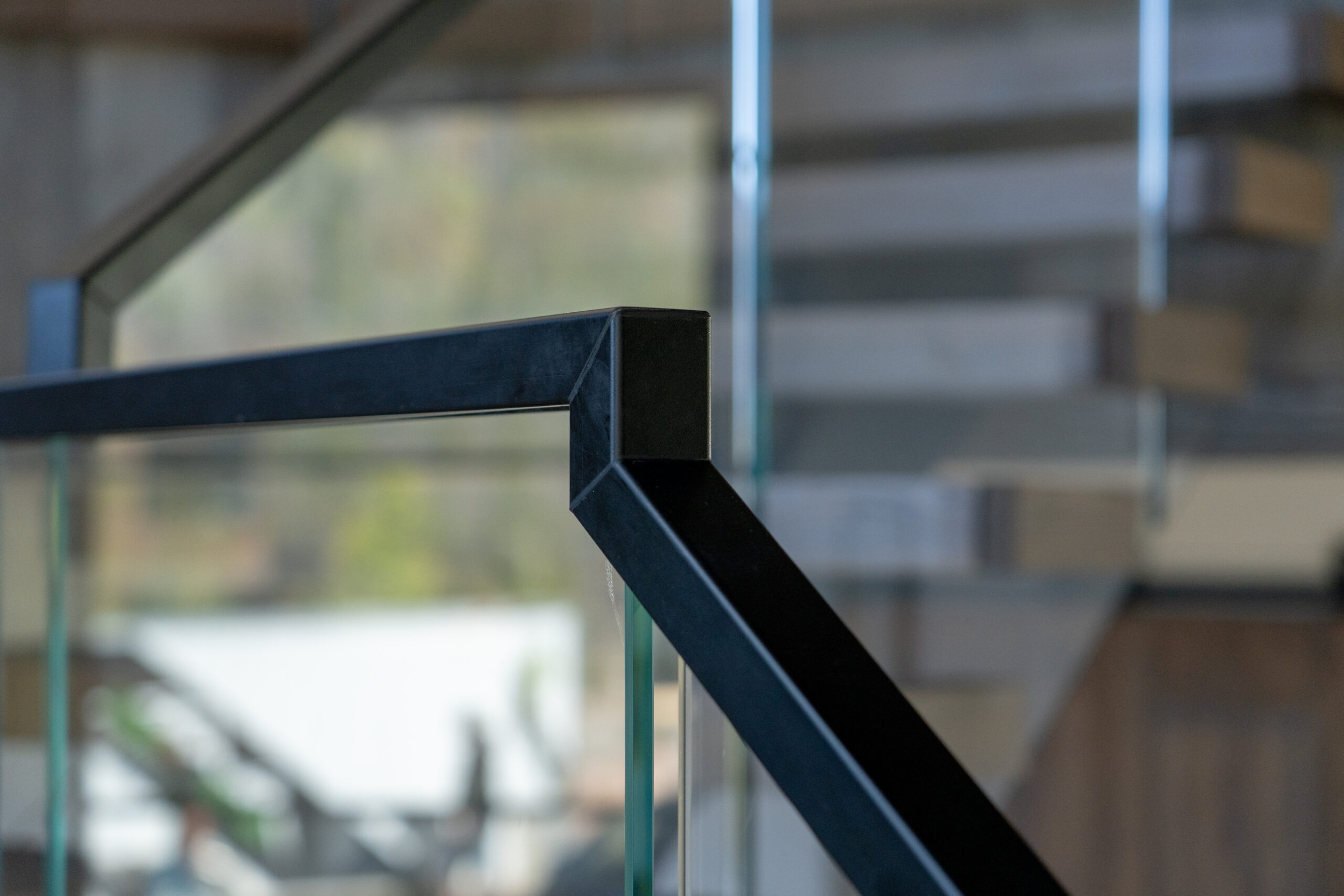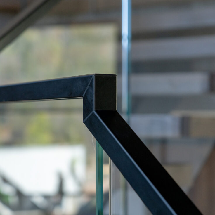 This customer decided to fabricate their own staircase, then came to us for a custom glass railing to match. This minimalistic system is framed with black top cap that cascades down the sides of the railing for a modern touch.
