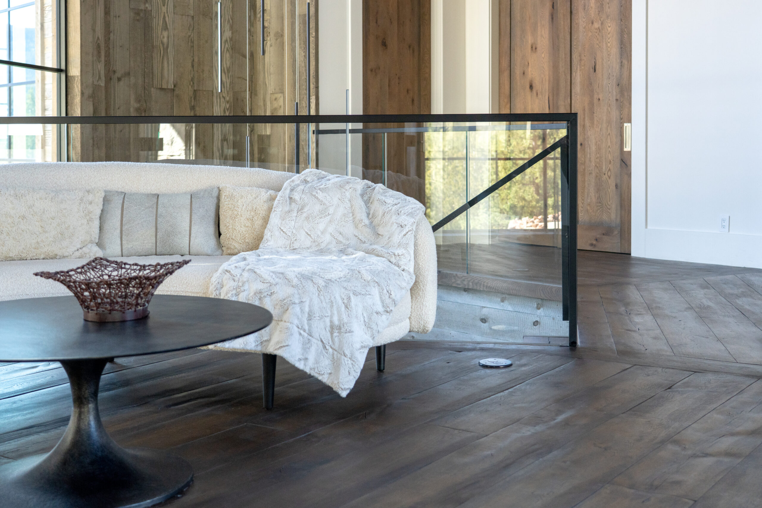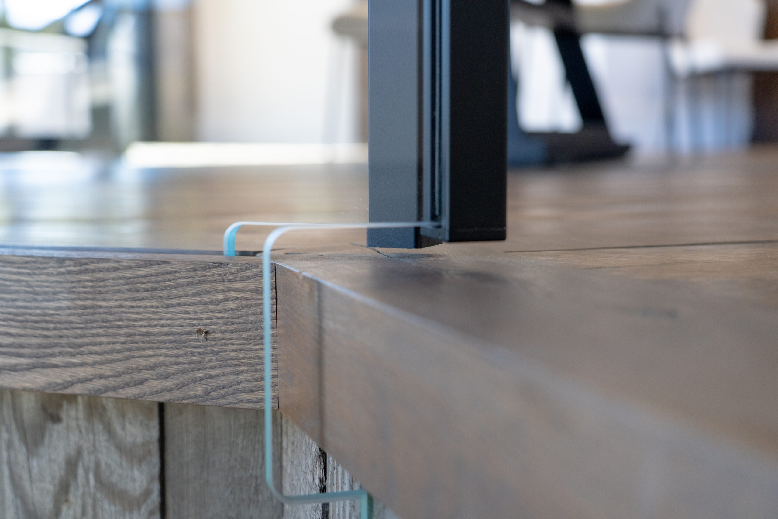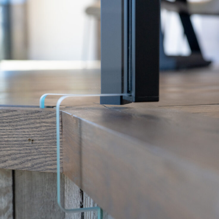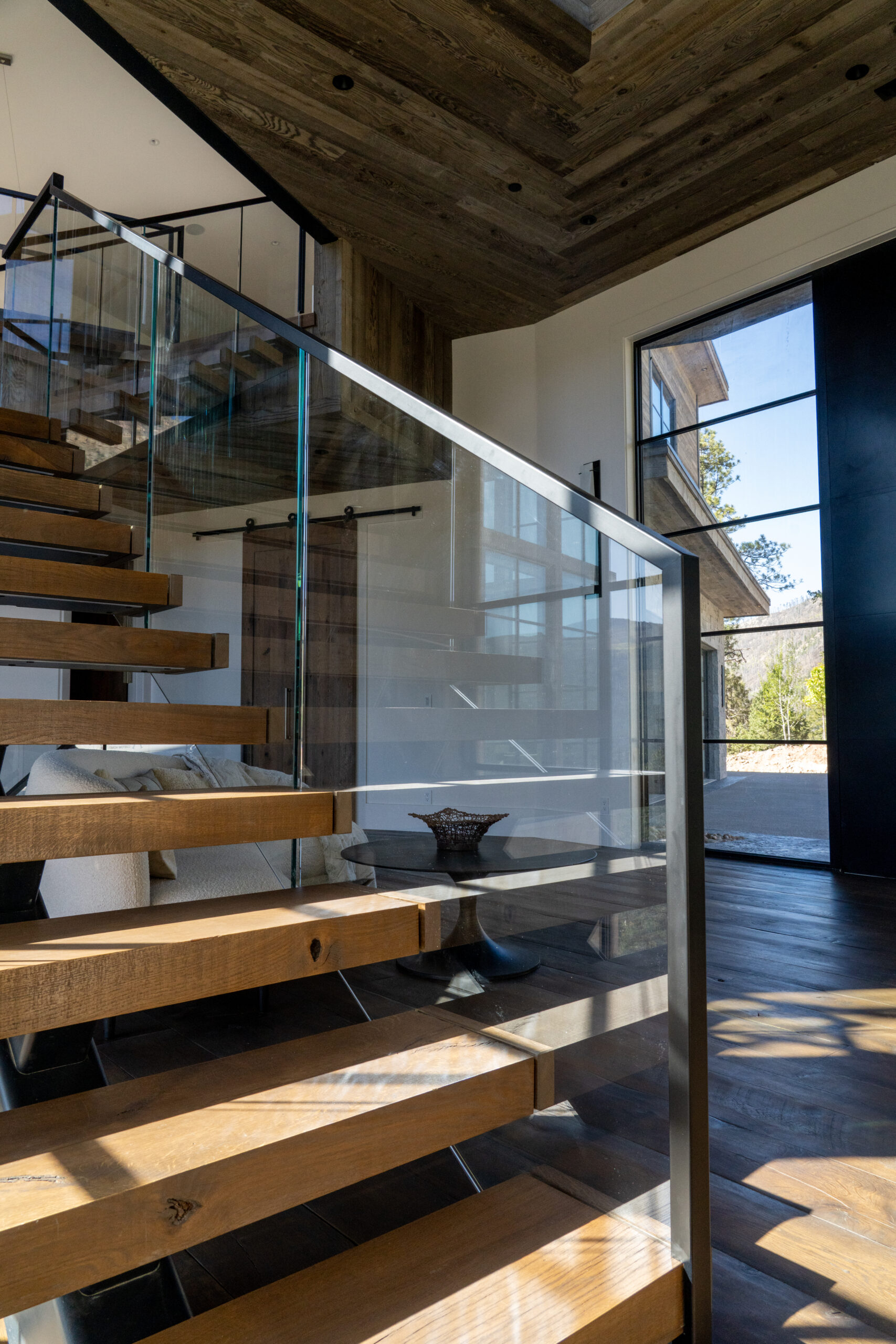 This customer decided to fabricate their own staircase, then came to us for a custom glass railing to match. This minimalistic system is framed with black top cap that cascades down the sides of the railing for a modern touch.