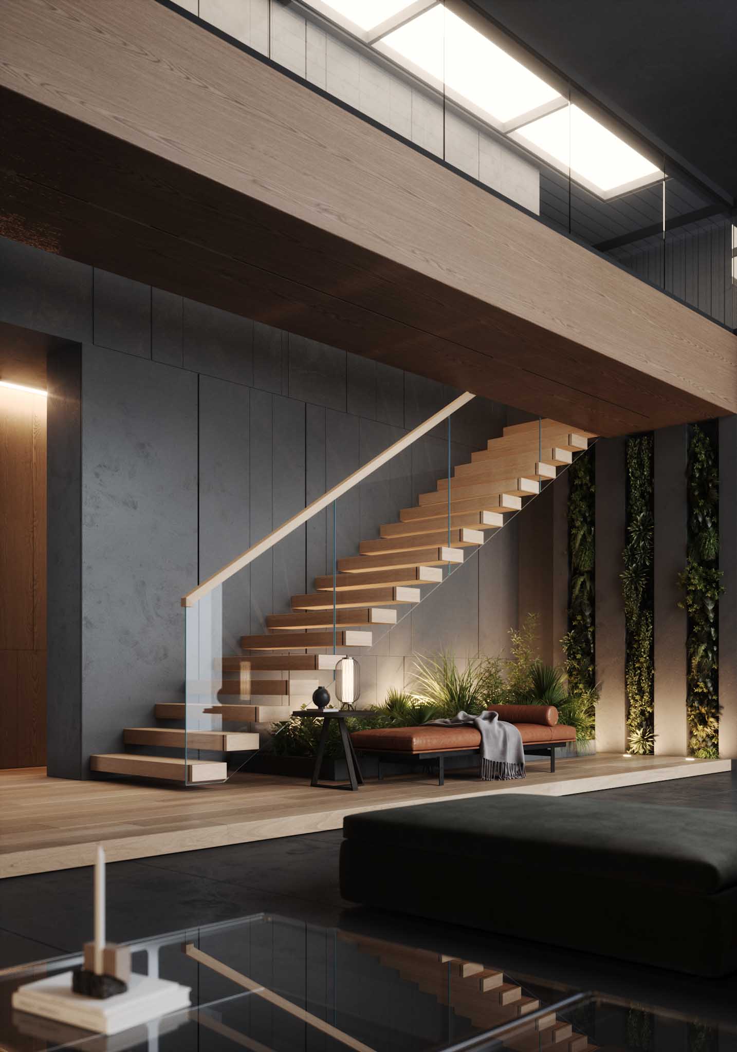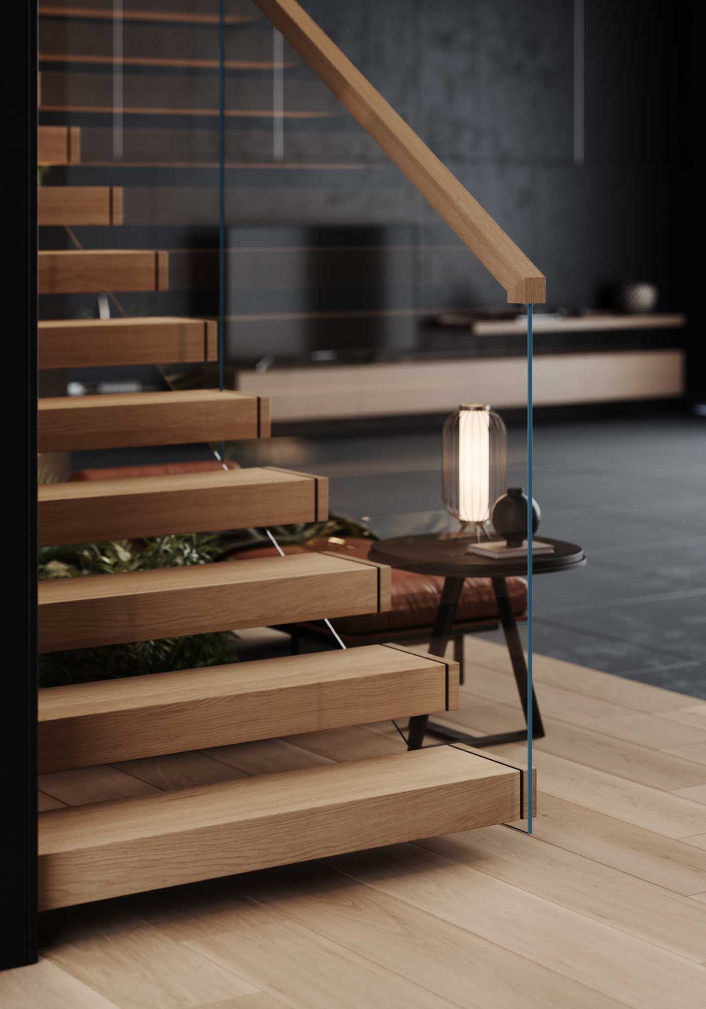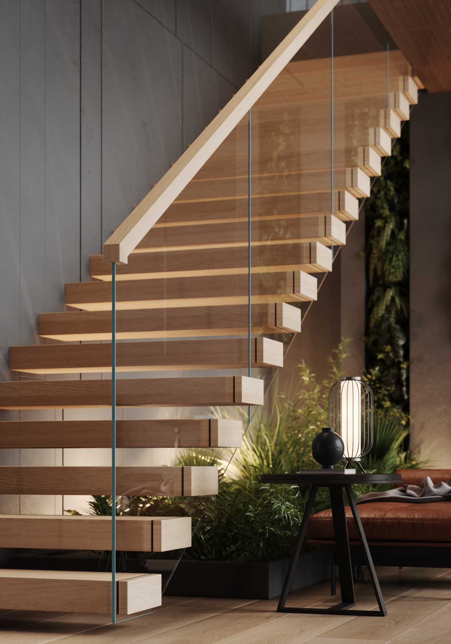 Products: FLIGHT Floating Stairs, FLIGHT Cantilever, Glass Railing, 3″ Thick Stair Treads, 6008 Square Wood Cap Rail