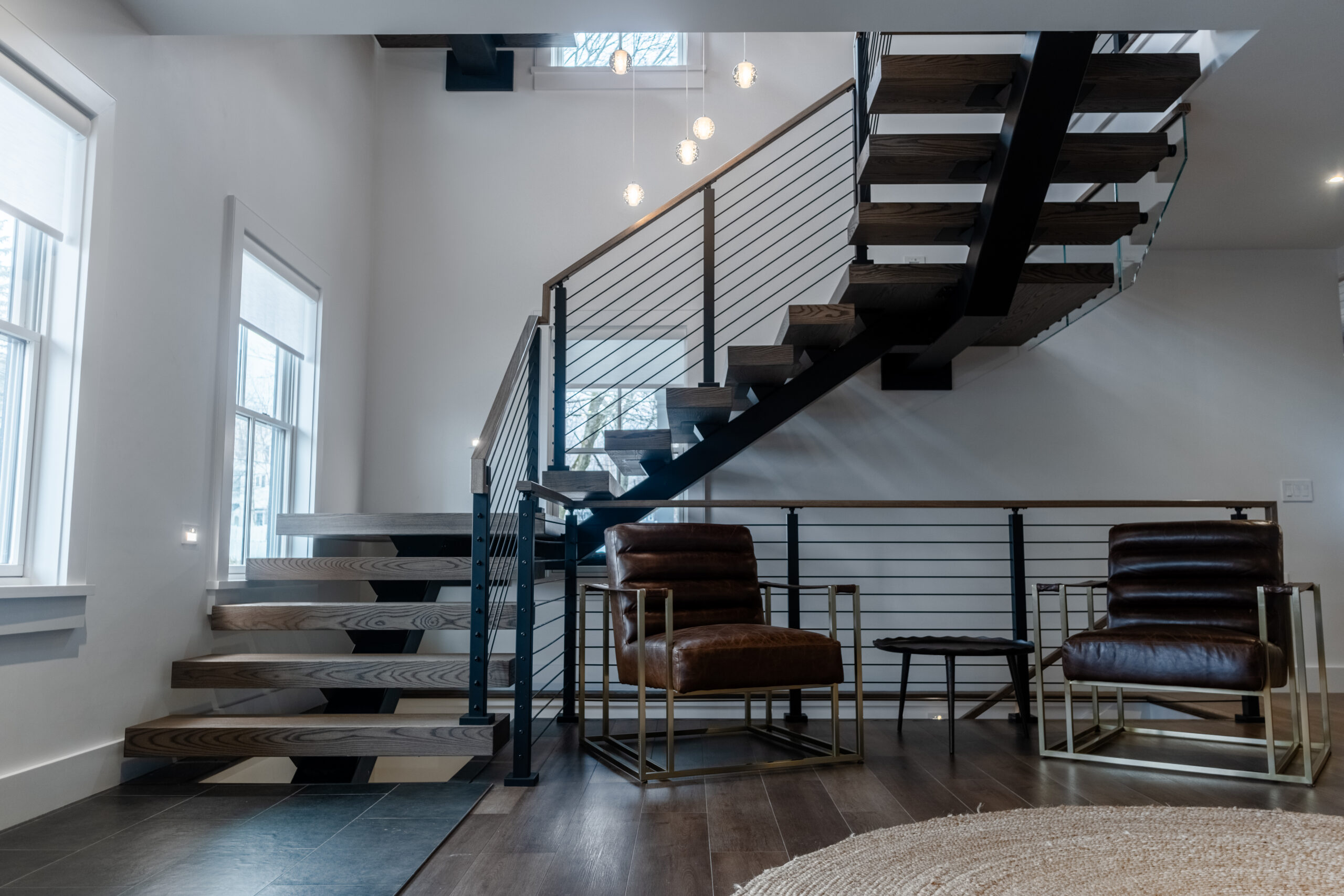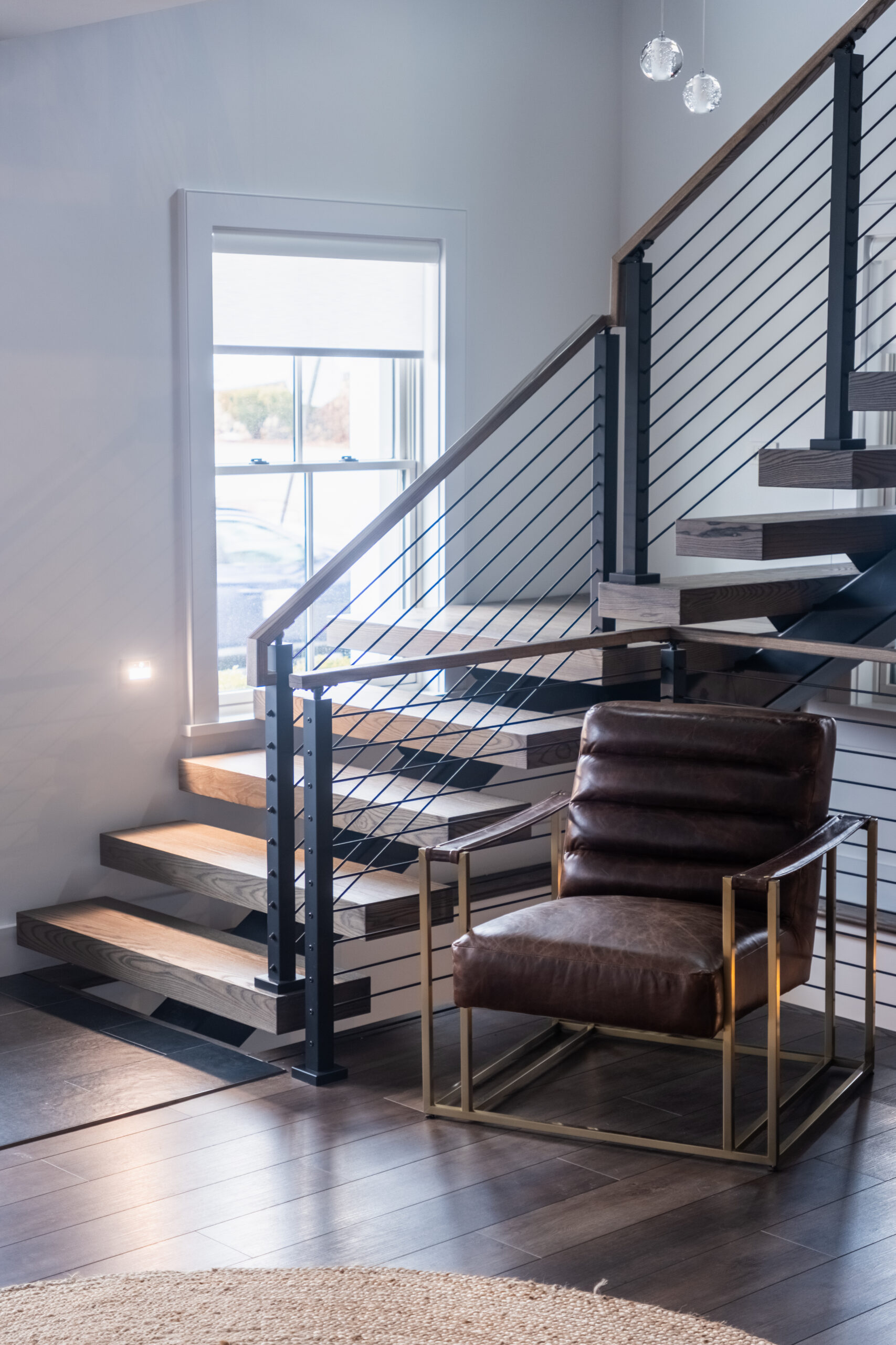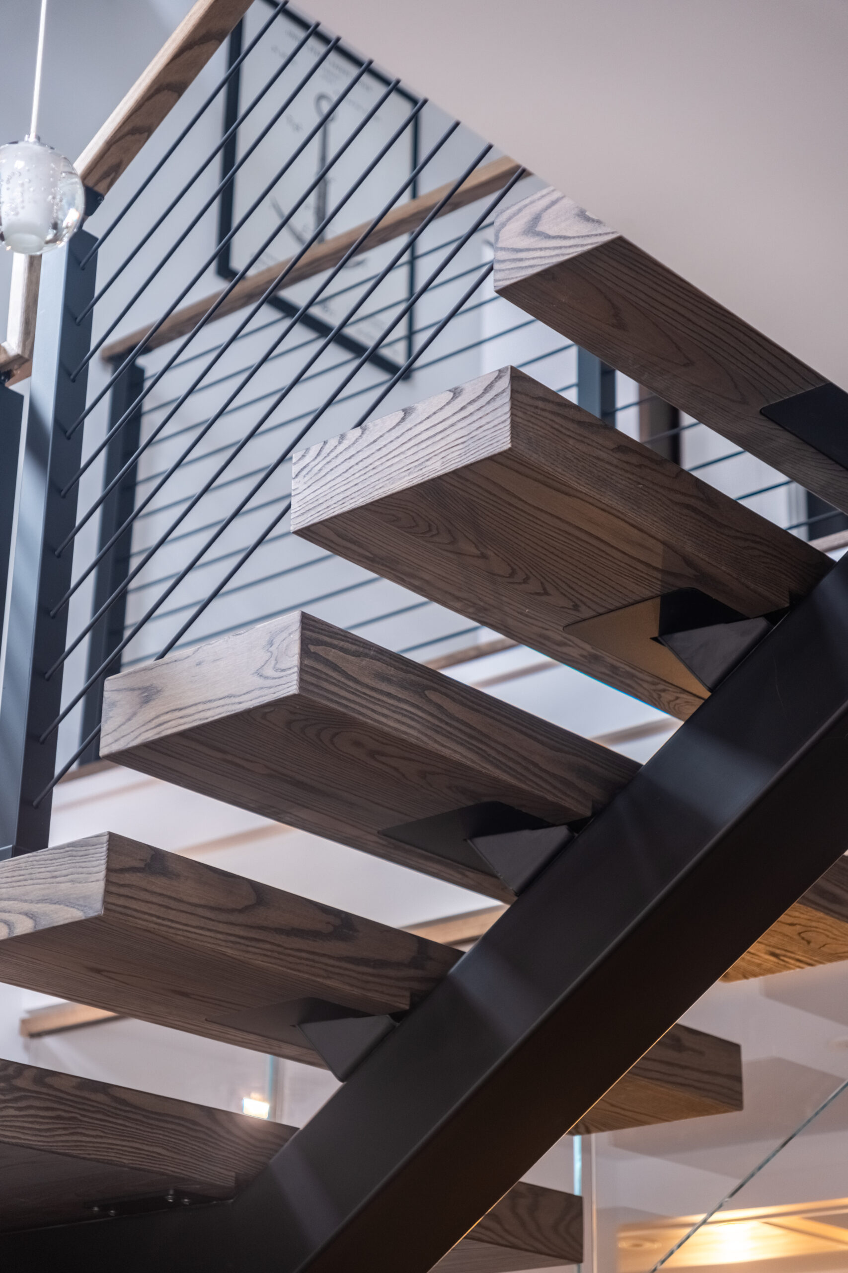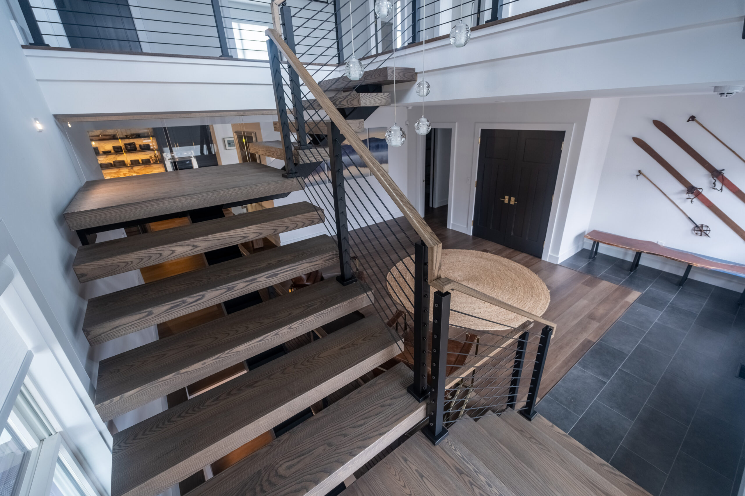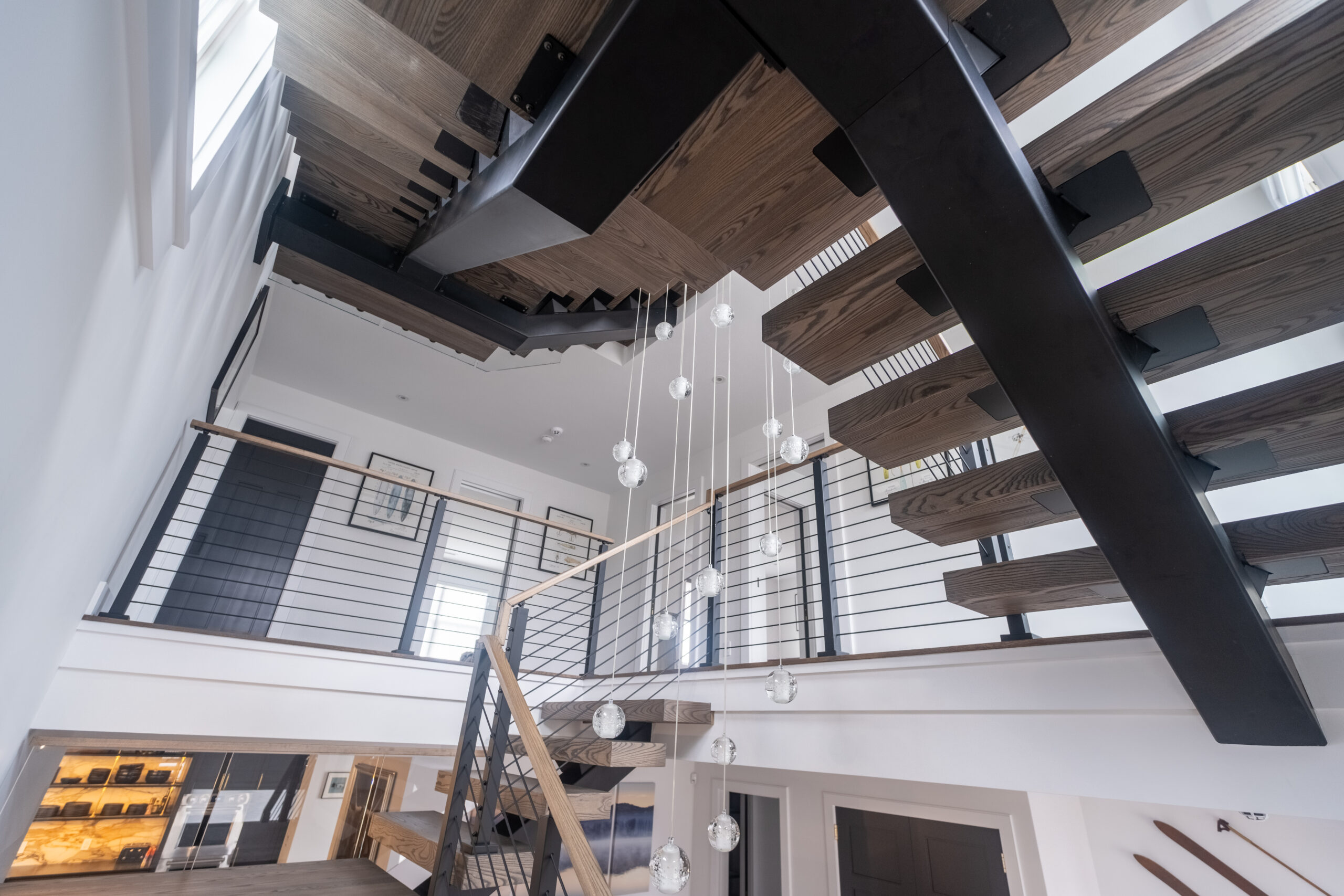 Just a stone’s throw from Lake Winnipesaukee, this home makes a bold statement with a one-of-a-kind U-Shaped FLIGHT Mono system. The rich tones of the Slate finish on the Ash Treads and handrail compliment the Onyx Rod Railing system. The continuous, uninterrupted handrail and ceiling termination for a small glass section mid-platform showcase Sleeping Dog Properties’ thoughtful design and incredible attention to detail.