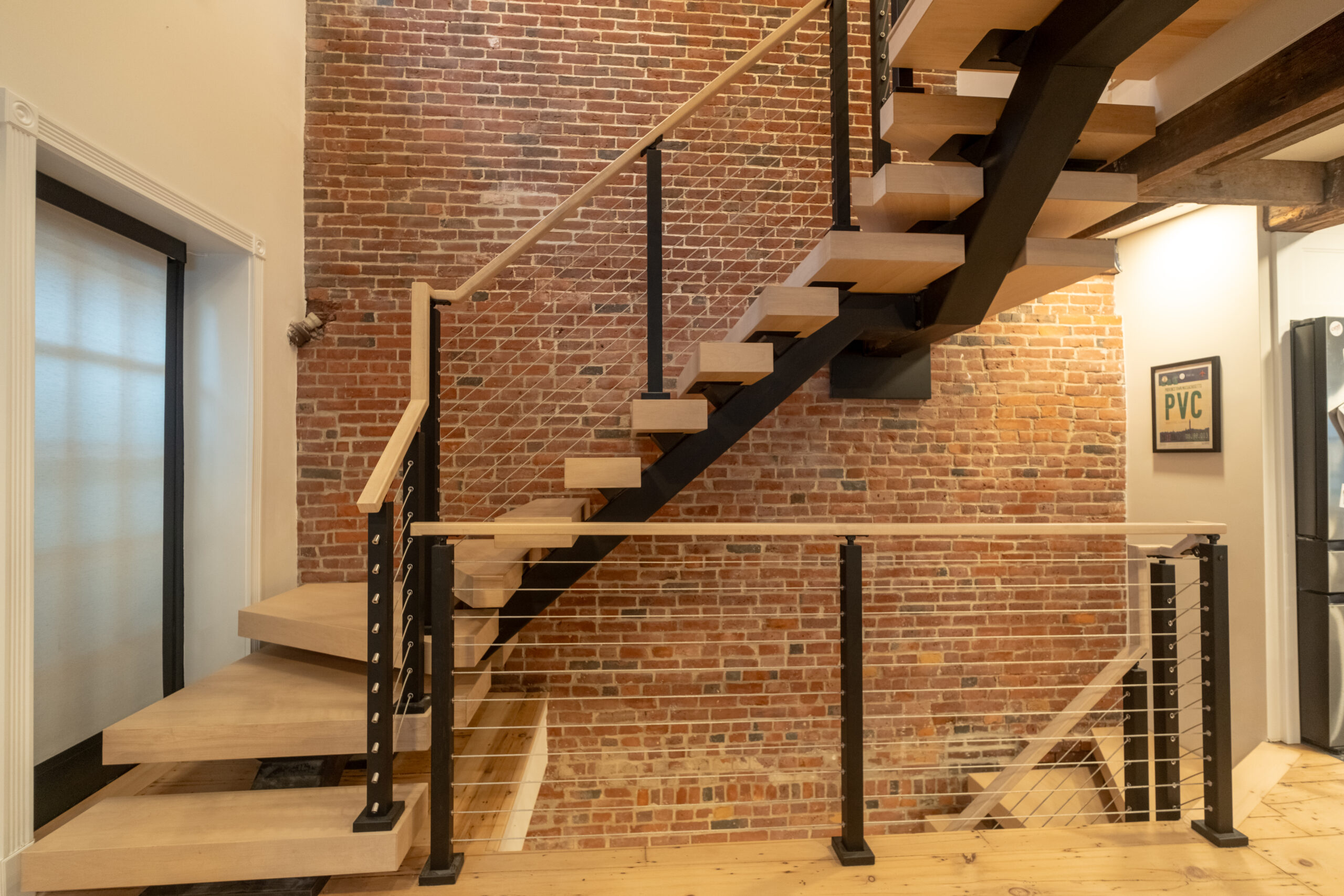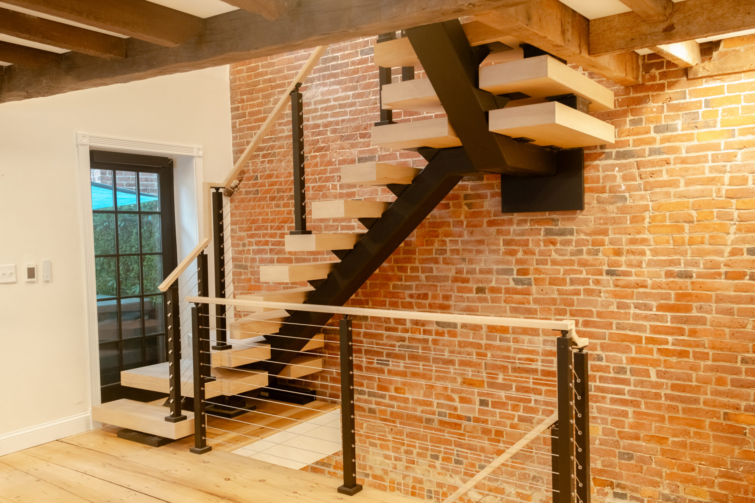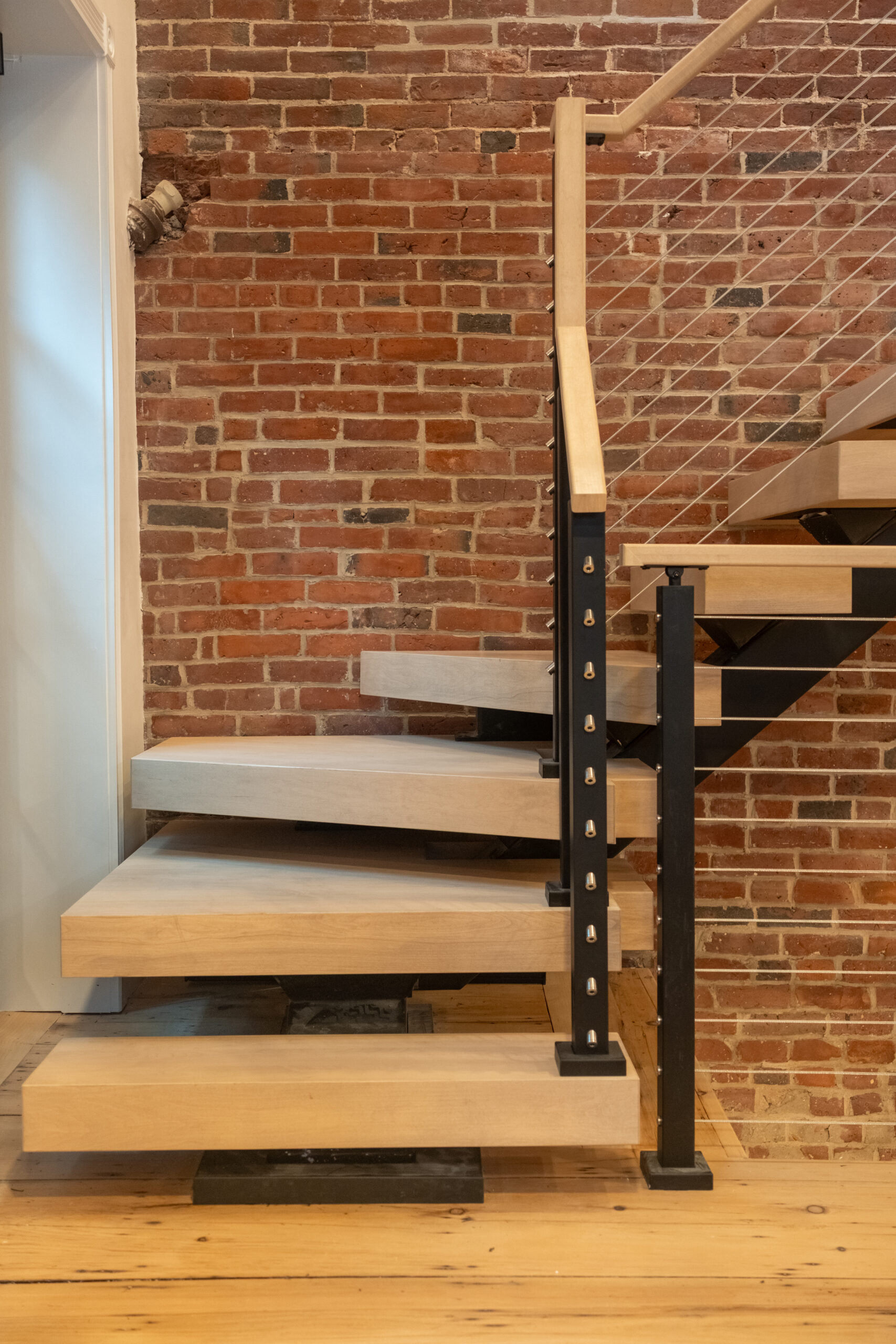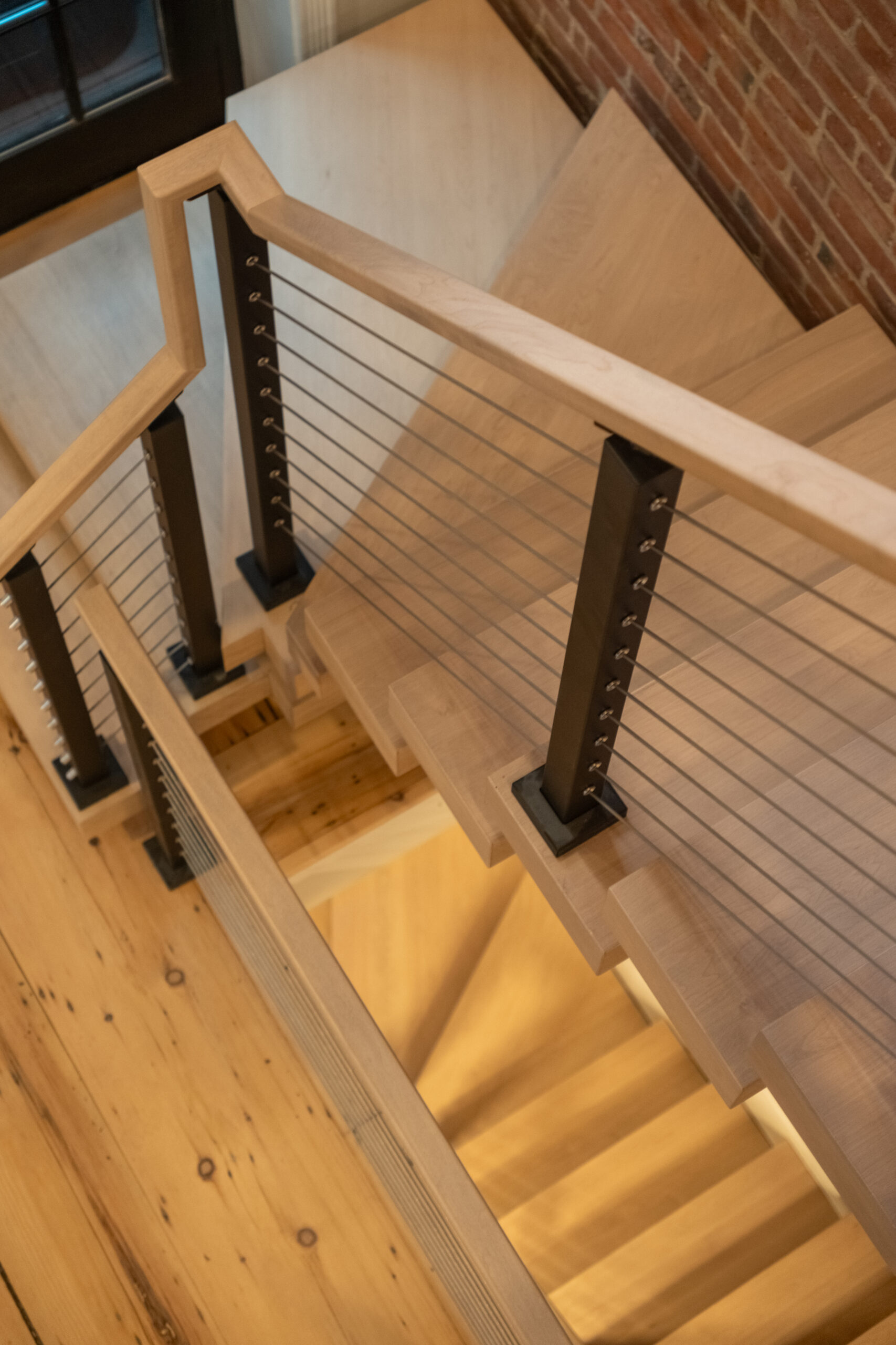 Tucked away from the downtown bustle and off a cobblestone lane, this Boston townhouse remodel pairs historic character with modern design. A statement FLIGHT Mono staircase features custom Hard Maple winder treads, maximizing the entry footprint without compromising style. Sleek cable railing with black powder-coated posts stand in contrast to the warm brick backdrop, softened by matching Hard Maple treads and handrail.