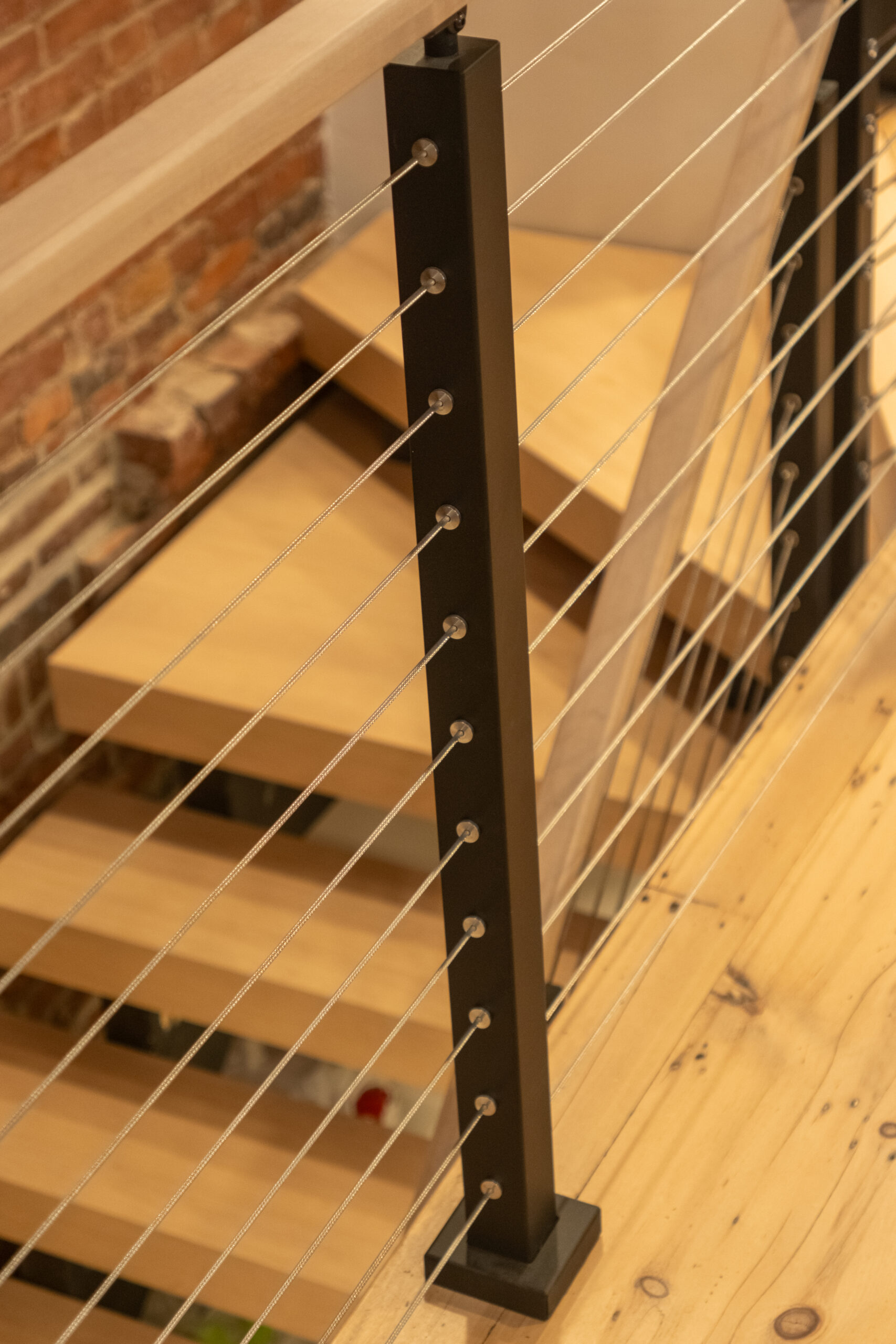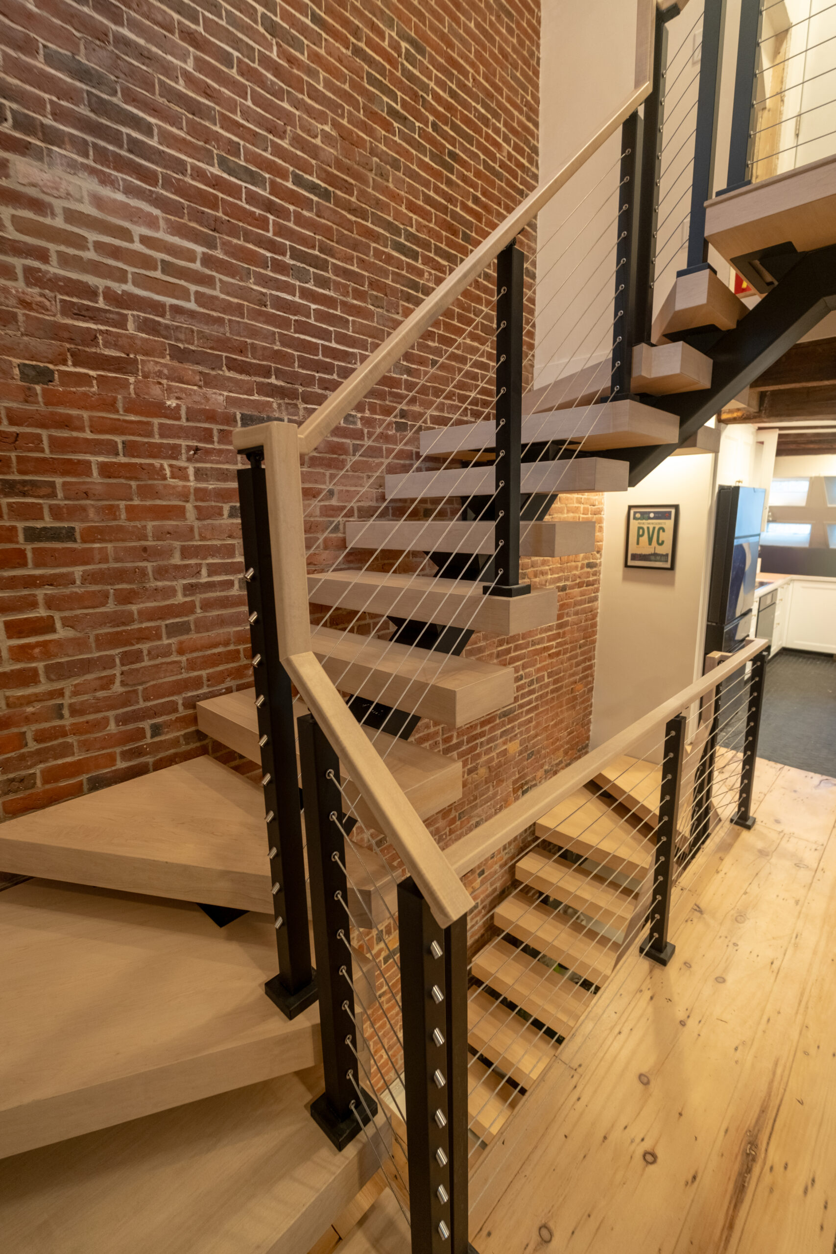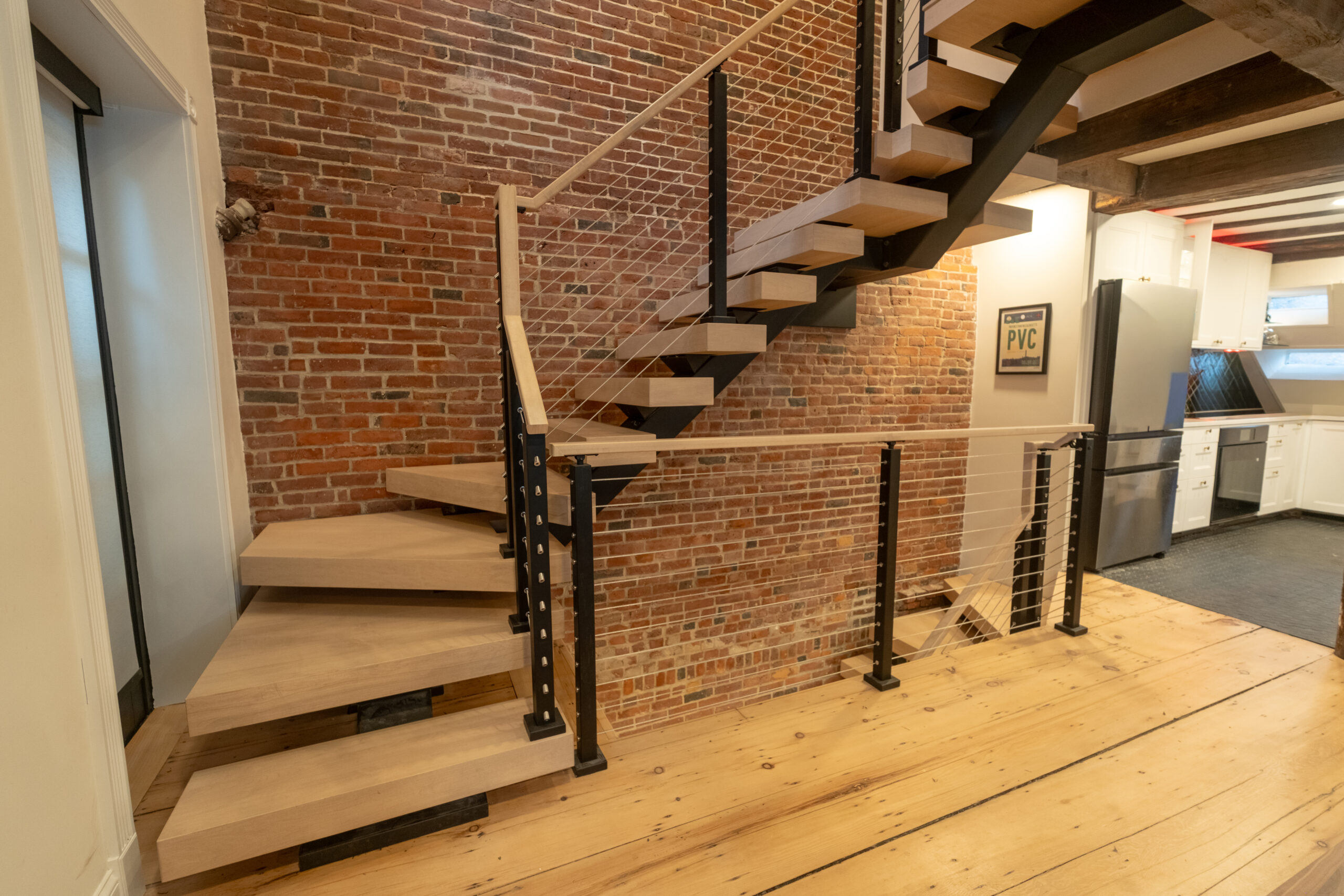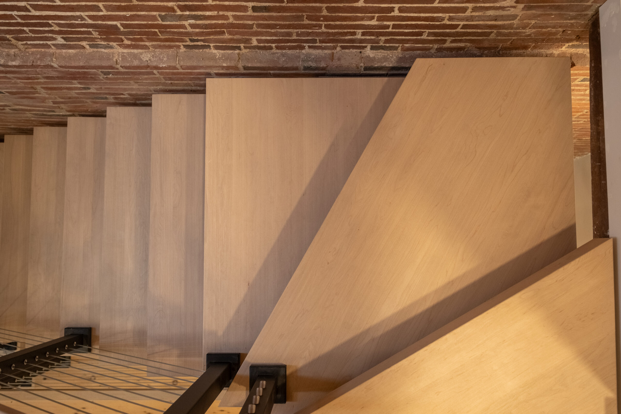 Tucked away from the downtown bustle and off a cobblestone lane, this Boston townhouse remodel pairs historic character with modern design. A statement FLIGHT Mono staircase features custom Hard Maple winder treads, maximizing the entry footprint without compromising style. Sleek cable railing with black powder-coated posts stand in contrast to the warm brick backdrop, softened by matching Hard Maple treads and handrail.