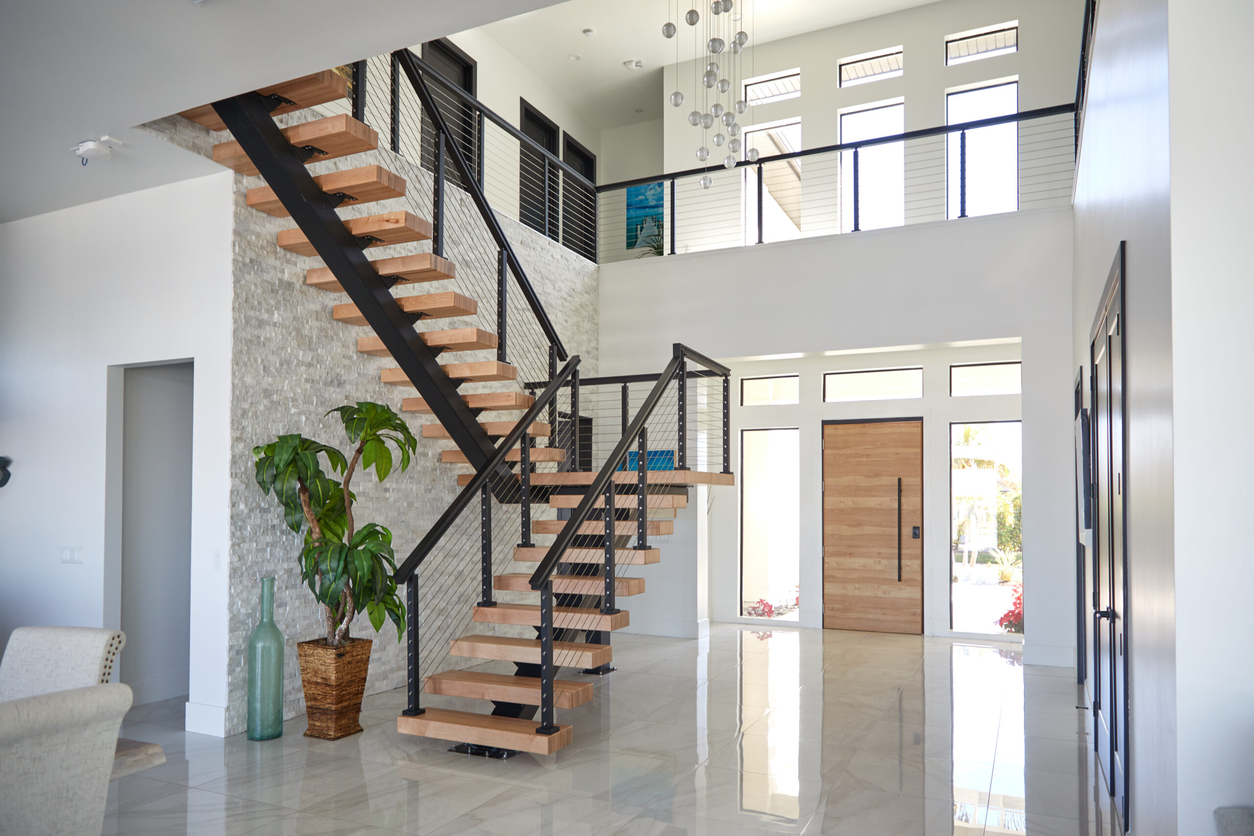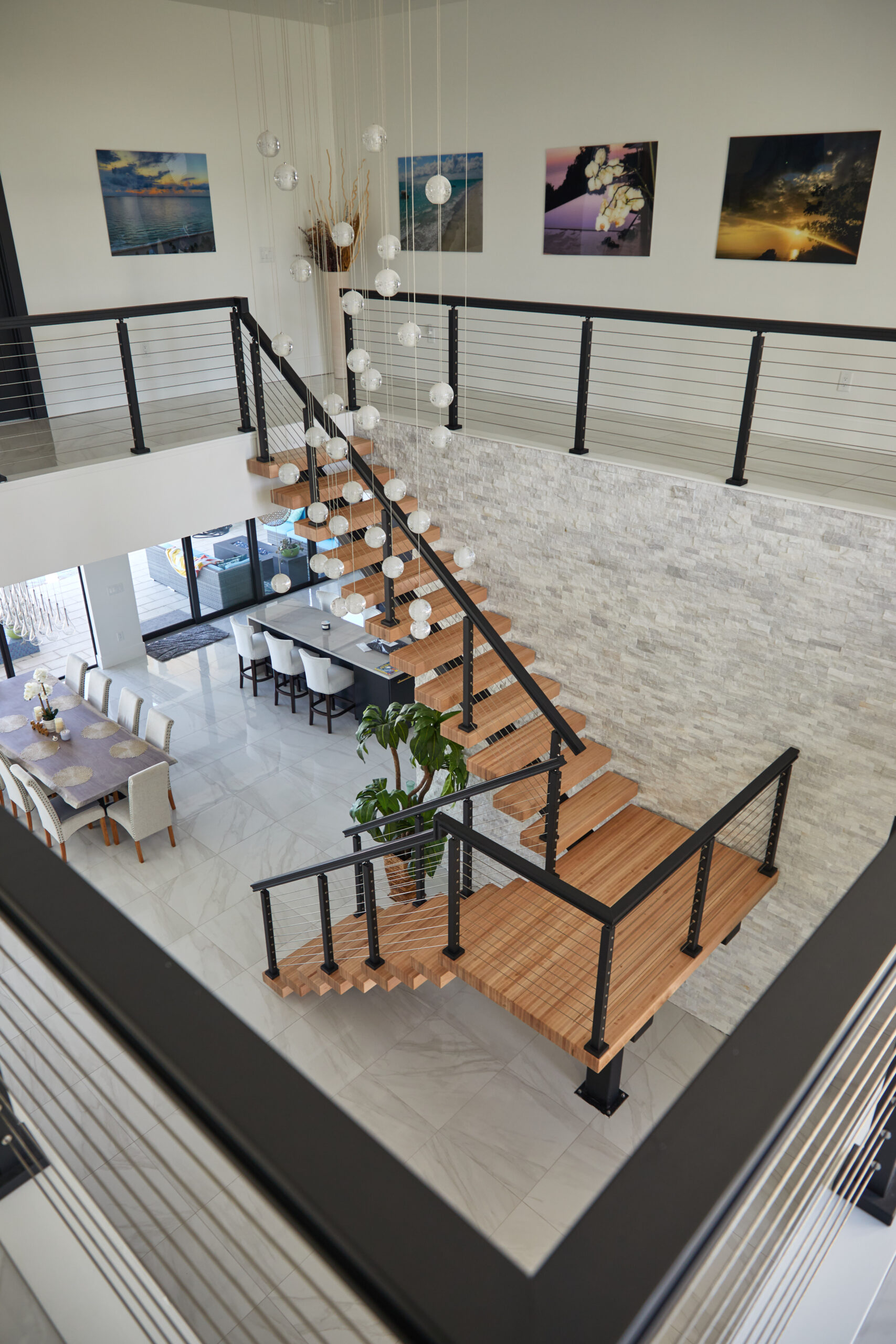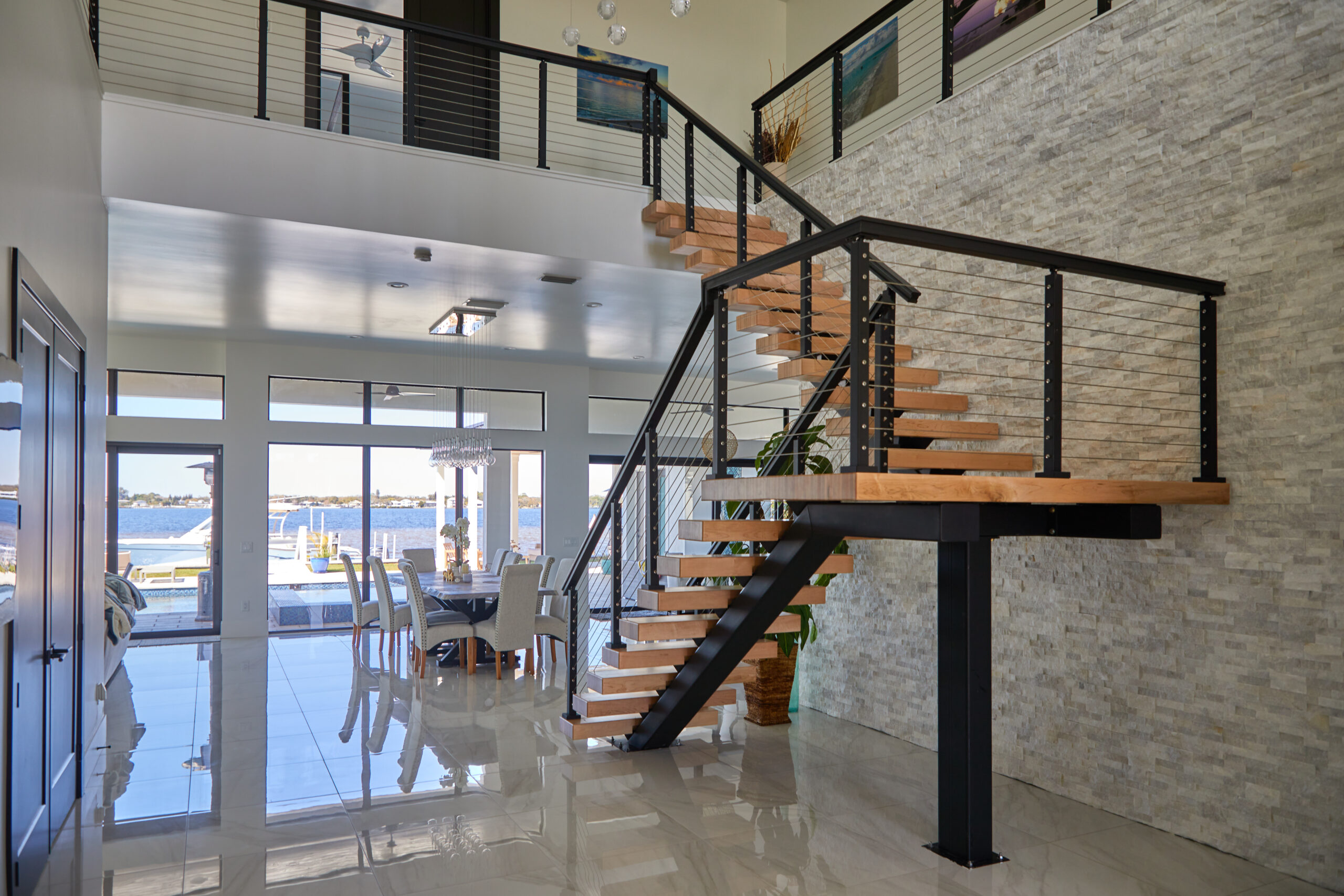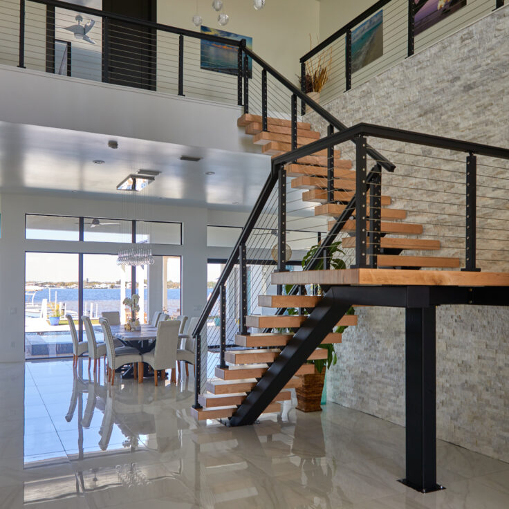 This gorgeous Gulf Coast home pulls together the finest aspects of Florida living. With idyllic bayfront views, the walls of glass pull light into every inch of the house, showcasing the luxurious finishes of this custom home. From the entryway to the breezeway, the home’s main focal point is the stairs.