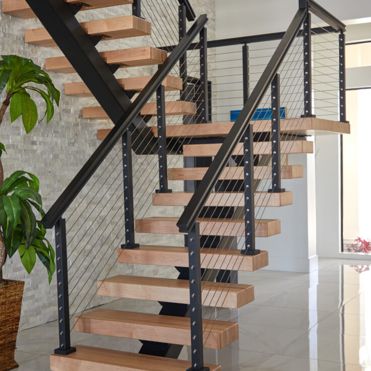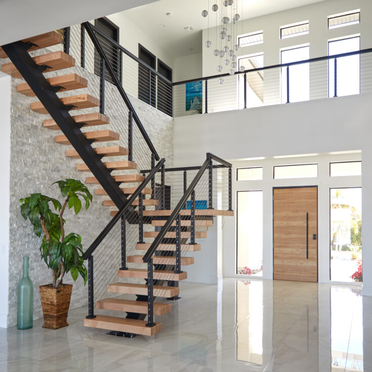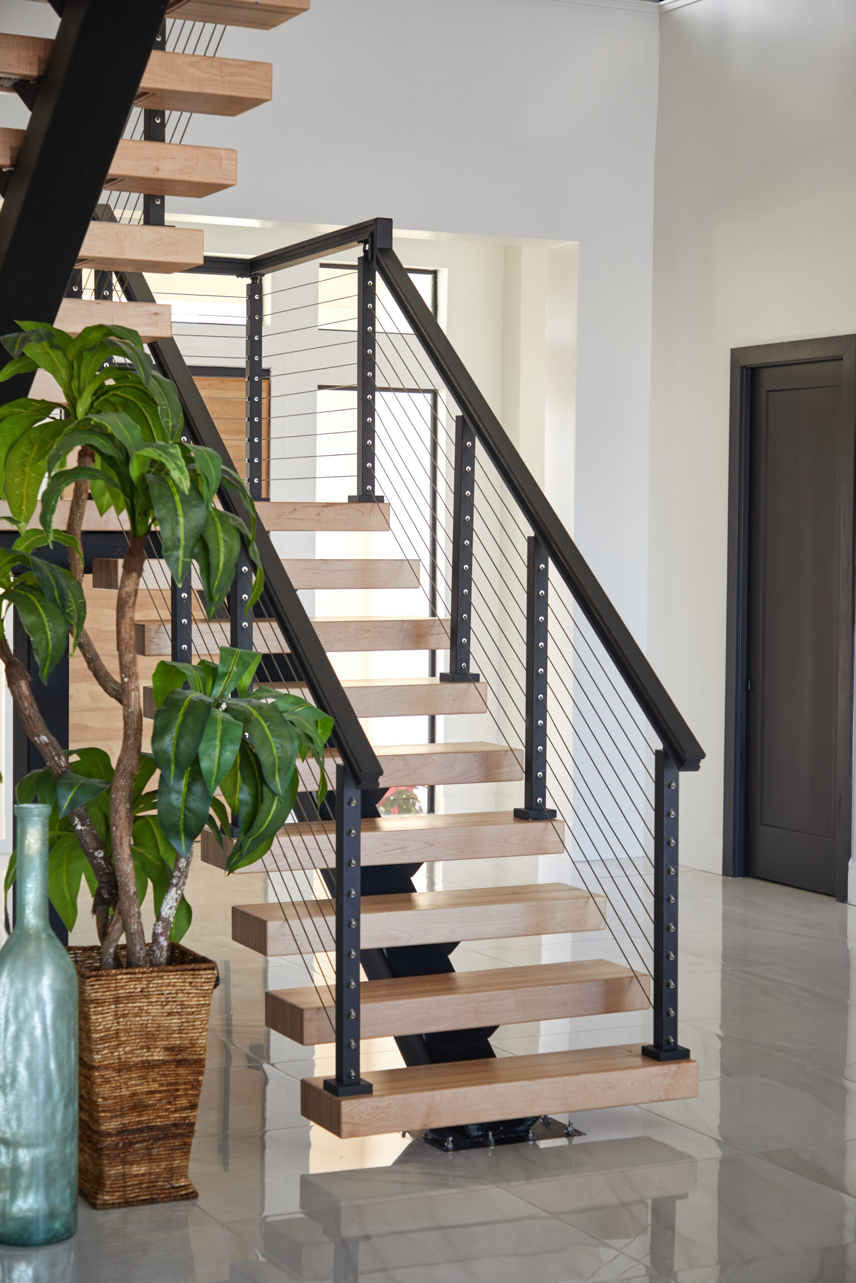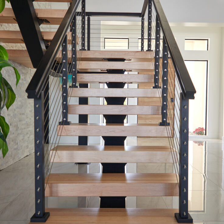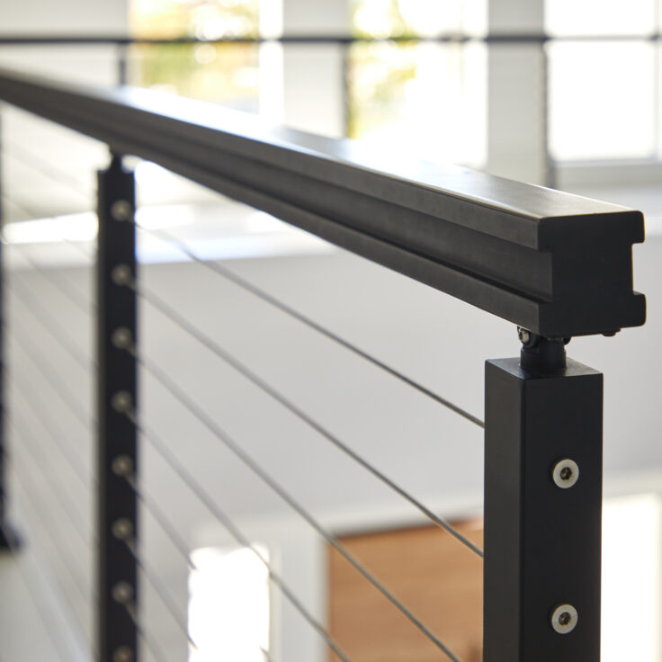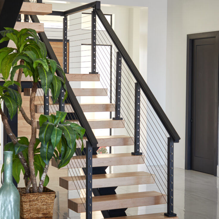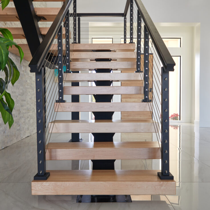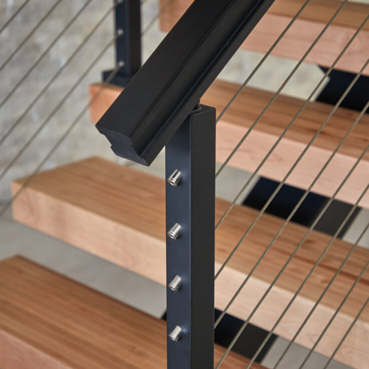 The Switchback design maintains a compact footprint while giving creative functionality to the home. With the majority of activity taking place in the back of the first floor, it only made sense for the stairway to open into the dining area. The intricate wood patterns within these custom butcher block maple treads provide a warm and vibrant look. By combining the soft grays of the stone and marble with the matte black metal posts and ebony handrail, the materials create a captivating contrast in the entryway. The stainless steel cable railing runs provide strength for this structure without sacrificing the view.