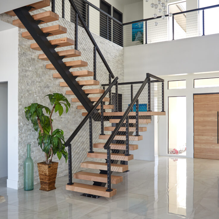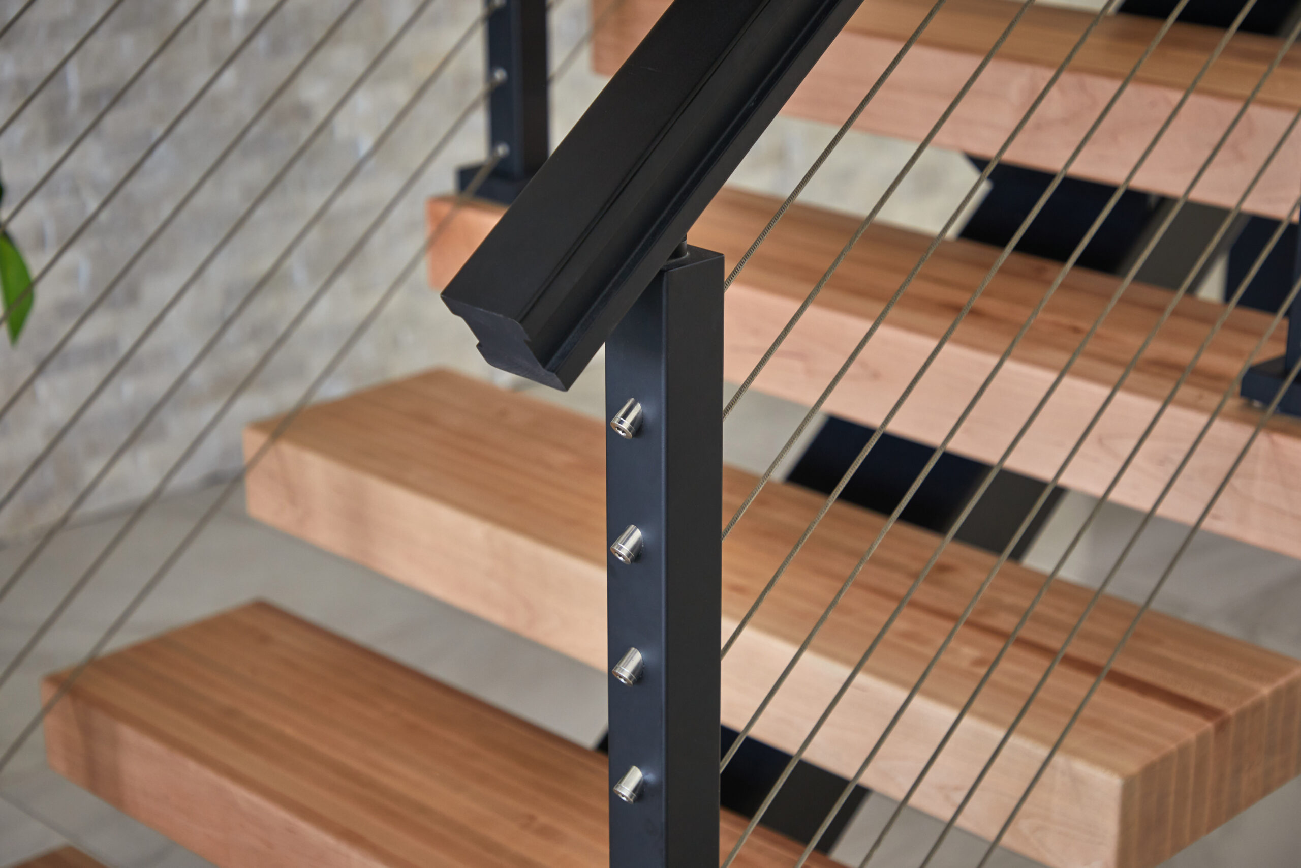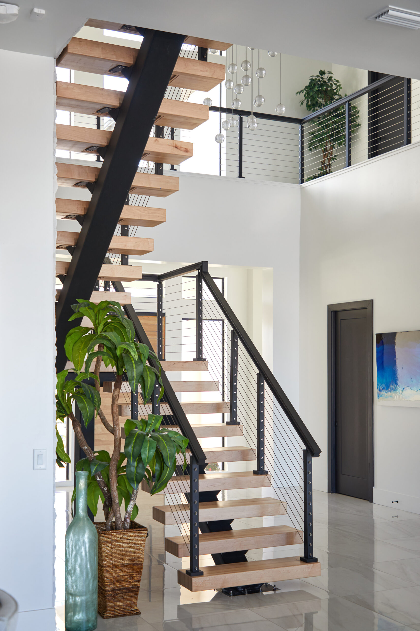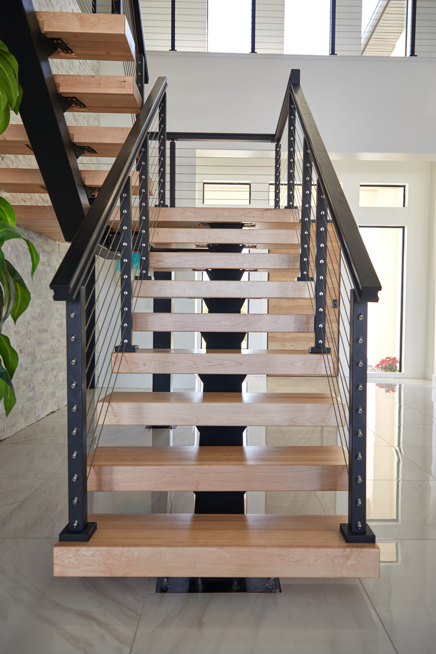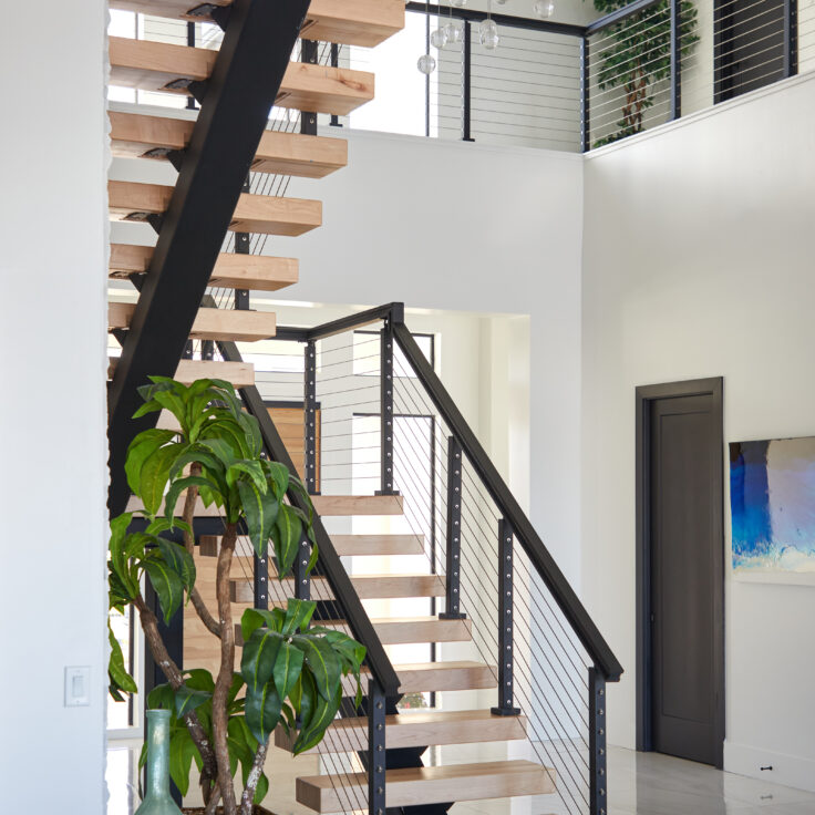 The Switchback design maintains a compact footprint while giving creative functionality to the home. With the majority of activity taking place in the back of the first floor, it only made sense for the stairway to open into the dining area. The intricate wood patterns within these custom butcher block maple treads provide a warm and vibrant look. By combining the soft grays of the stone and marble with the matte black metal posts and ebony handrail, the materials create a captivating contrast in the entryway. The stainless steel cable railing runs provide strength for this structure without sacrificing the view.