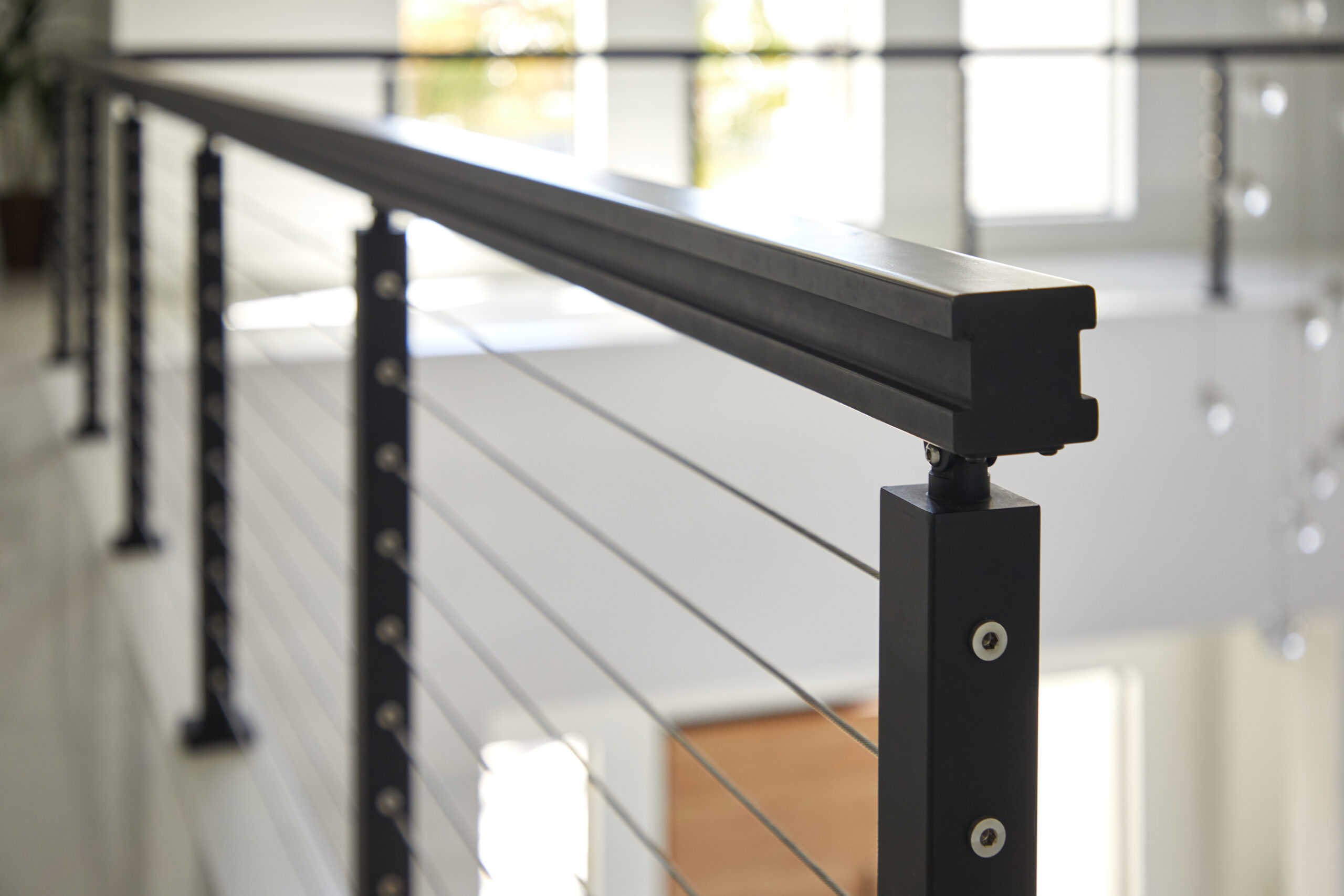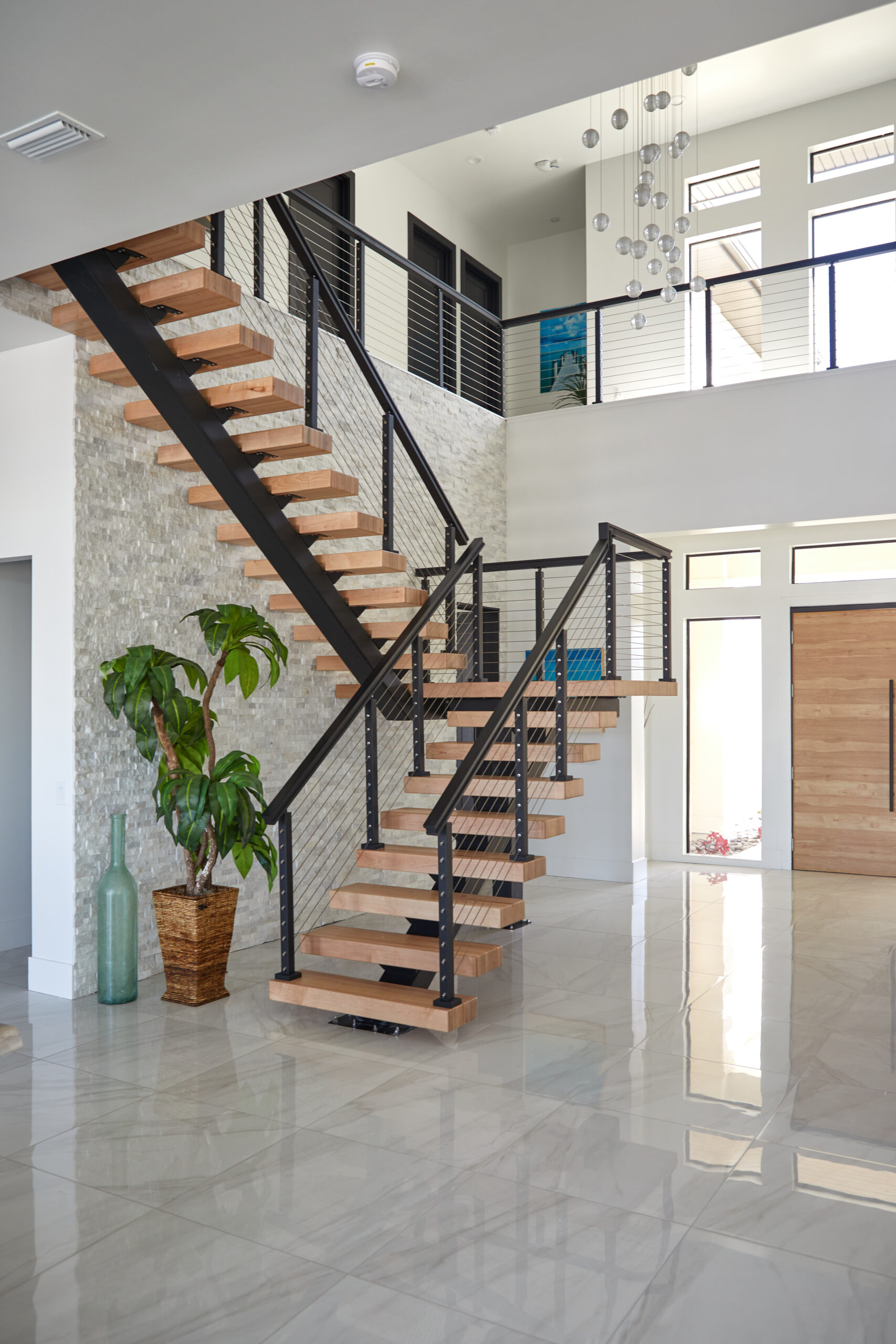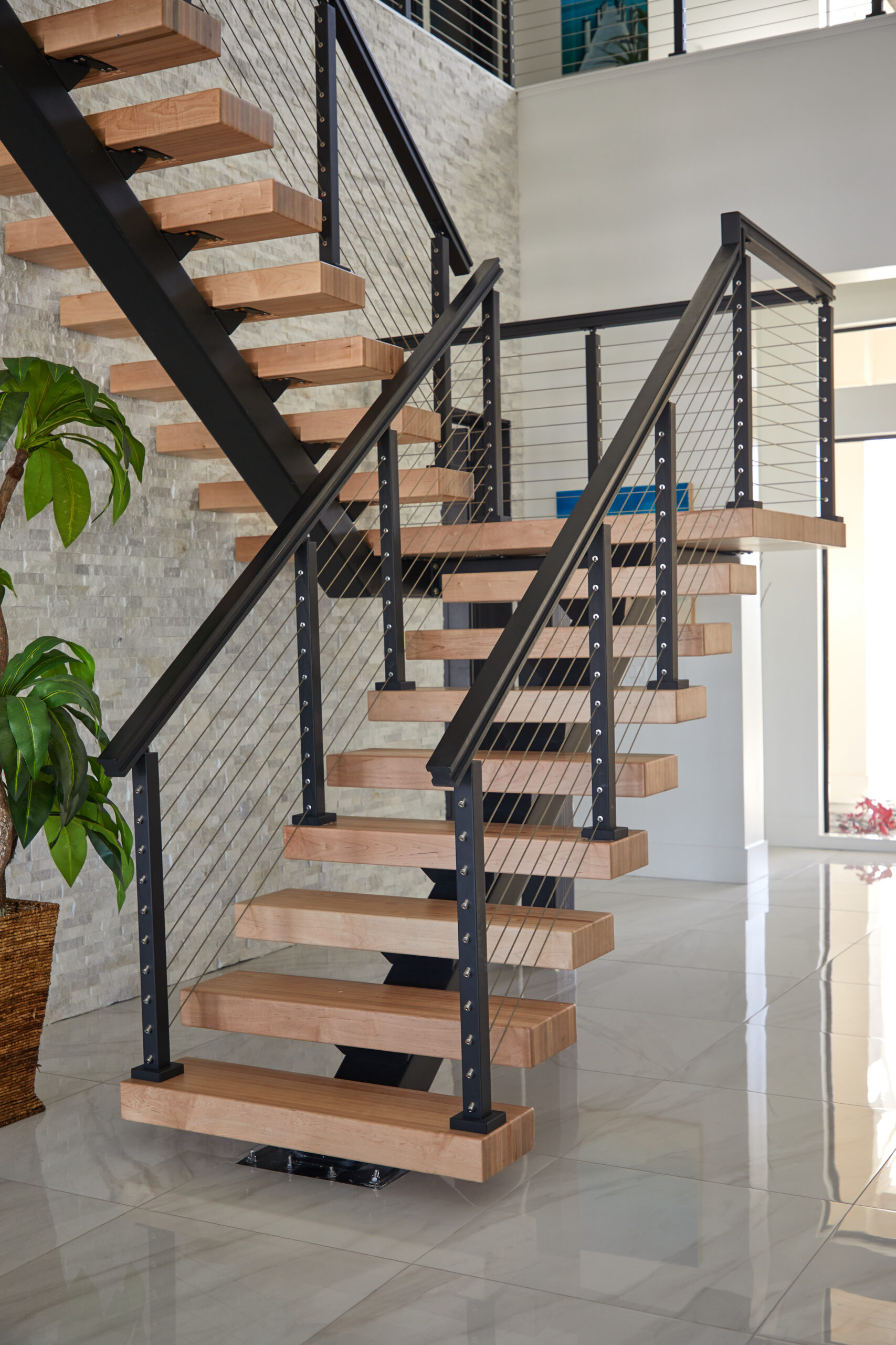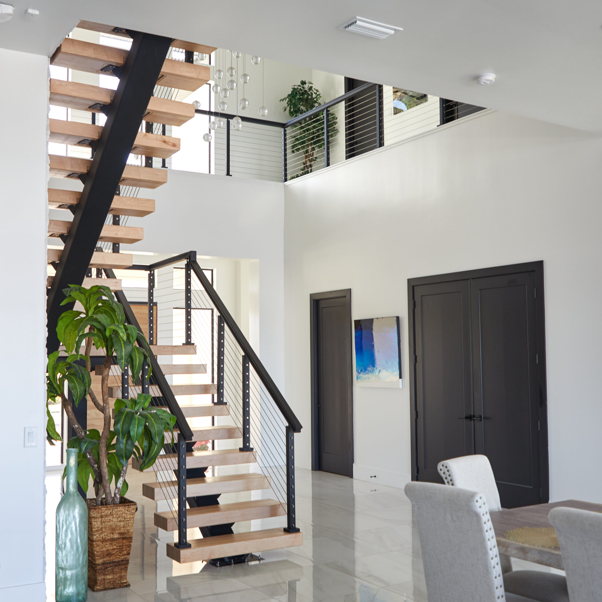 The Switchback design maintains a compact footprint while giving creative functionality to the home. With the majority of activity taking place in the back of the first floor, it only made sense for the stairway to open into the dining area. The intricate wood patterns within these custom butcher block maple treads provide a warm and vibrant look. By combining the soft grays of the stone and marble with the matte black metal posts and ebony handrail, the materials create a captivating contrast in the entryway. The stainless steel cable railing runs provide strength for this structure without sacrificing the view.