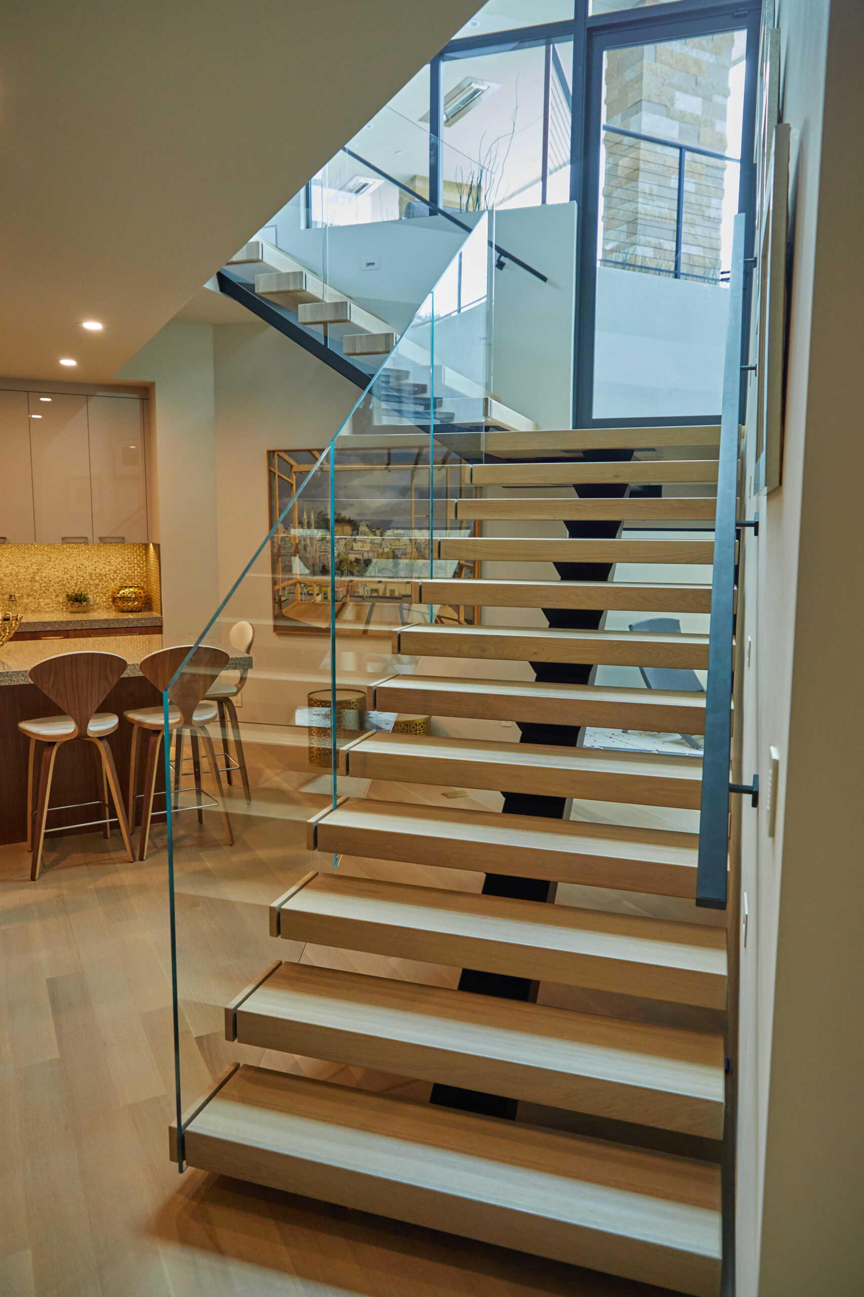 With a unique shape and small space for a staircase, this modern home needed a custom built system to perfectly match the area. A FLIGHT Mono system with Vedera railing was custom engineered and manufactured to fit without obstructing the floor to ceiling windows. For both the Vedera and Base Rail glass railing, no cap rail was used on the glass, which makes for an extremely minimalistic railing. In order to pass code, a wall mounted handrail was attached to the wall, providing a sturdy support. The homeowners chose White Oak treads and stained them on site to match their flooring, tying the whole project together.
