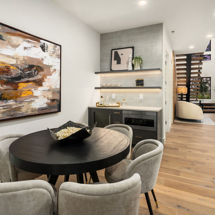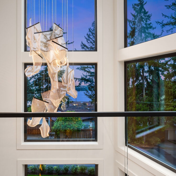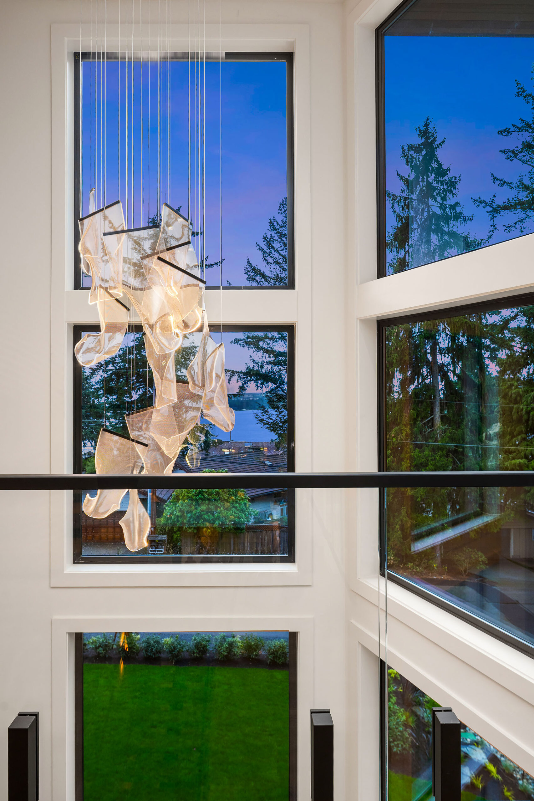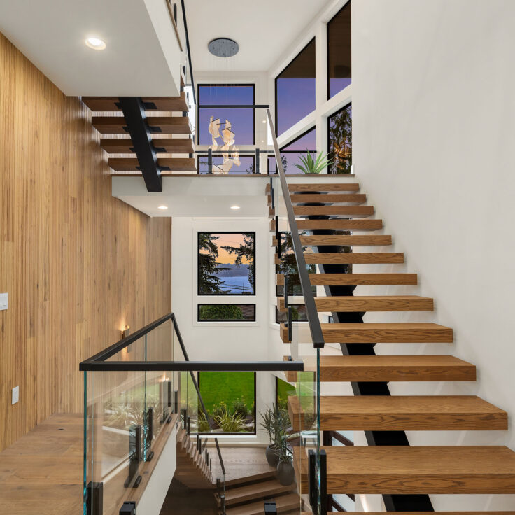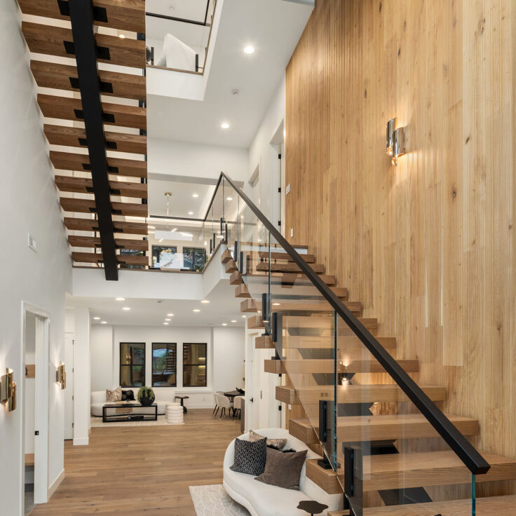 This entryway captures the essence of design with rising floating stairs and clear glass railing. FLIGHT Mono connects the multiple levels with elegance while the glass railing creates clear views between spaces.