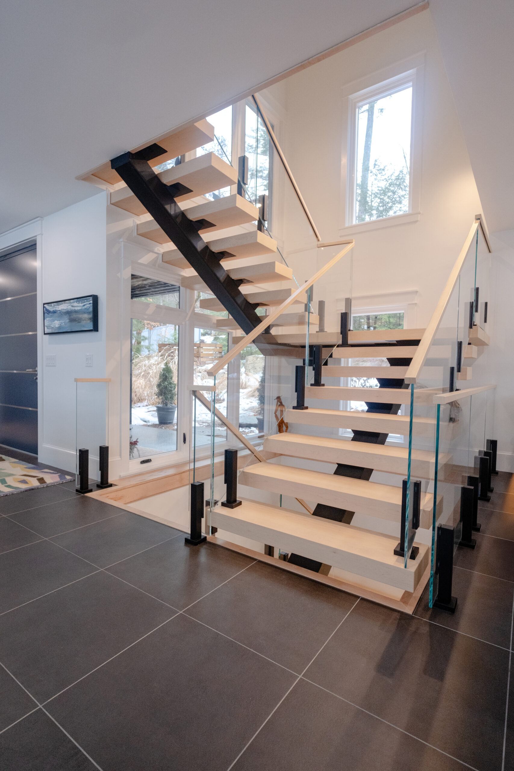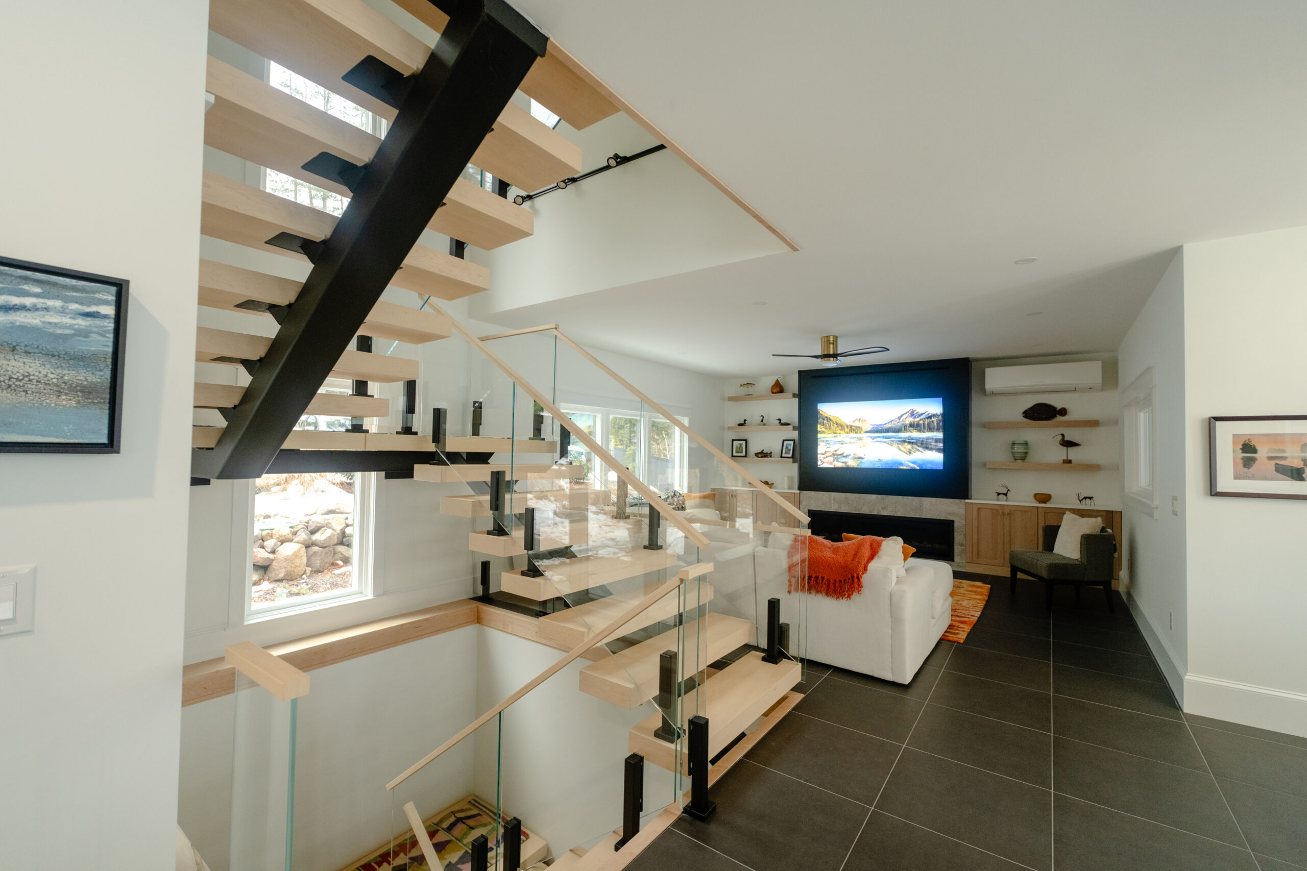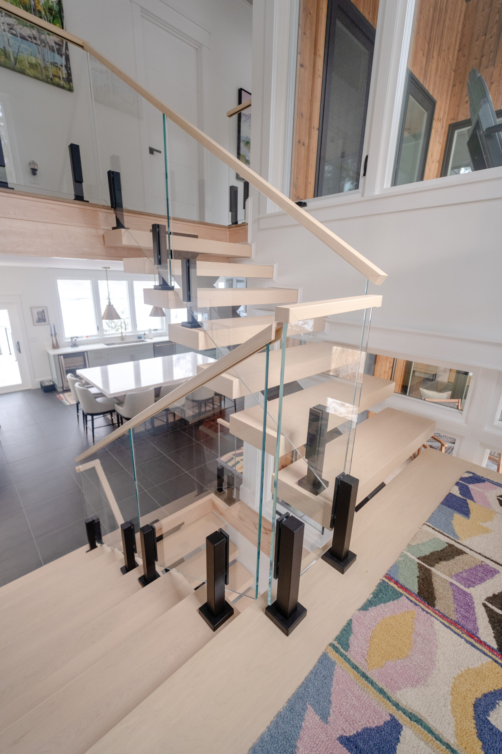 In New Durham, this lakeside new build is anchored by a dramatic double switchback FLIGHT Mono staircase with glass railing. Black powder-coated stringers and Ascend Talons add crisp definition, while Hard Maple treads and cap rail bring warmth to the space. Surrounded by generous windows, the entry feels both inviting and elevated.