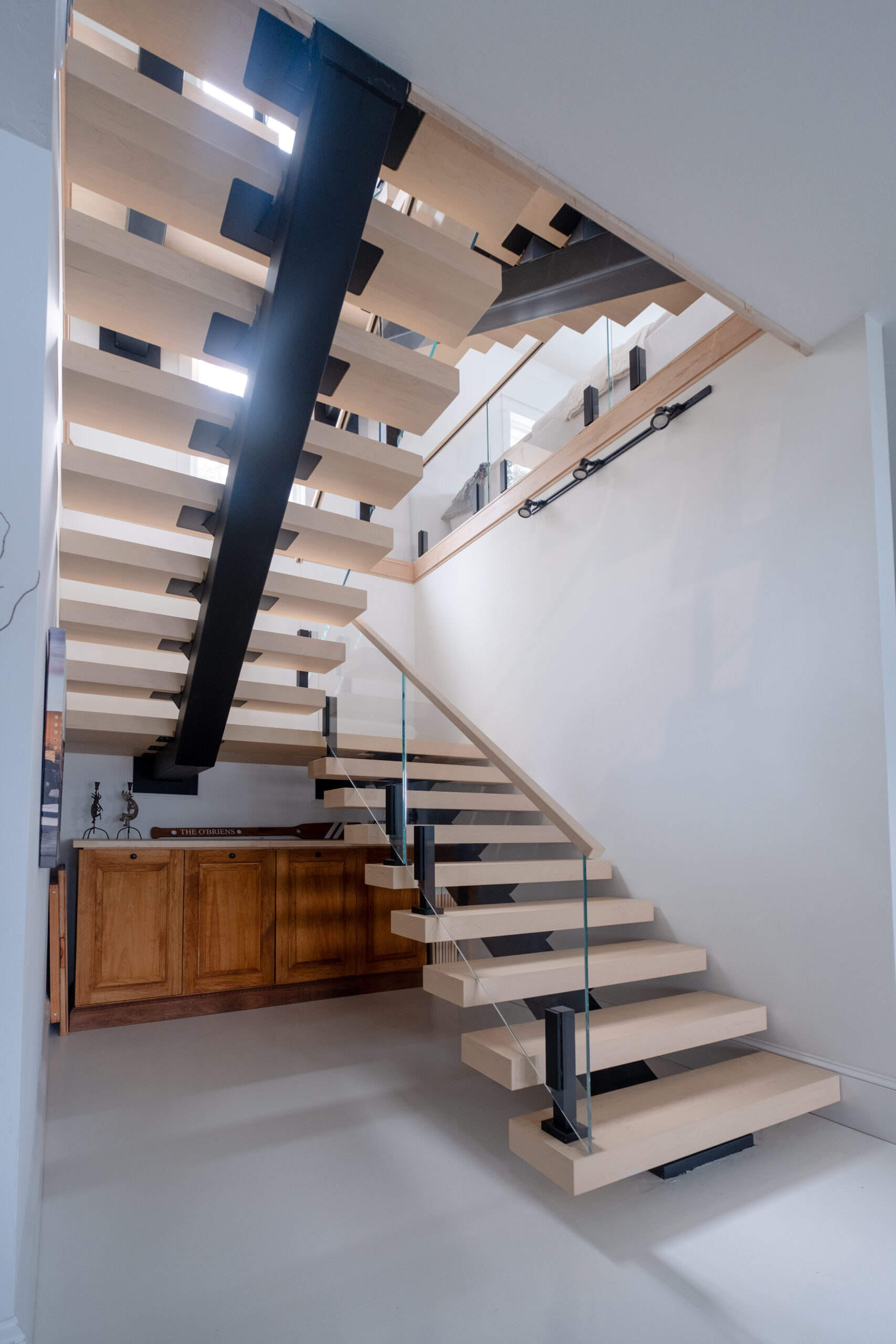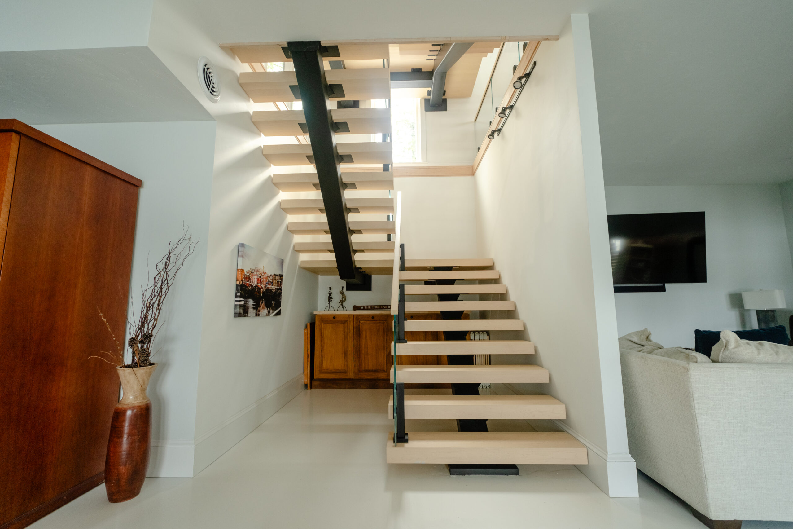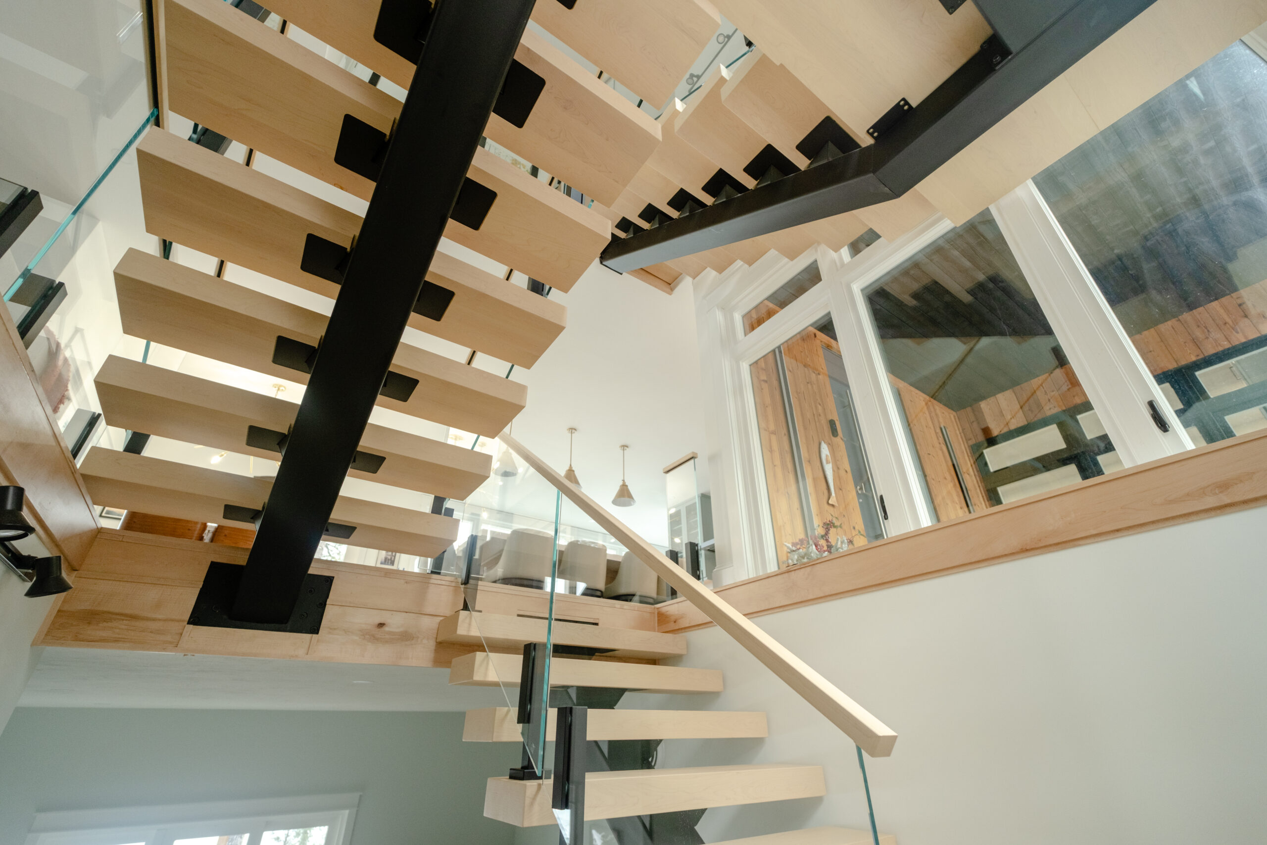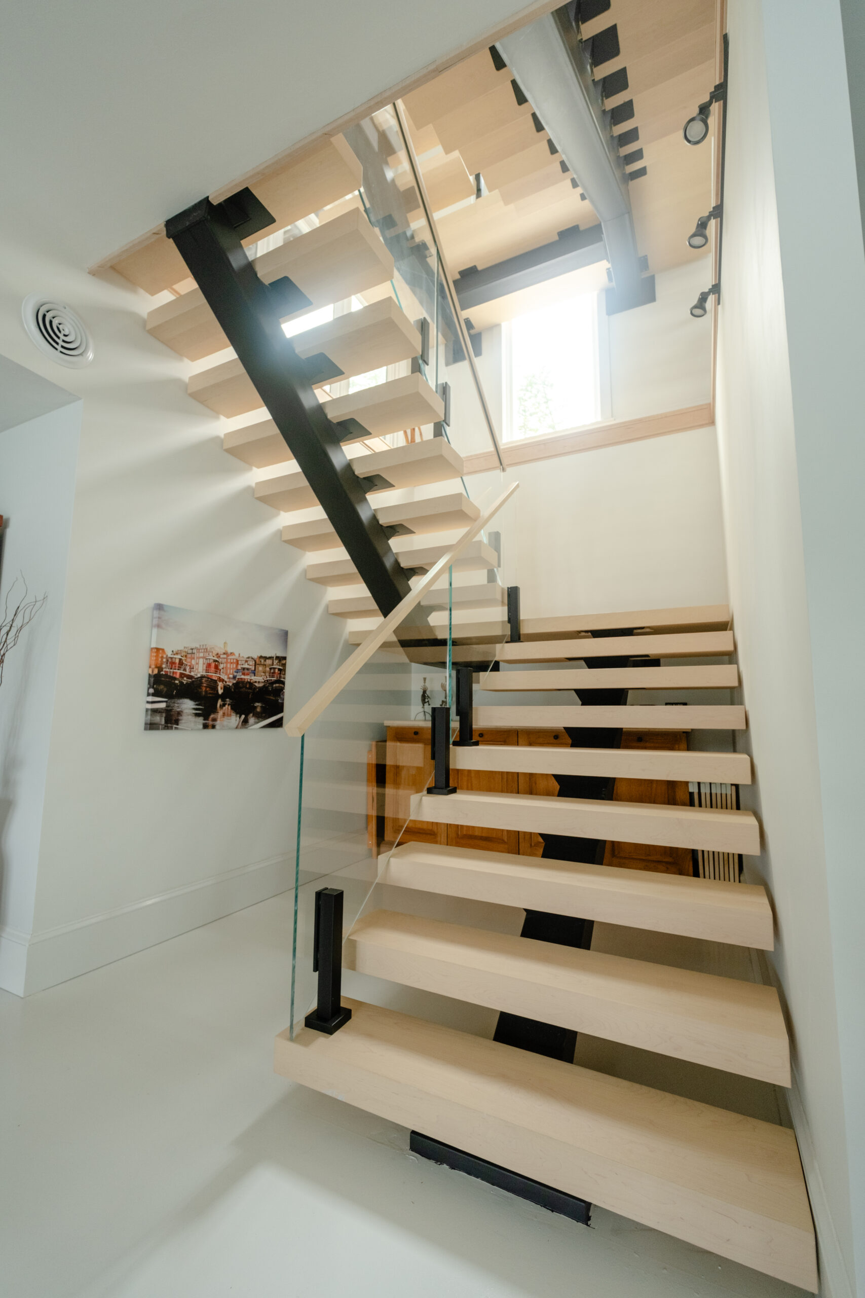 In New Durham, this lakeside new build is anchored by a dramatic double switchback FLIGHT Mono staircase with glass railing. Black powder-coated stringers and Ascend Talons add crisp definition, while Hard Maple treads and cap rail bring warmth to the space. Surrounded by generous windows, the entry feels both inviting and elevated.