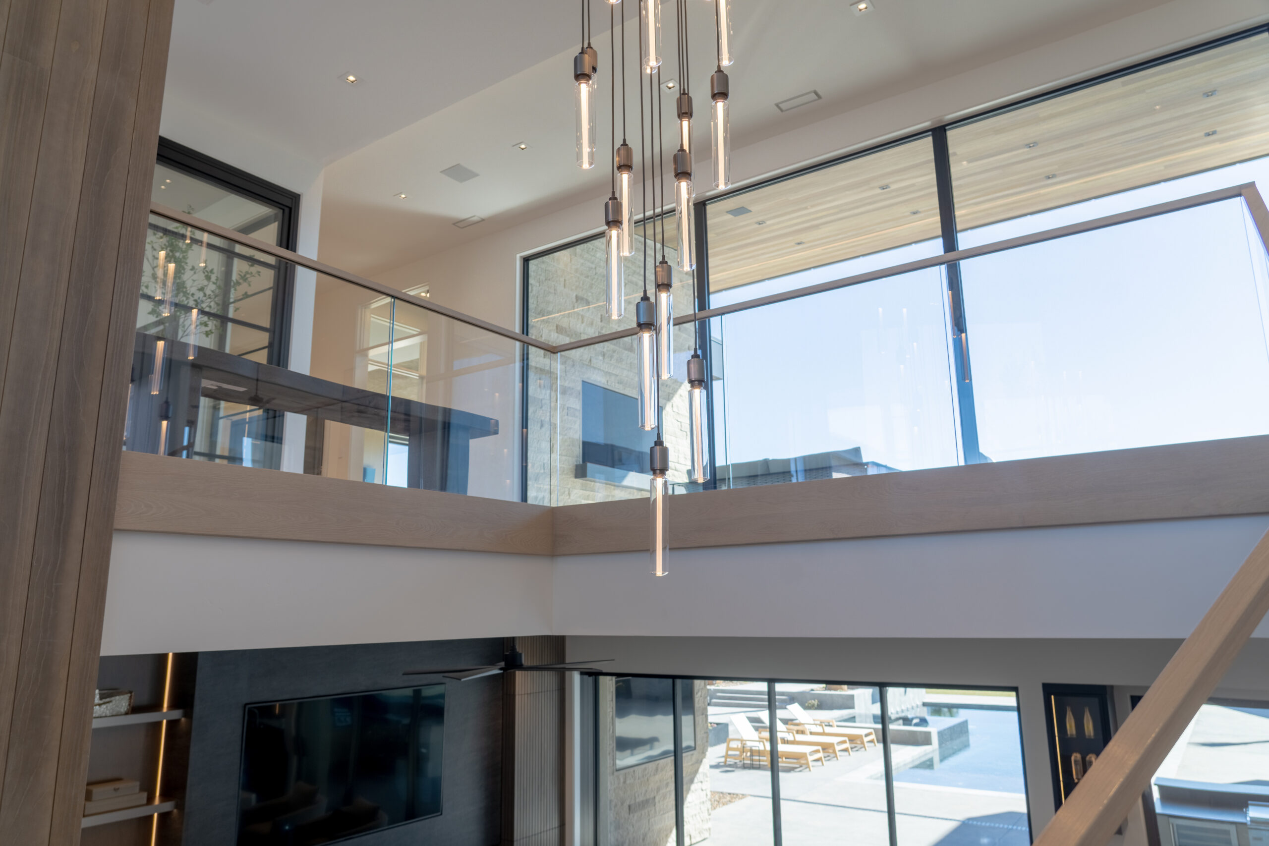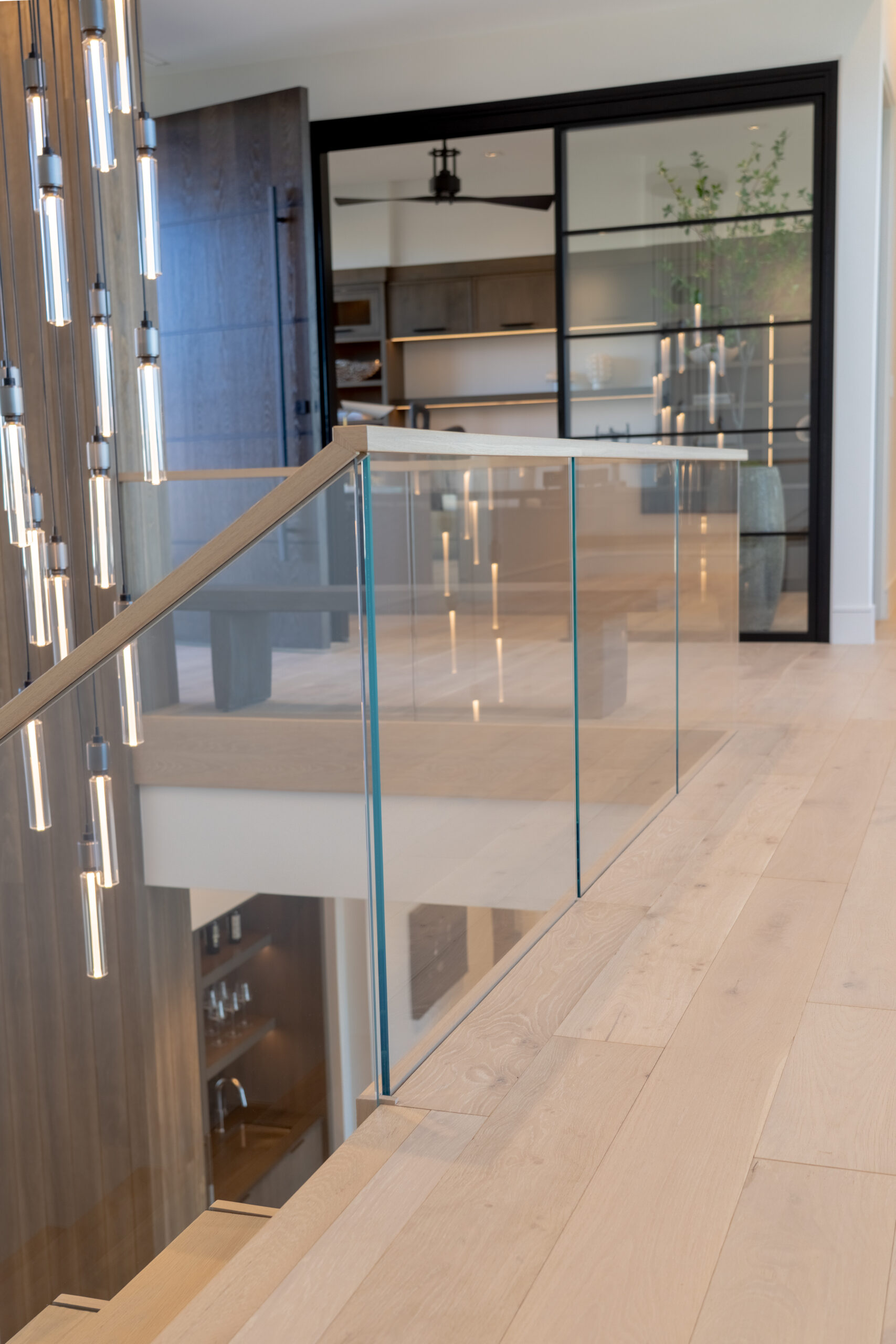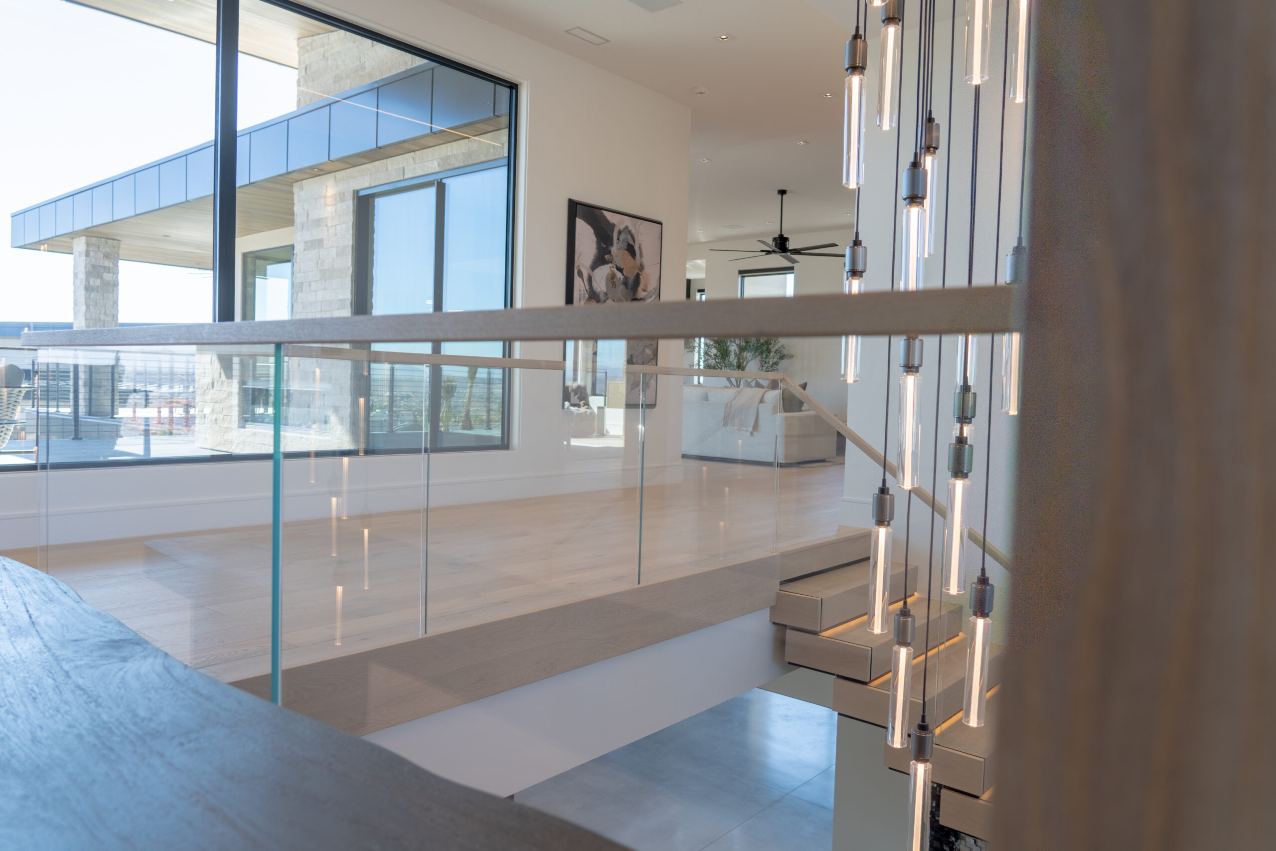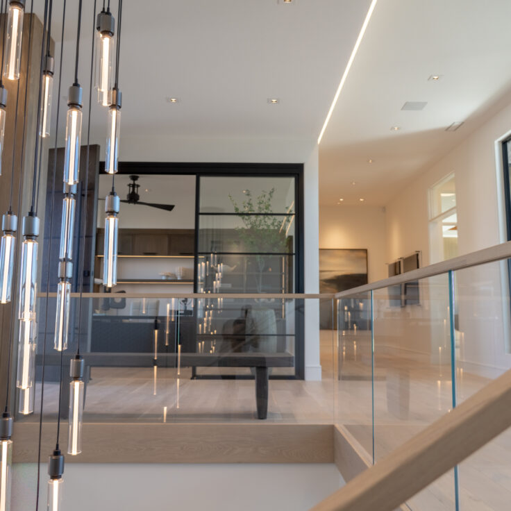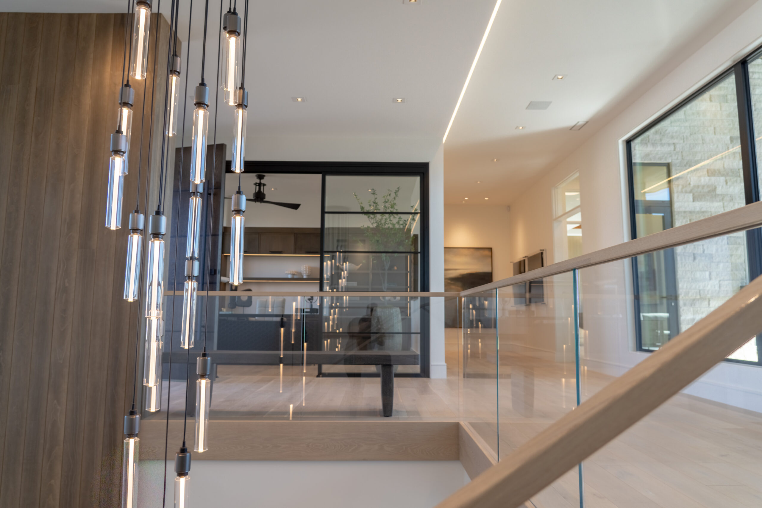 This stunning space showcases how a beautiful staircase can tie a home’s design together. This FLIGHT Stack system turns the corner with intriguing light features and sleek glass railing.