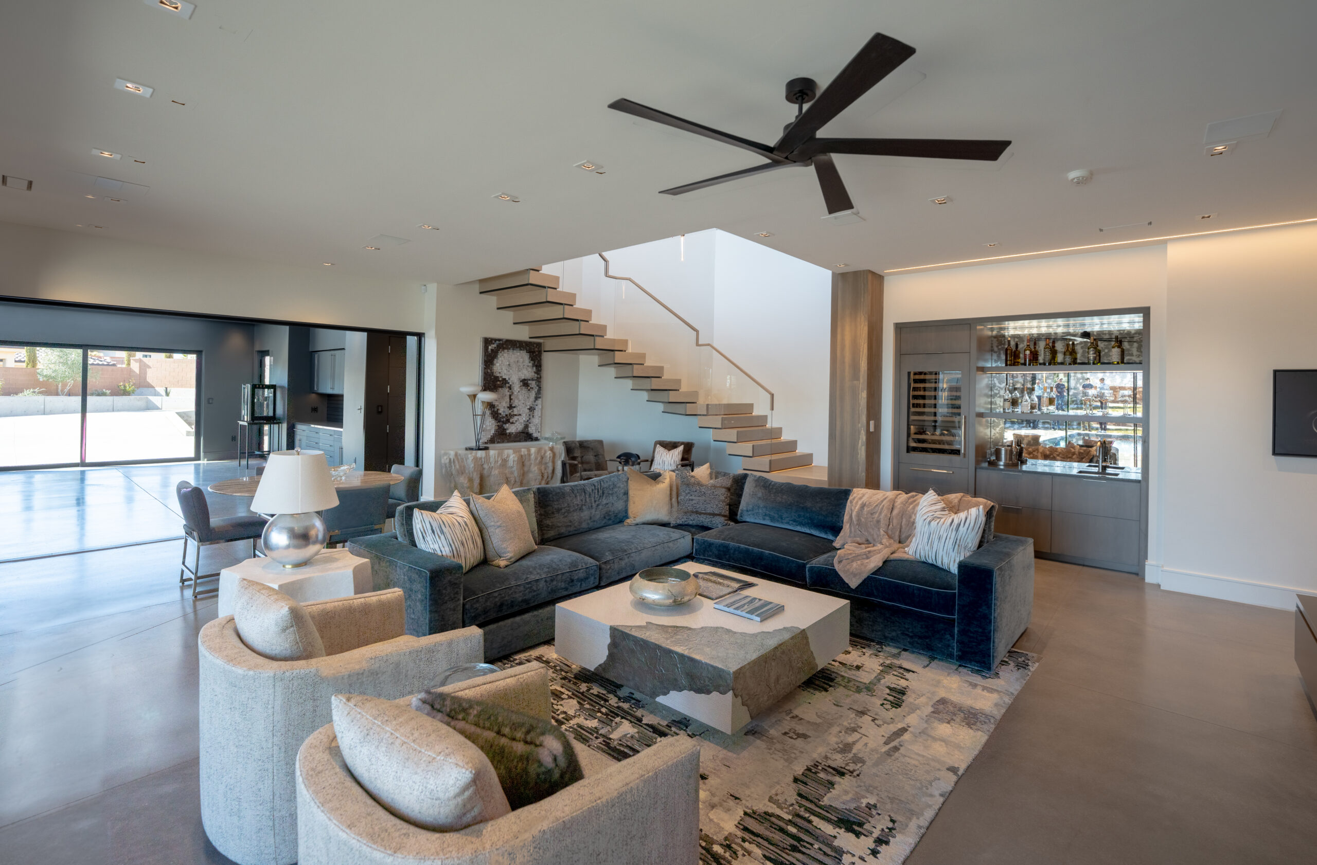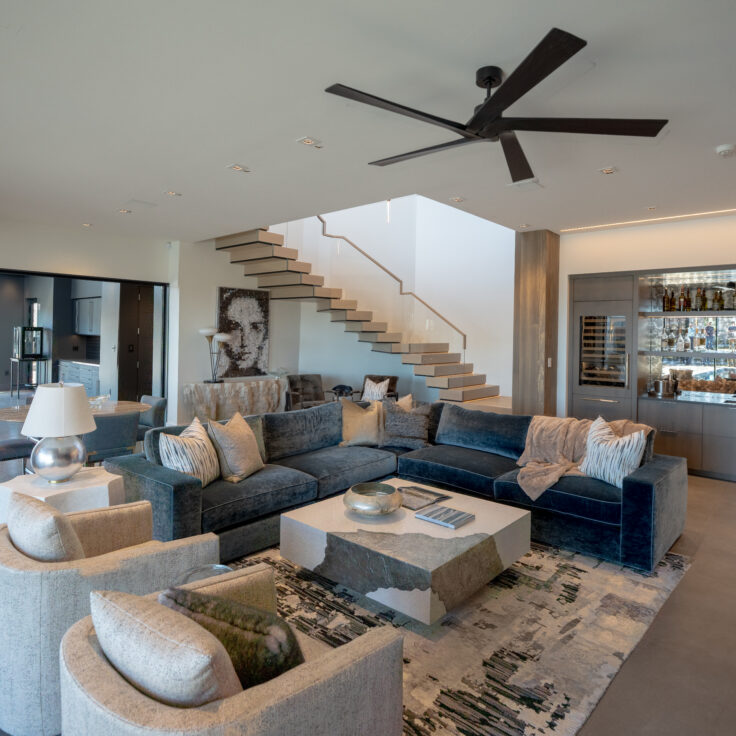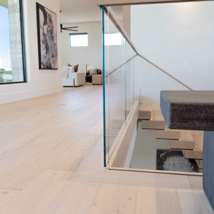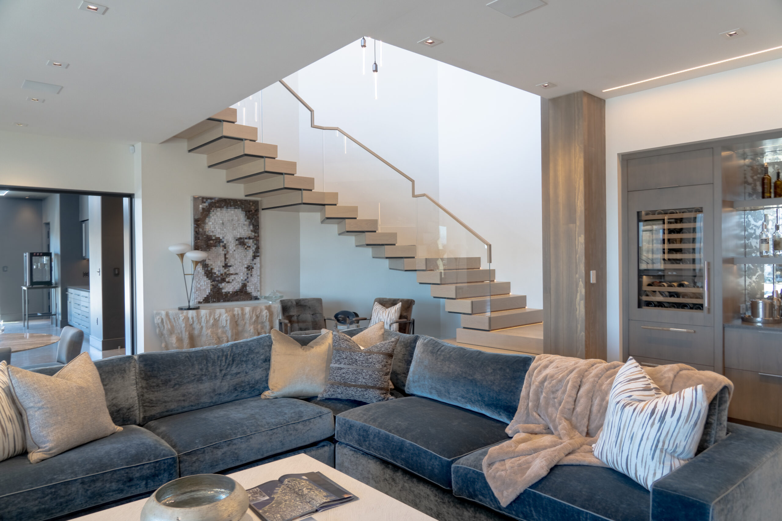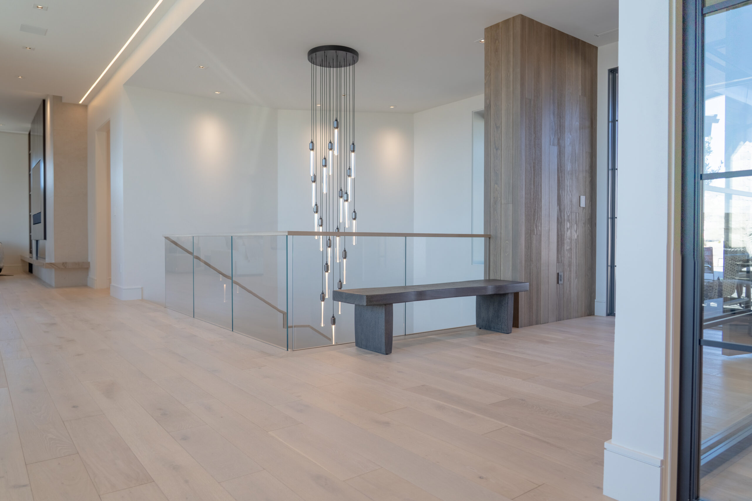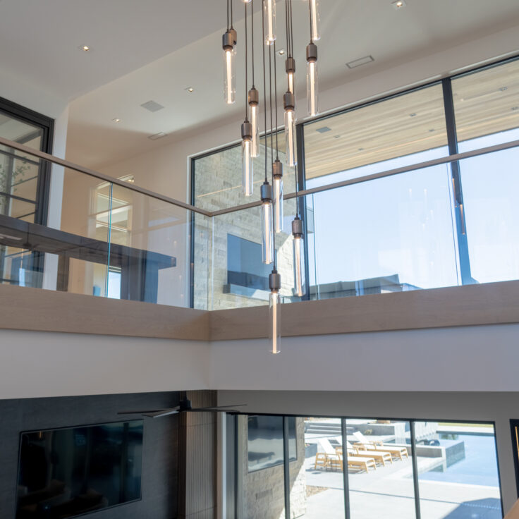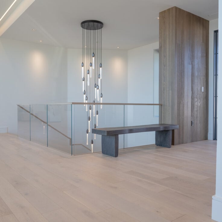 This stunning space showcases how a beautiful staircase can tie a home’s design together. This FLIGHT Stack system turns the corner with intriguing light features and sleek glass railing.