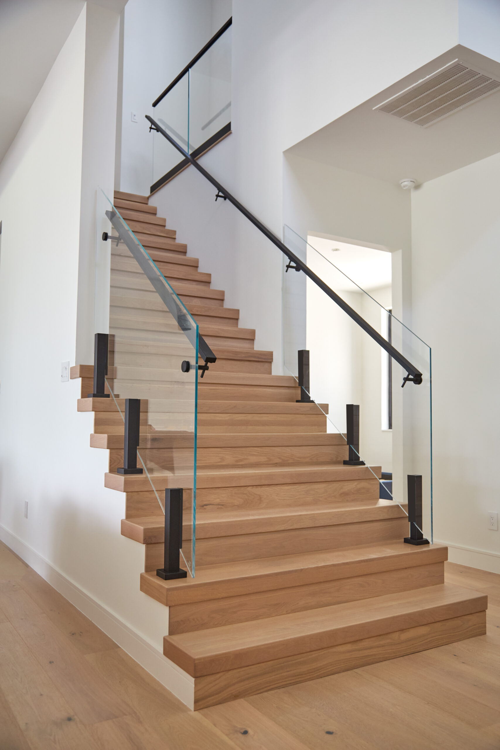 This indoor glass railing system brings an open concept to a narrow space. The natural light highlights each polished tread and complimentary black handrails and metal top caps. With the Ascend Talon mounting style, the glass panels seem almost invisible in this classic, modern space.