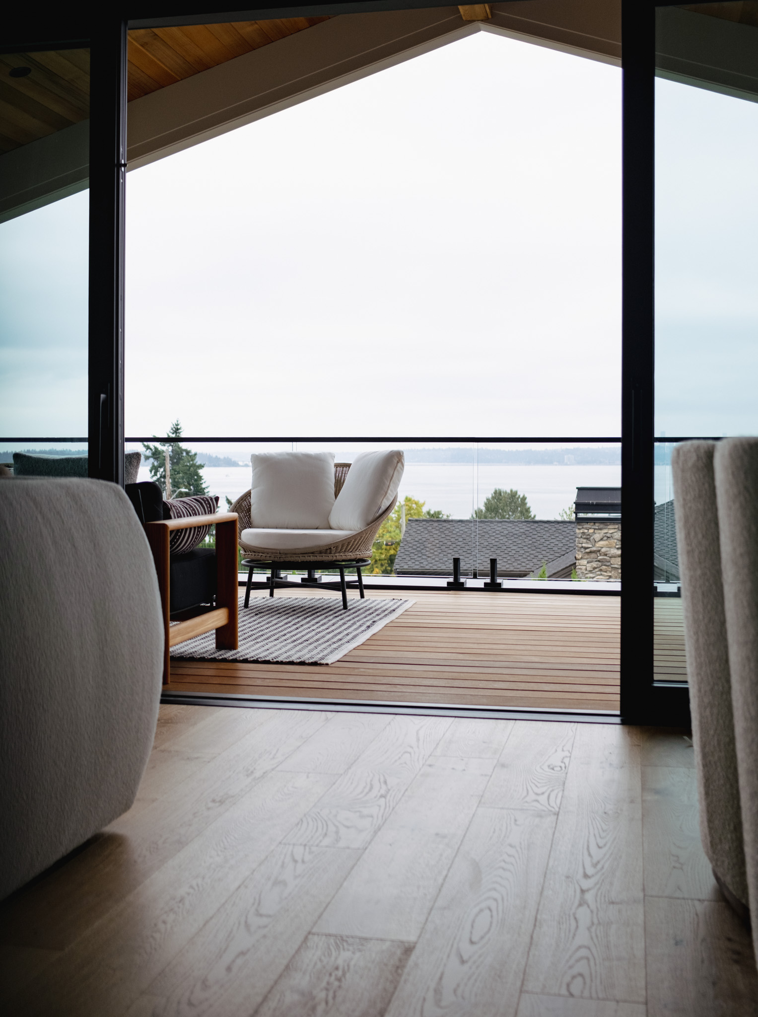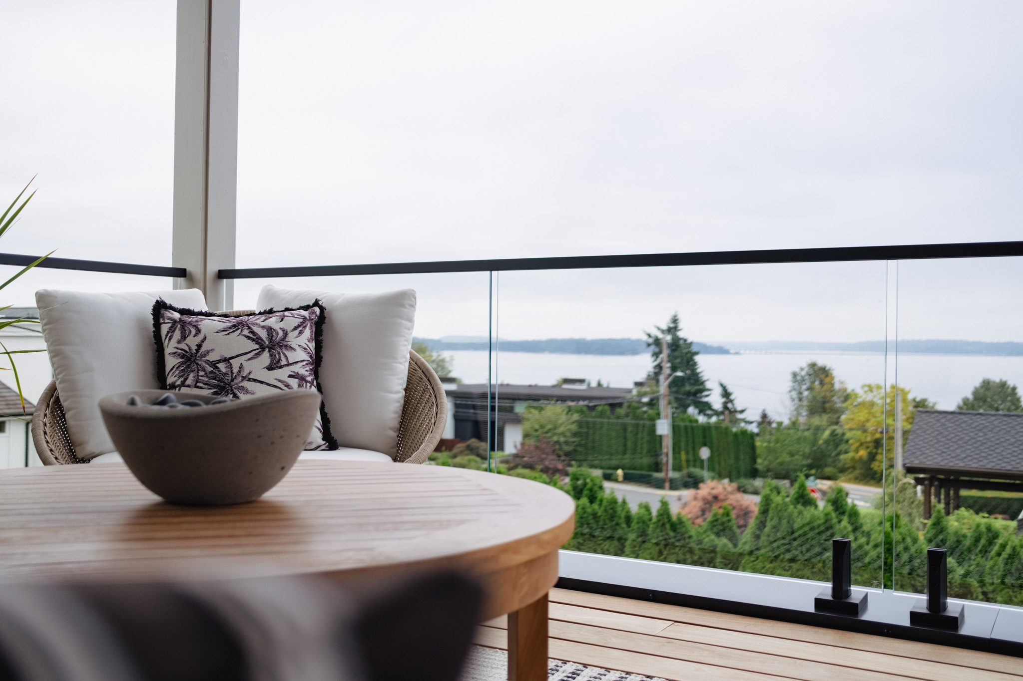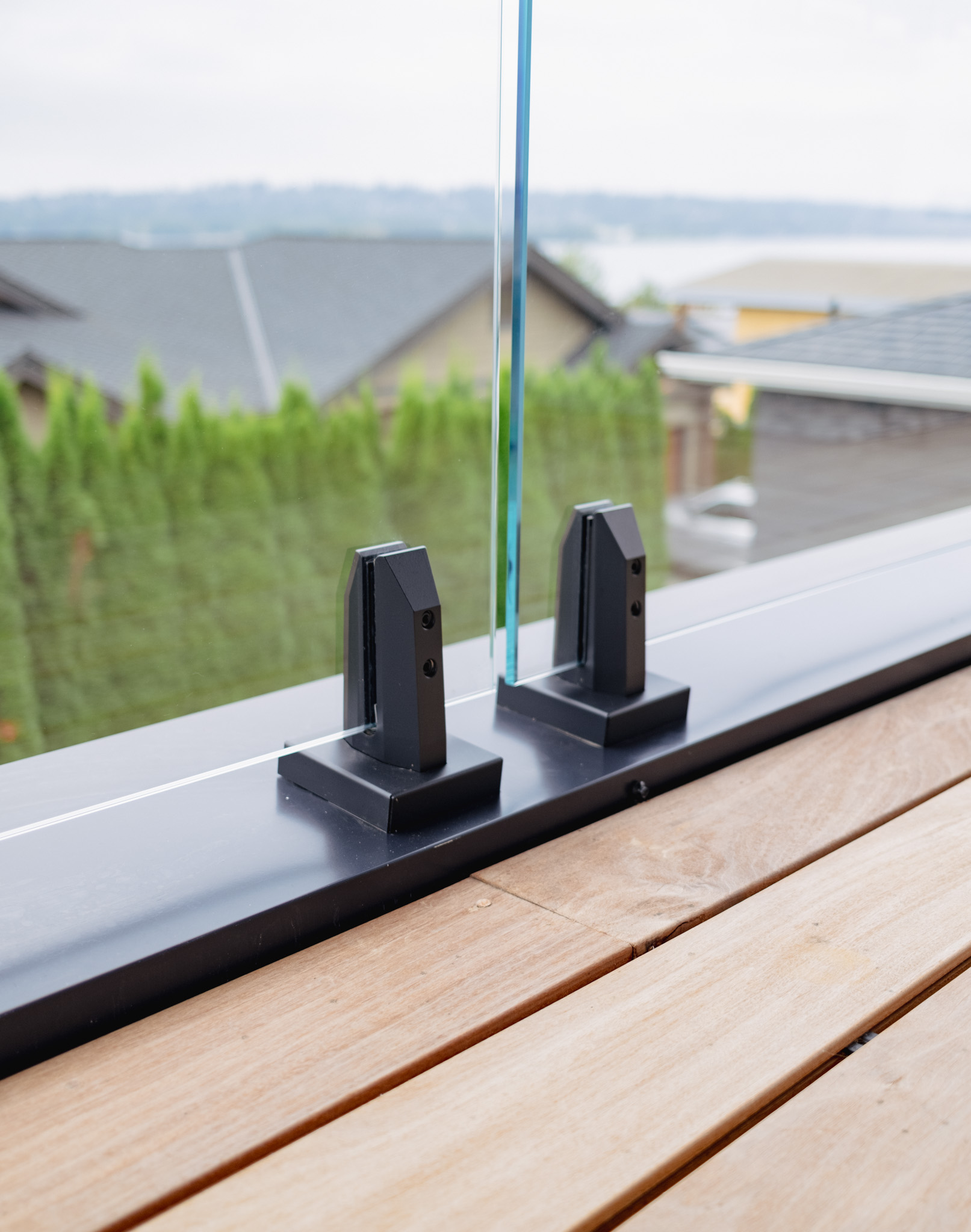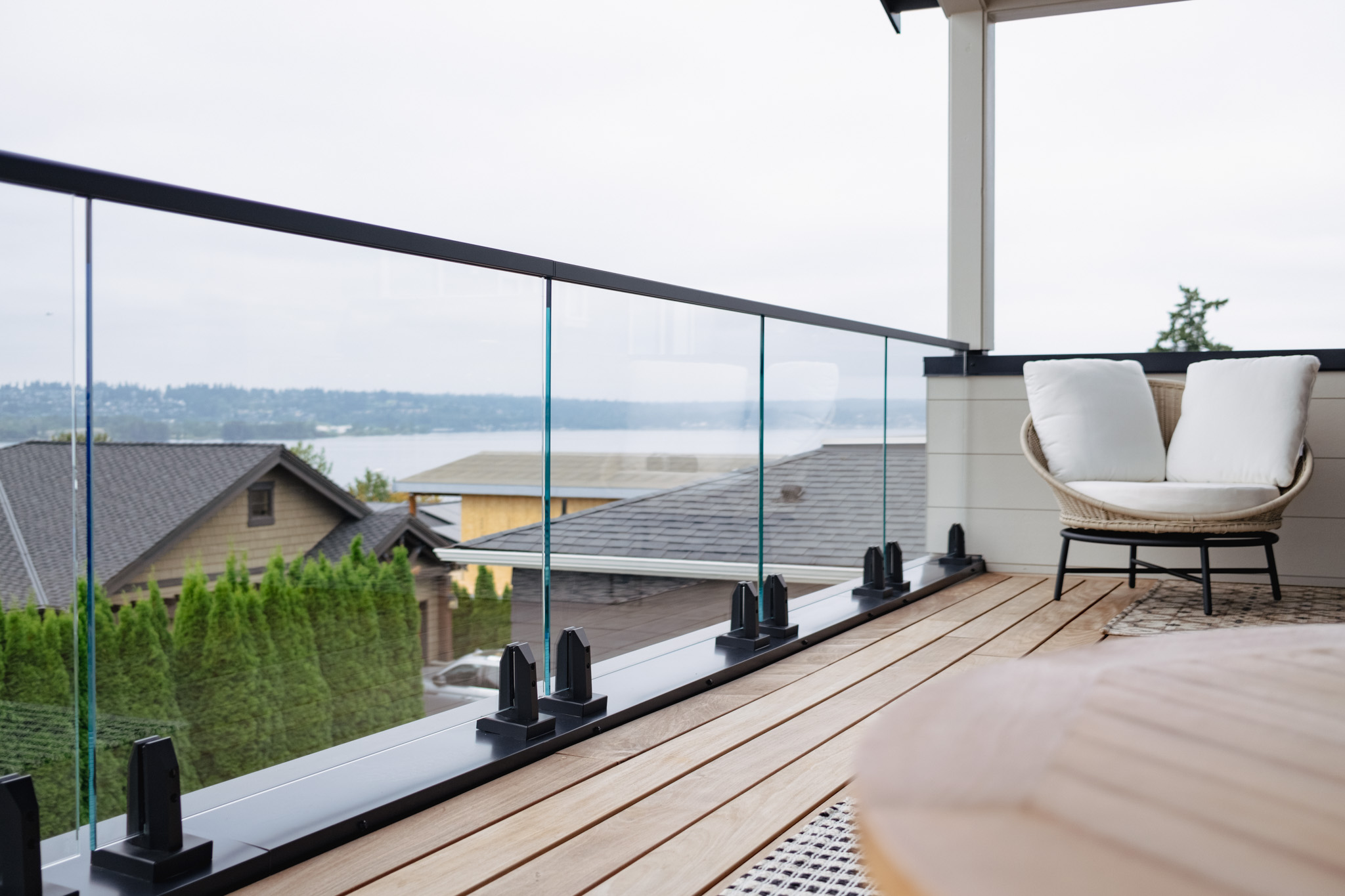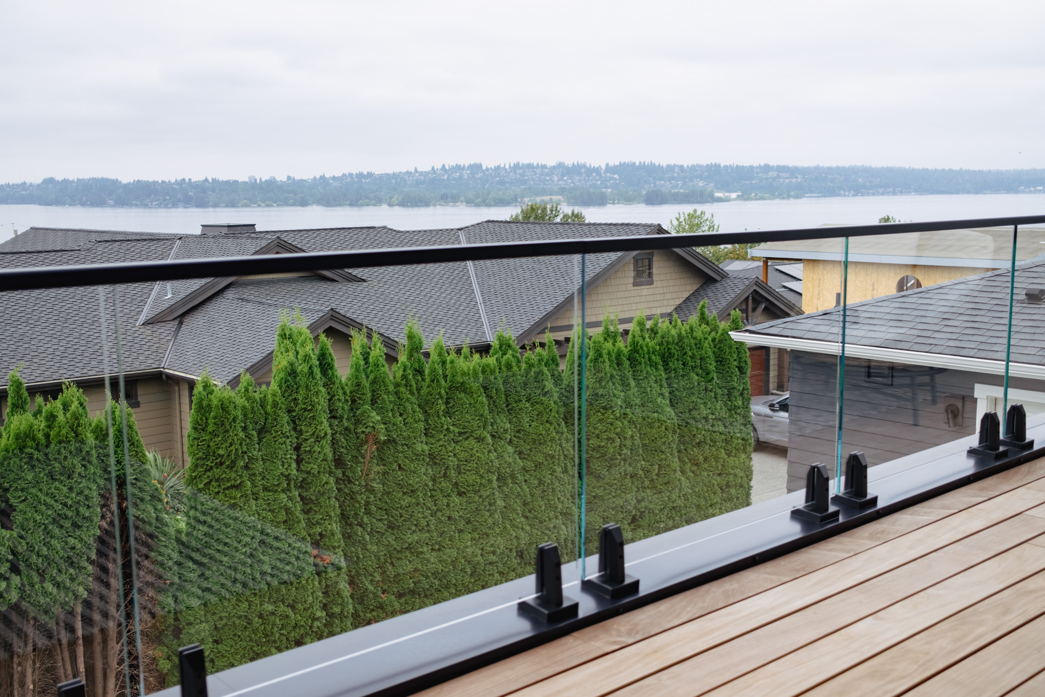 Removed from the city and tucked away in the bay, this glass railing keeps the views of Lake Washington and Seattle in sight. The surface mount glass talon spigots pair beautifully with the black powder-coated cap rail, embodying the best of minimalist design while maintaining maximum visibility.