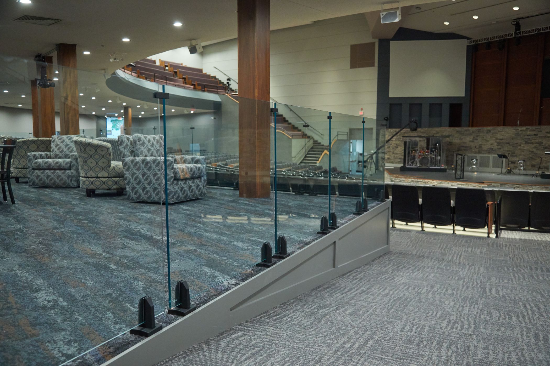This church in Fort Wayne, Indiana needed a guardrail that would separate their cafe section from the rest of the congregation. But they did not want to block the view of the pastor and worship team. Glass railing was the perfect solution. Sturdy glass panels keep kids and adults safe and allow a great view of the front of the church. It was simple to install the railing with glass spigots.