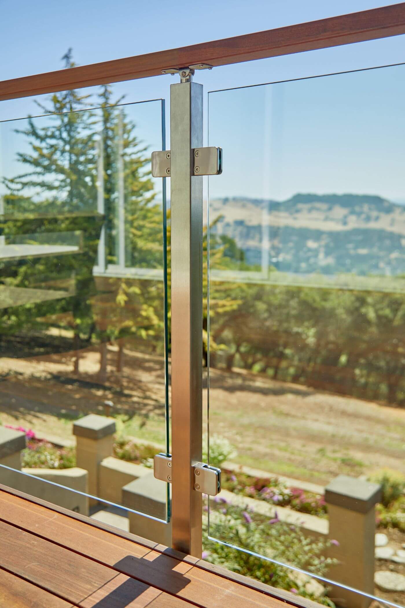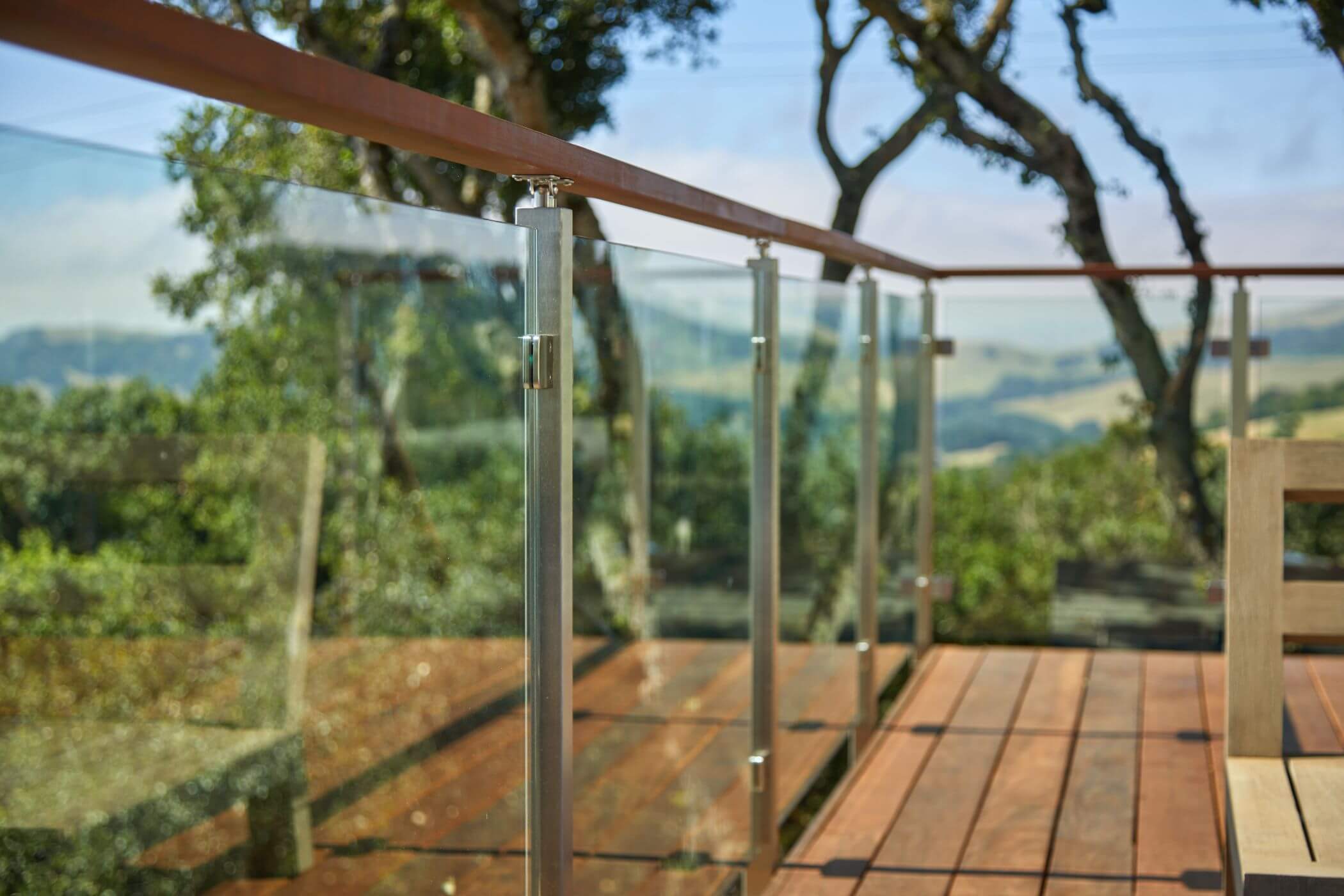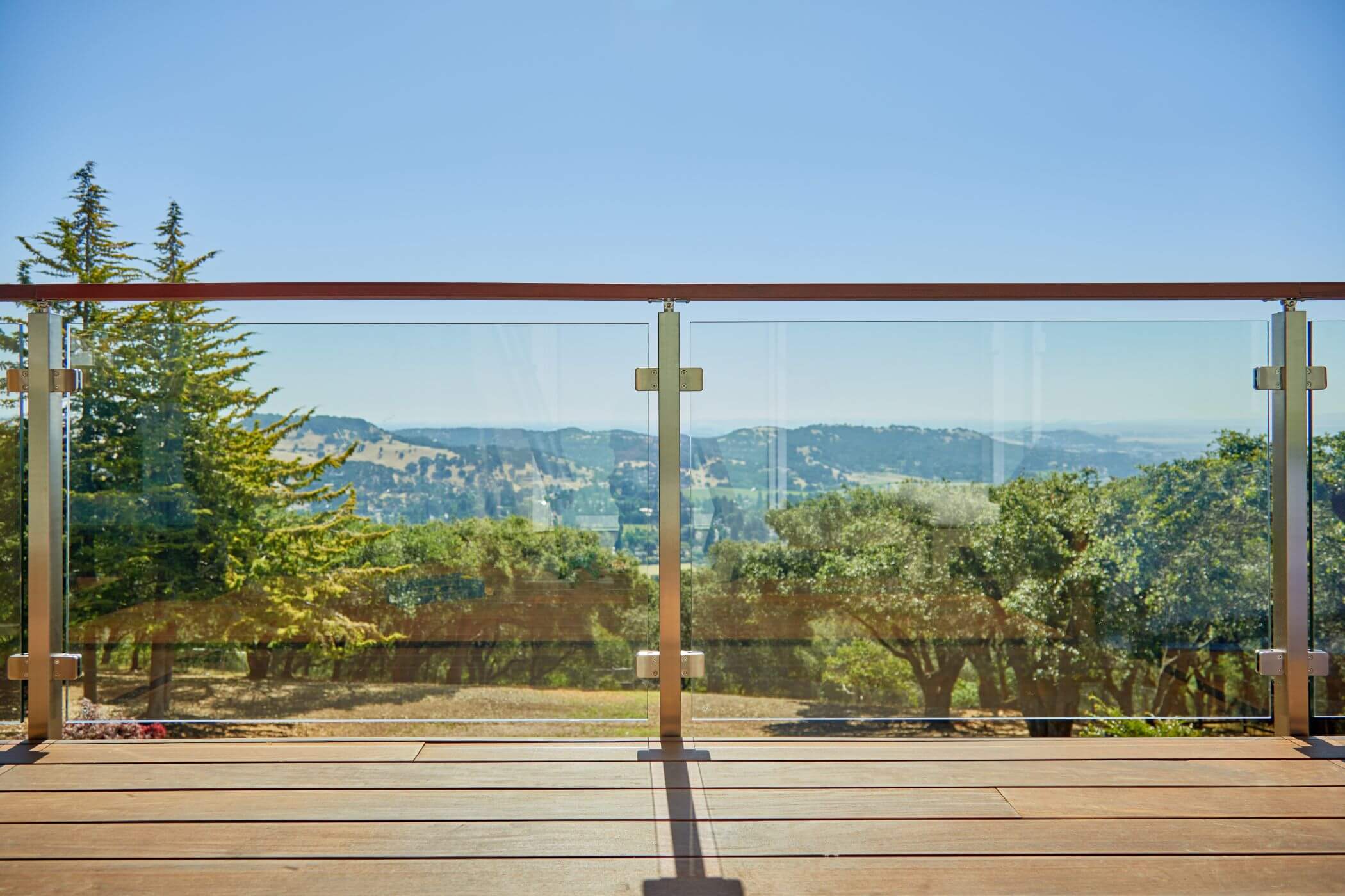 Clear glass railing wraps around this outdoor deck, keeping the focus on the beautiful landscape in the background.