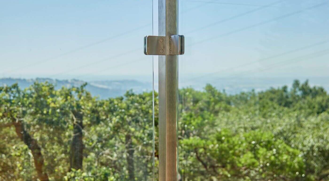 Clear glass railing wraps around this outdoor deck, keeping the focus on the beautiful landscape in the background. Glass clips hold each panel in place. With side-mounted railing posts, there’s plenty of space to walk and entertain guests on the deck.