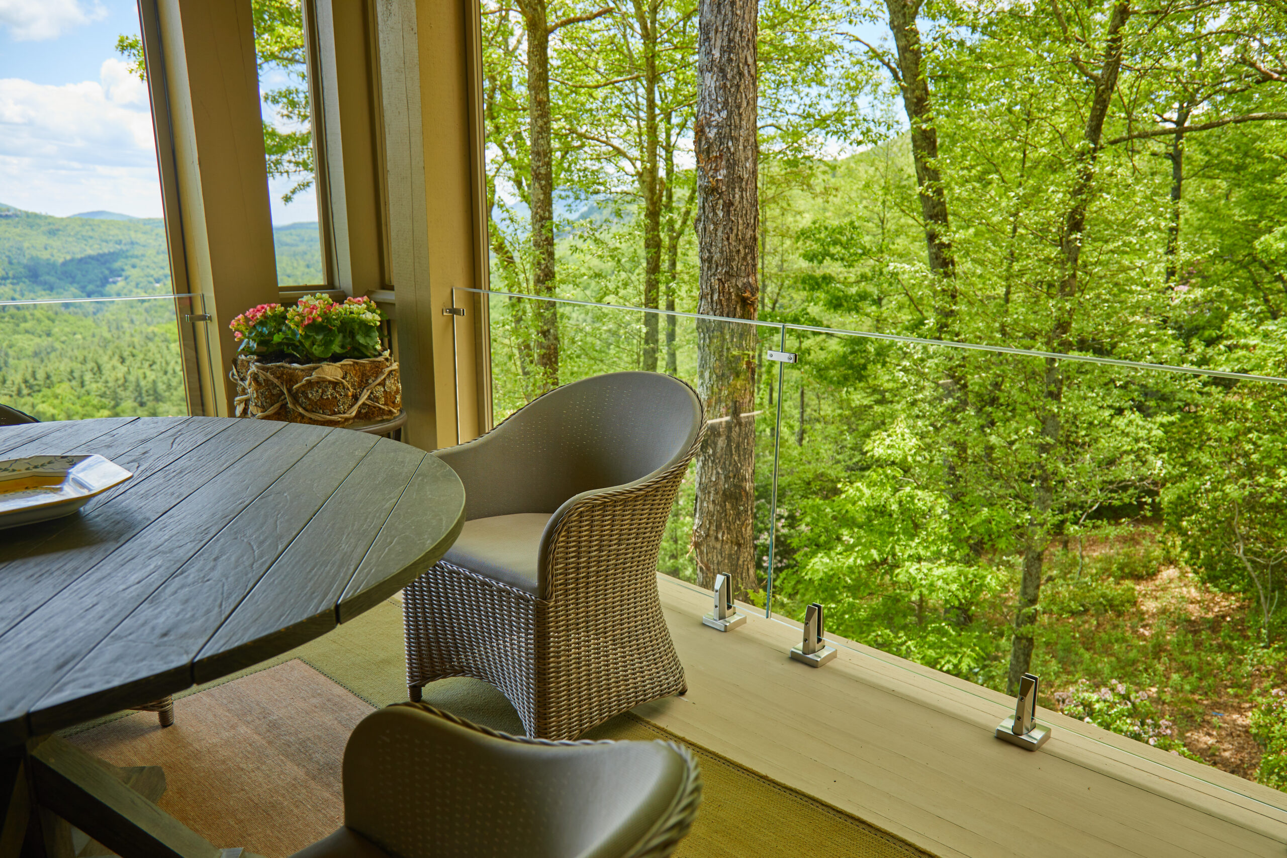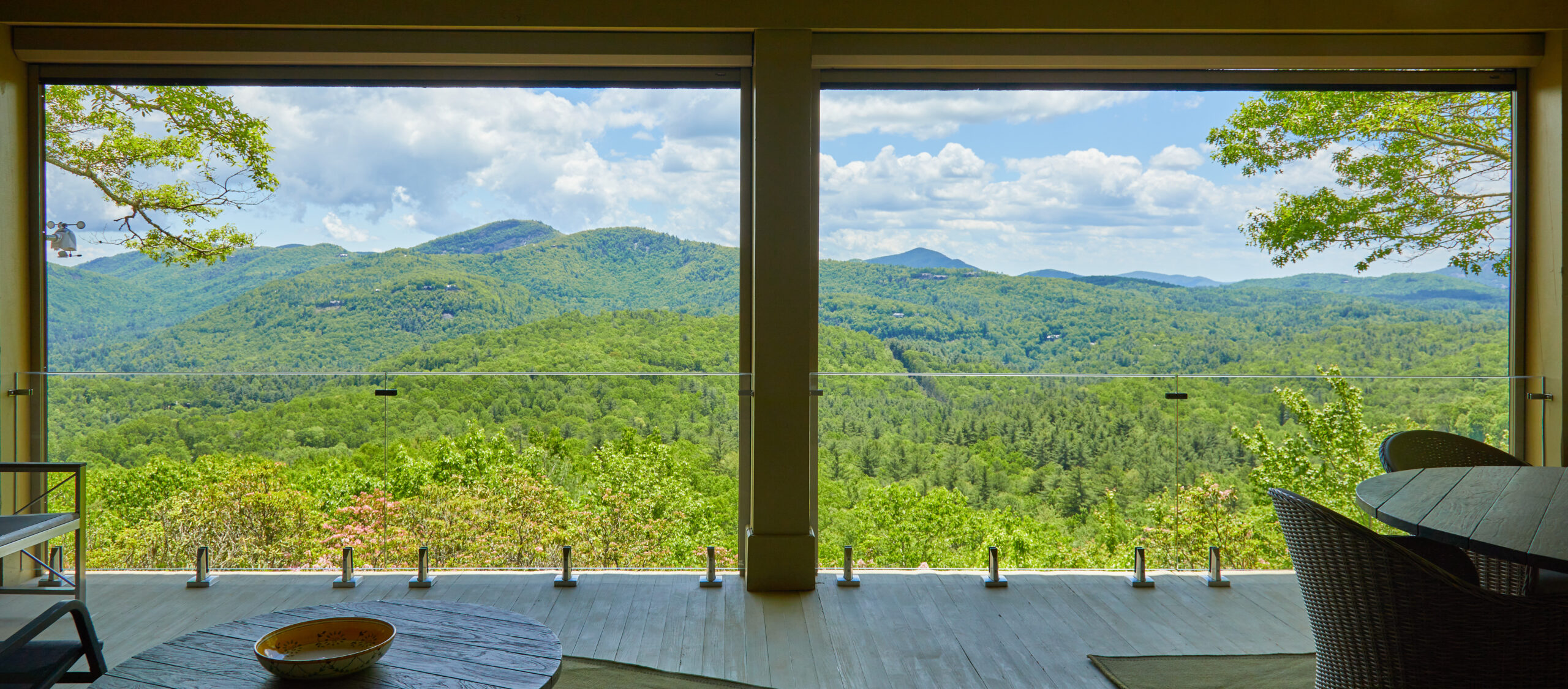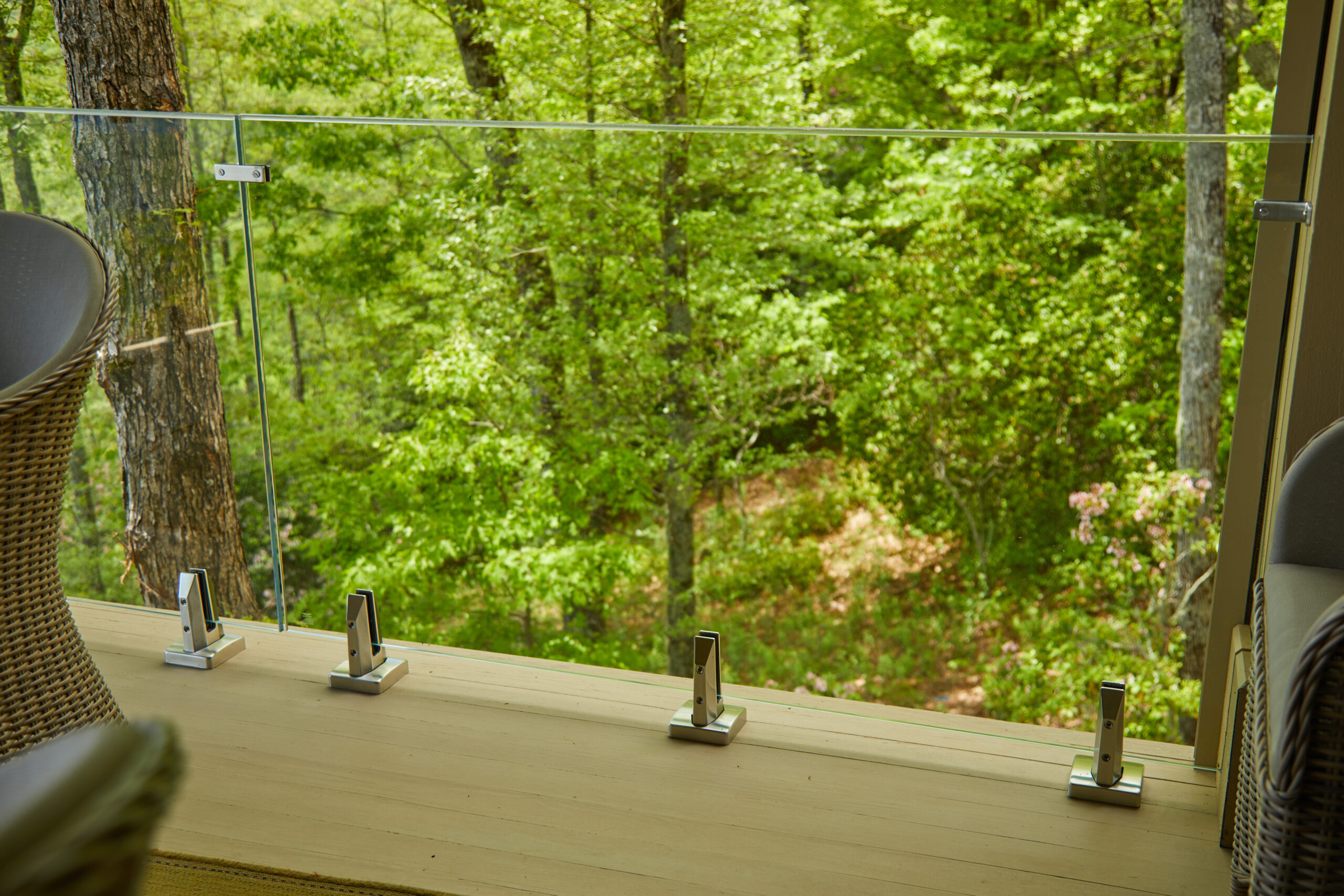 Glass railing was the perfect option for this spectacular mountain view. No other system could have emphasized the view as well as the glass railing. Choosing the surface talons to support the glass panels and opting to use the glass stabilizers helped keep the view unobstructed while providing an extremely strong railing. The low iron (ultra clear) glass panels almost disappear. This covered porch is going to see a lot of use in the years to come!