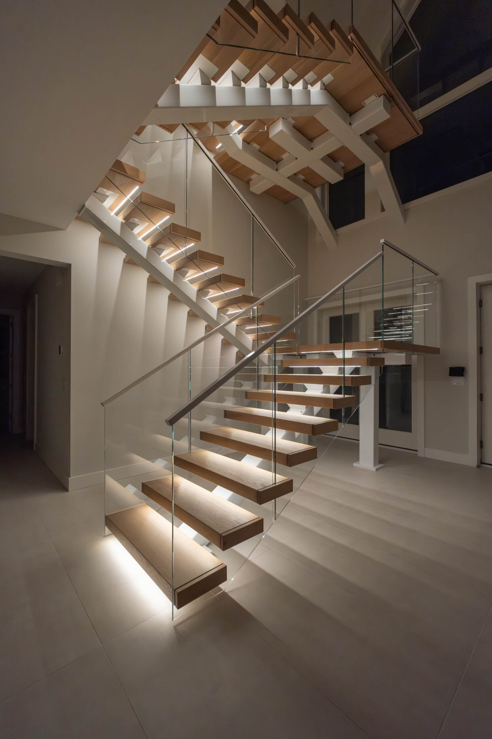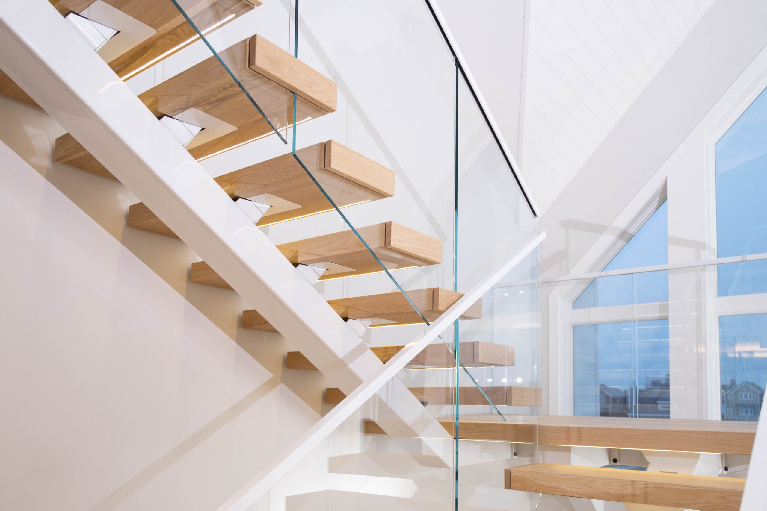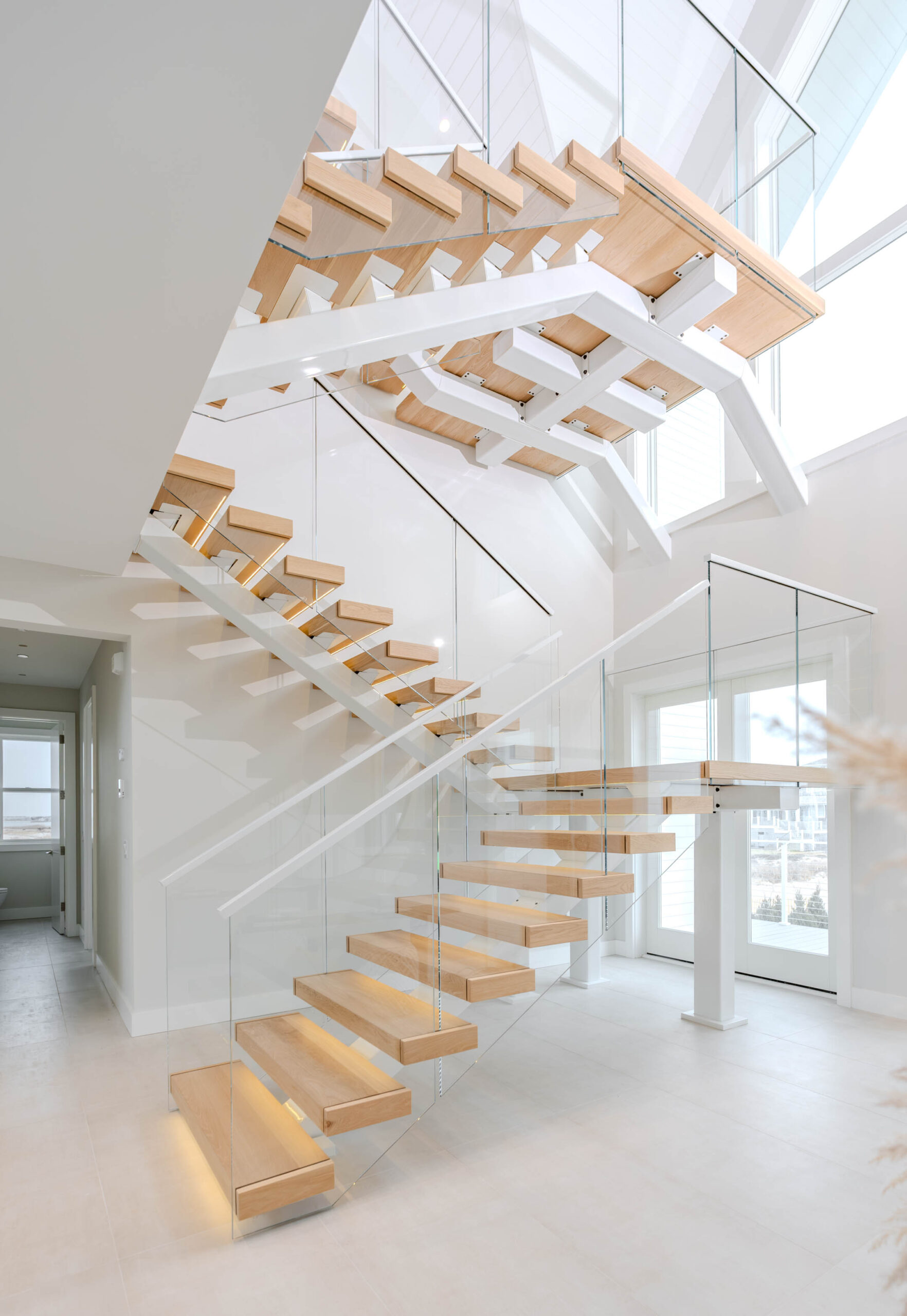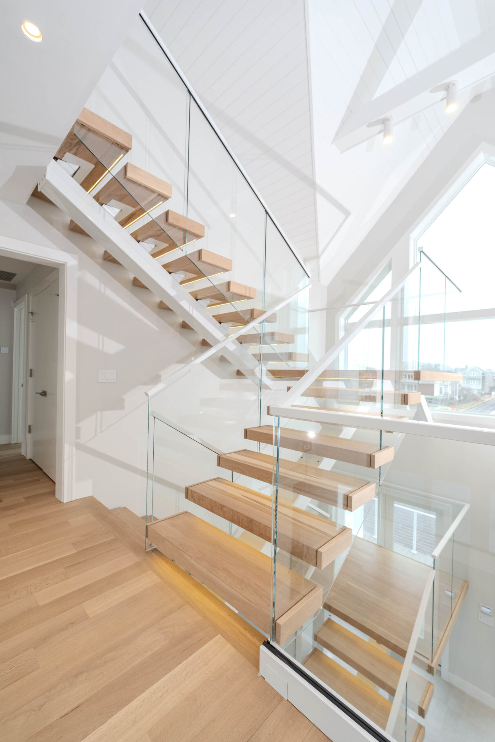 A double switchback rises from the entry to the third floor, preserving a spacious, light-filled interior. The Bright White stringer pairs with clearcoat White Oak treads and LED accents to evoke hygge, while the glass railing keeps the architecture elevated and inviting.