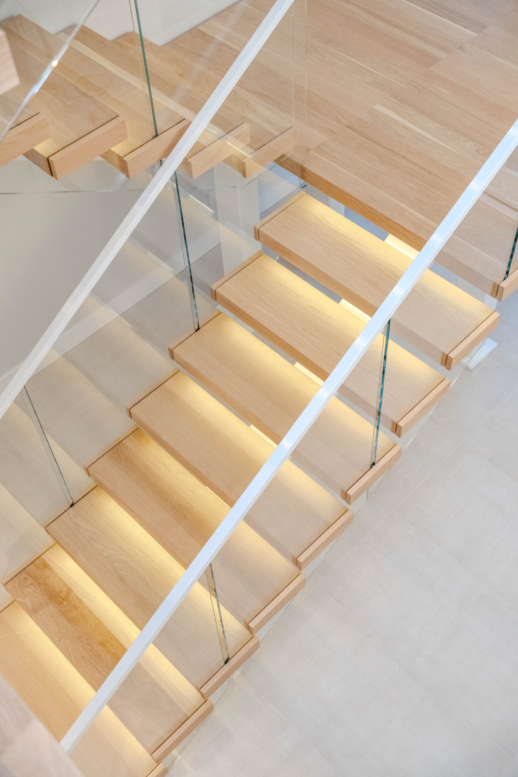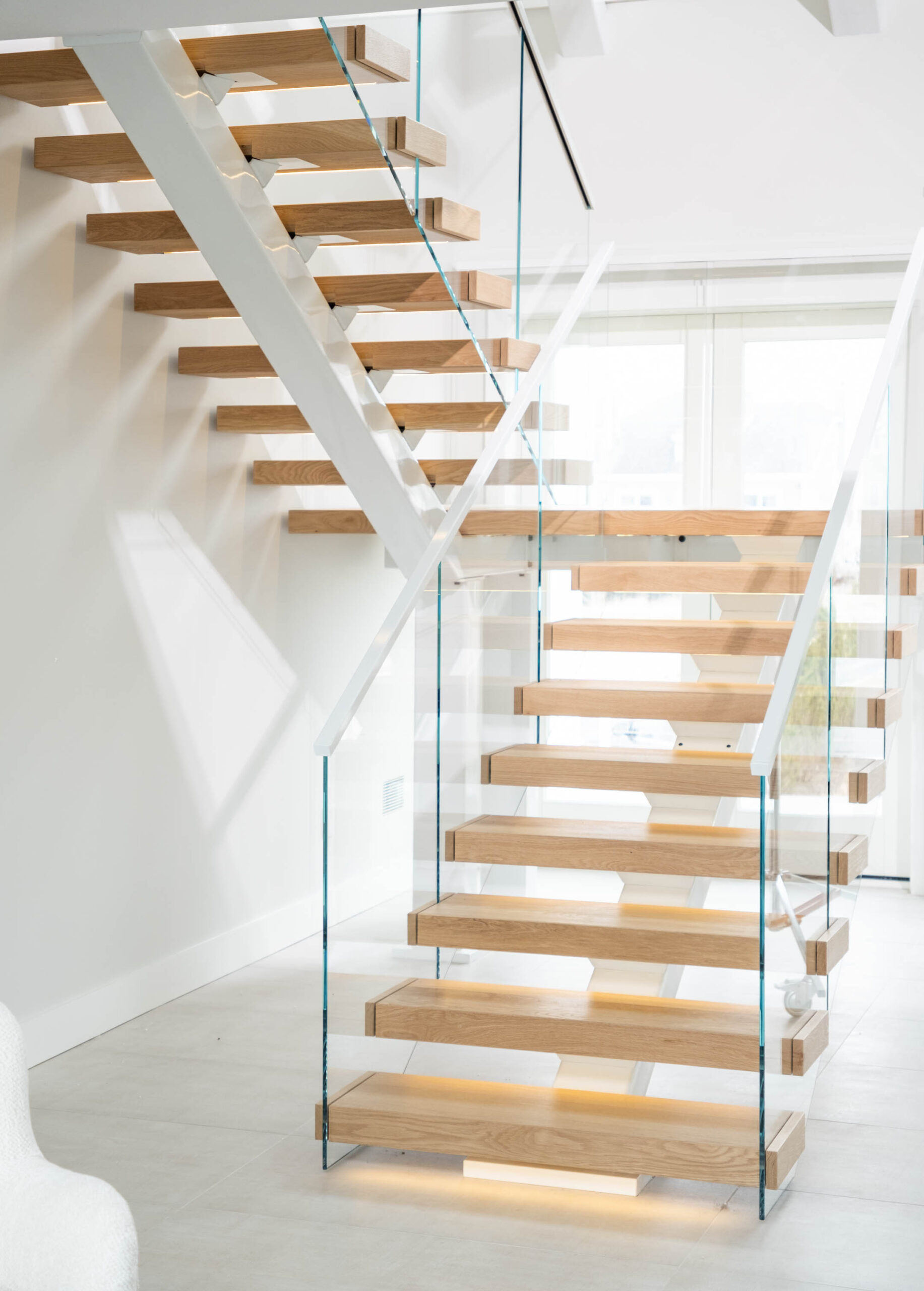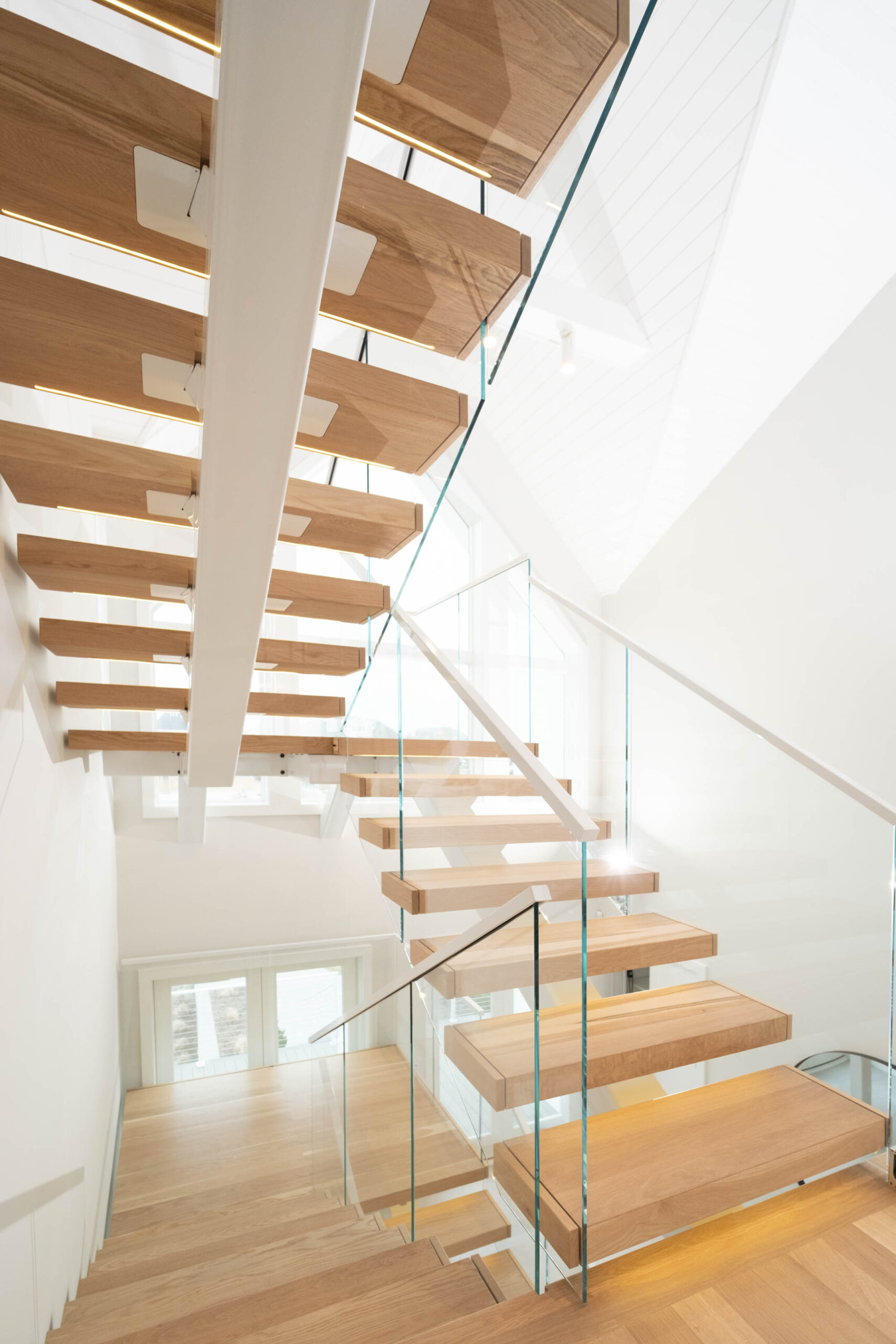A double switchback rises from the entry to the third floor, preserving a spacious, light-filled interior. The Bright White stringer pairs with clearcoat White Oak treads and LED accents to evoke hygge, while the glass railing keeps the architecture elevated and inviting.