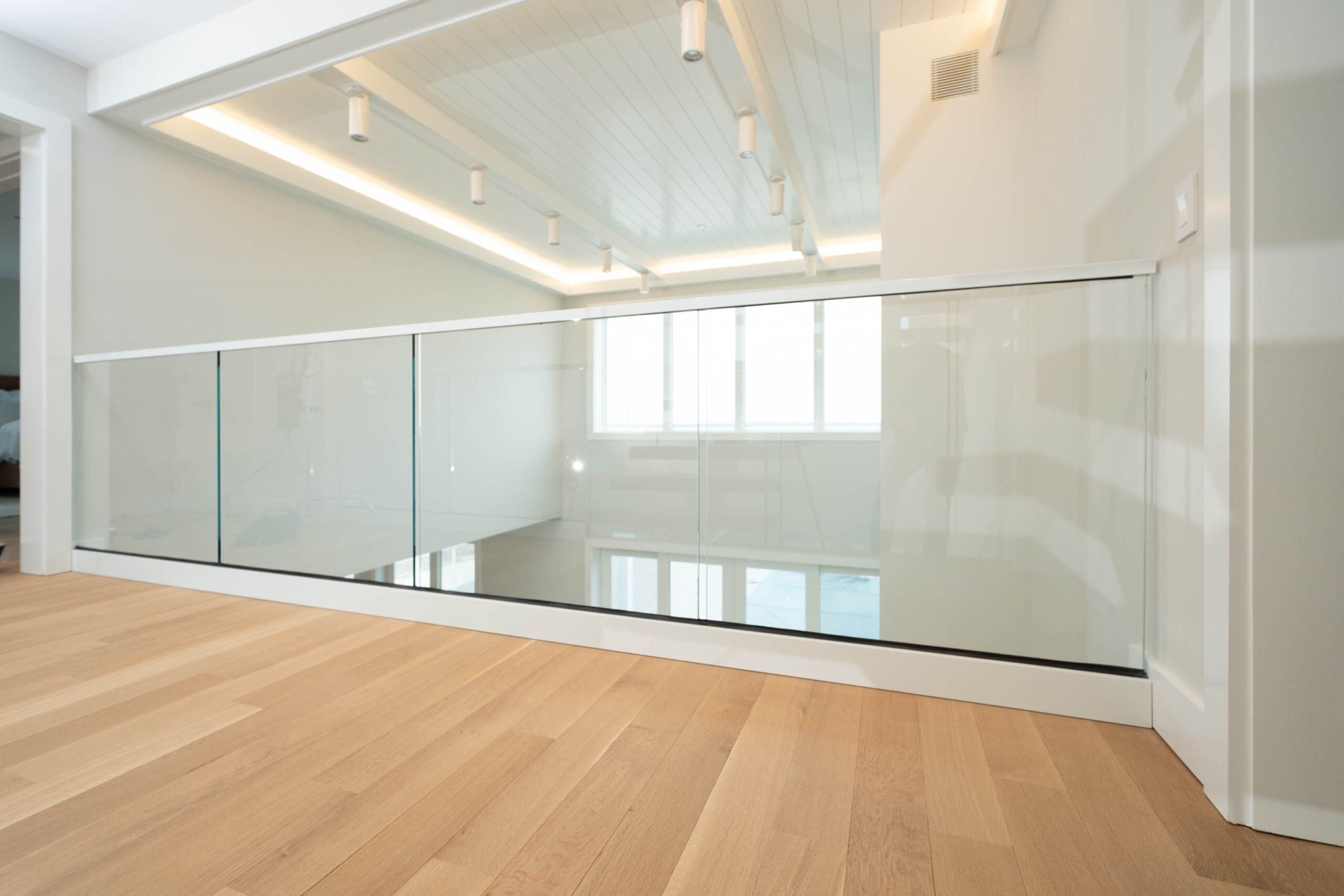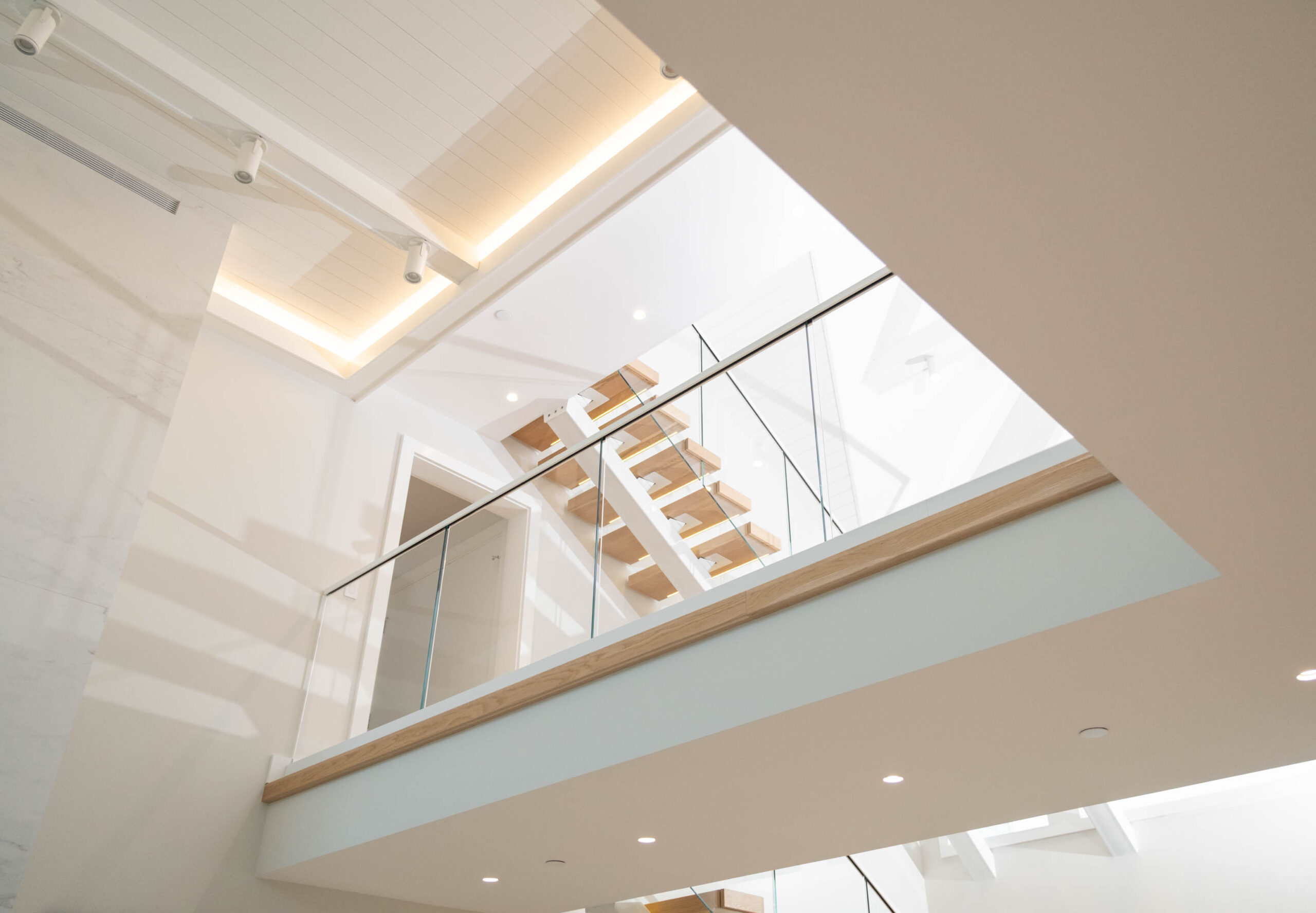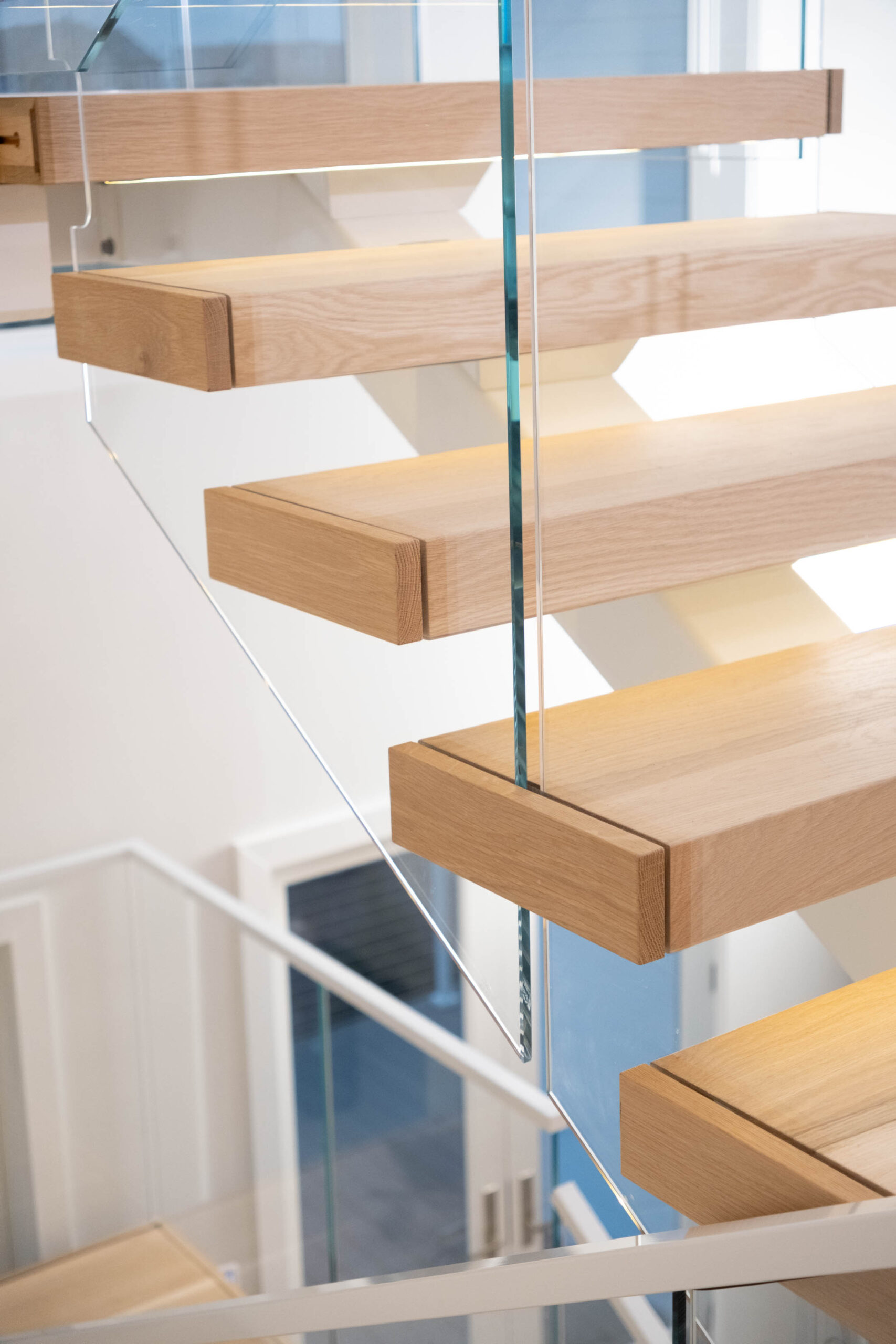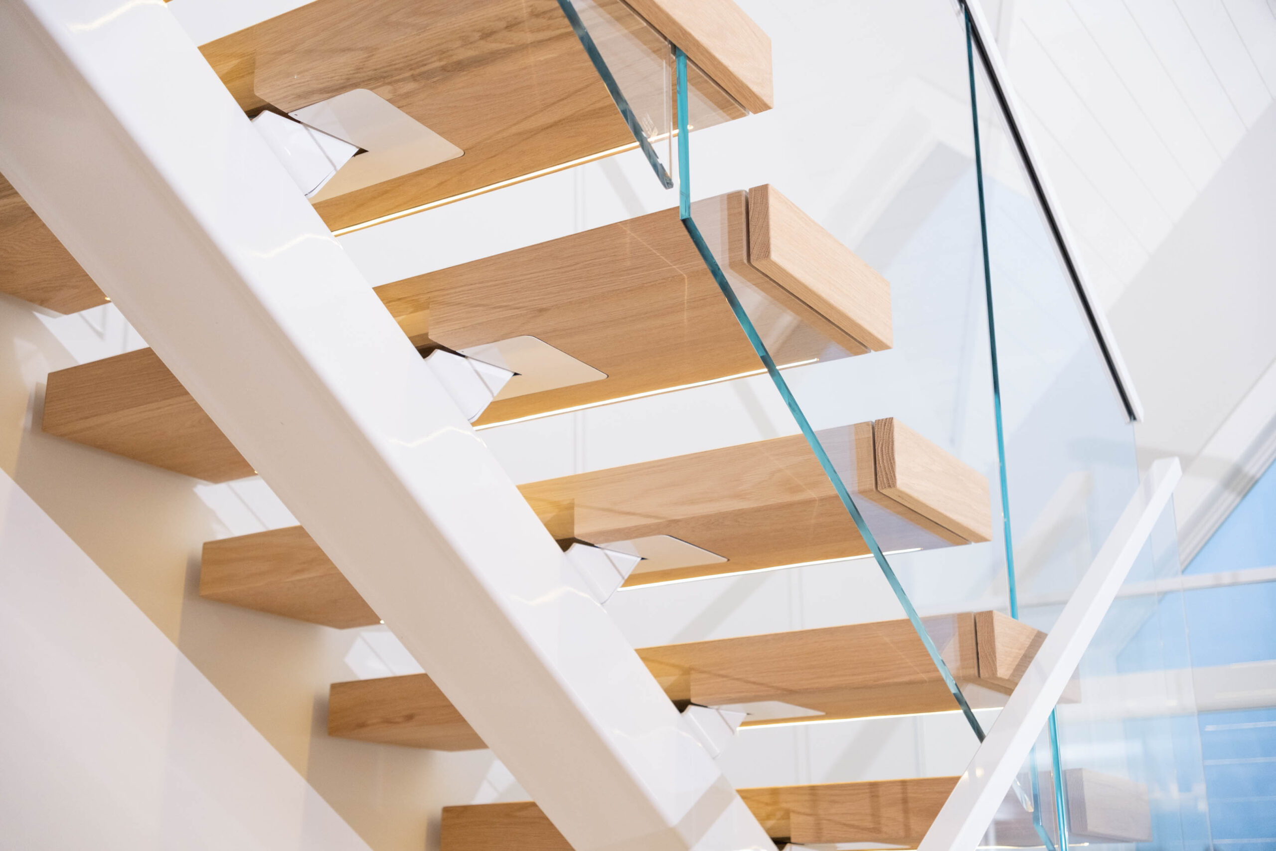 A double switchback rises from the entry to the third floor, preserving a spacious, light-filled interior. The Bright White stringer pairs with clearcoat White Oak treads and LED accents to evoke hygge, while the glass railing keeps the architecture elevated and inviting.