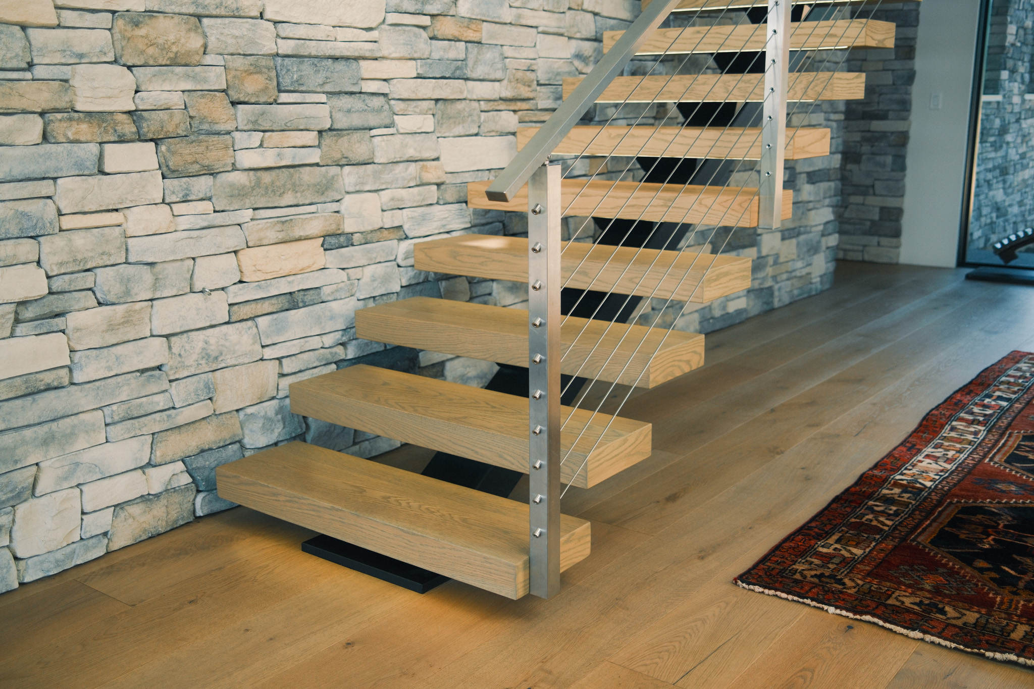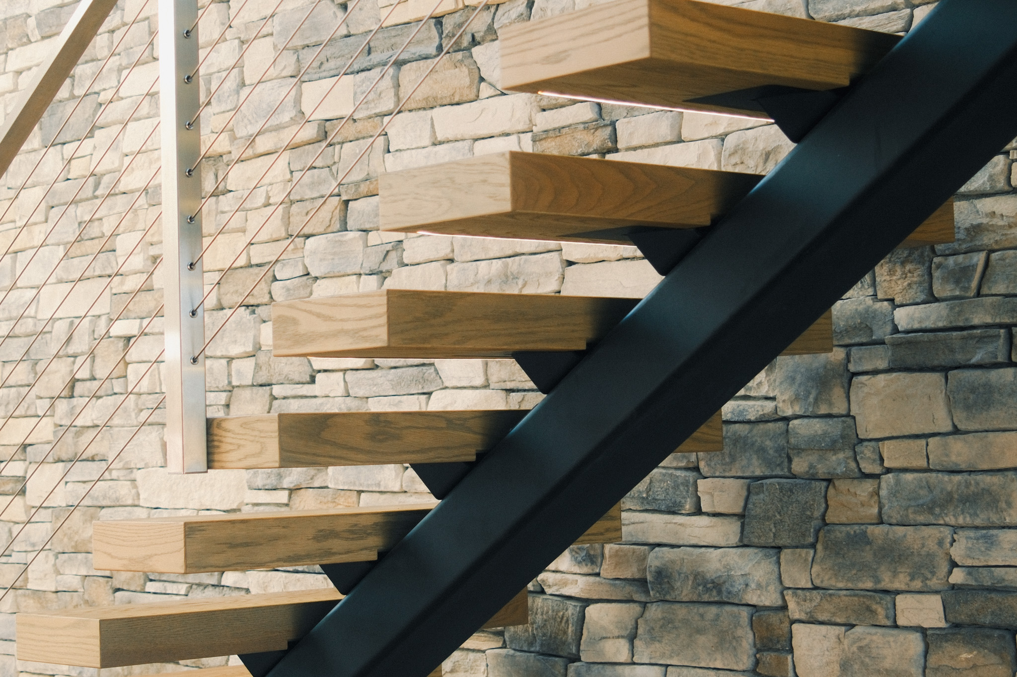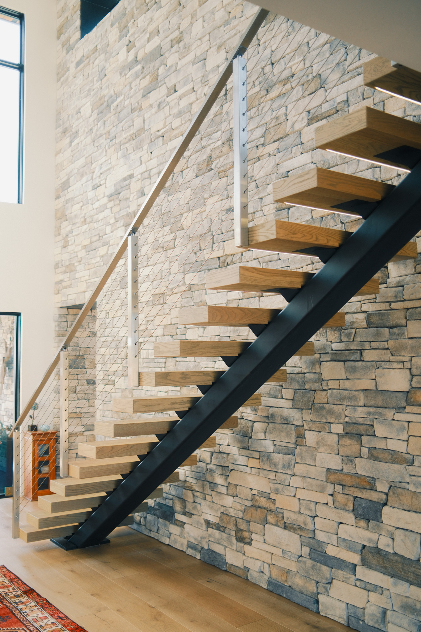 Perched on a ridgeline in the northern Willamette Valley, this modern alpine home beautifully showcases the versatility of the FLIGHT Mono System. The thick White Oak LED treads provide warmth against the crisp contrast of the black powder-coated stringer, and the stainless steel cable posts complement the home’s organic palette set against the two-story stone accent wall.