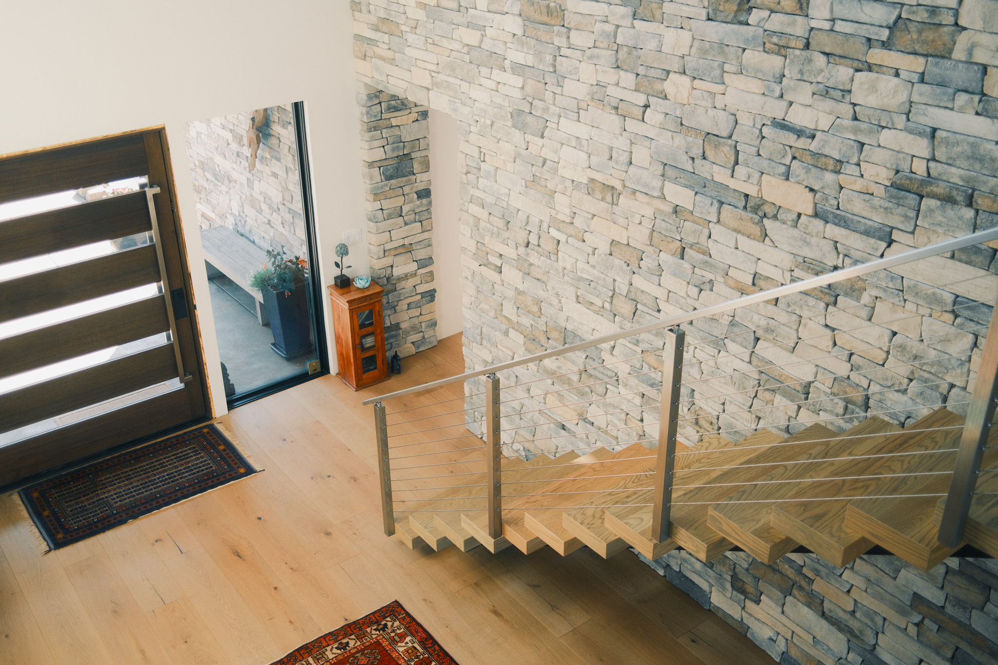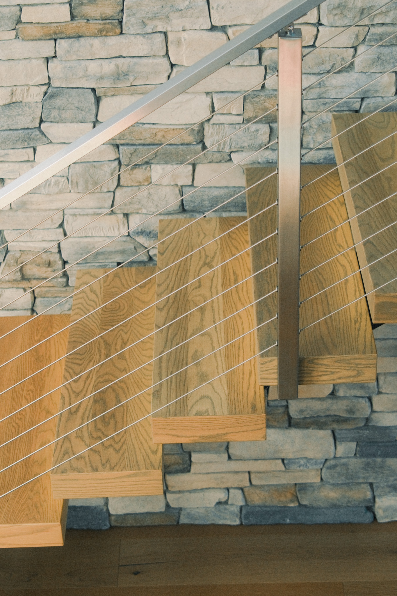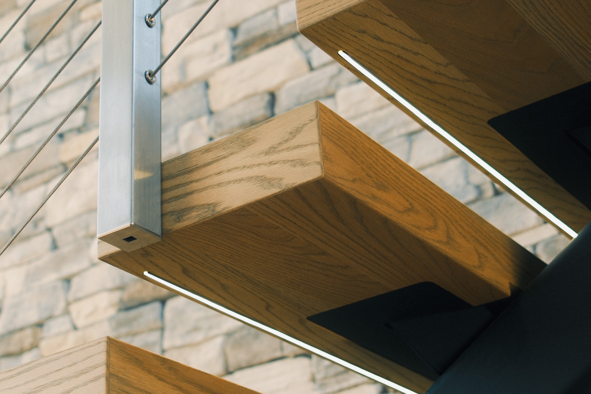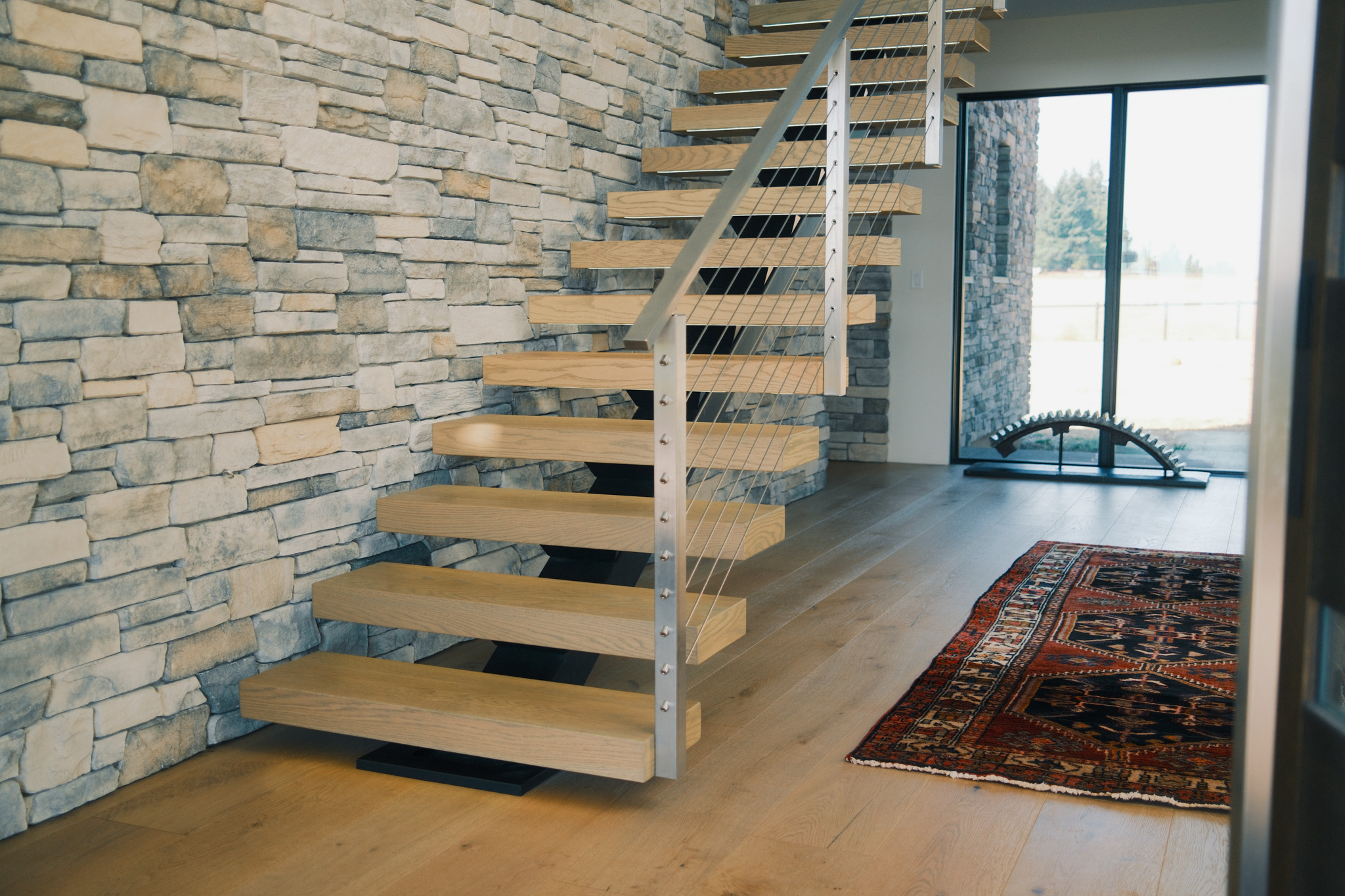 Perched on a ridgeline in the northern Willamette Valley, this modern alpine home beautifully showcases the versatility of the FLIGHT Mono System. The thick White Oak LED treads provide warmth against the crisp contrast of the black powder-coated stringer, and the stainless steel cable posts complement the home’s organic palette set against the two-story stone accent wall.