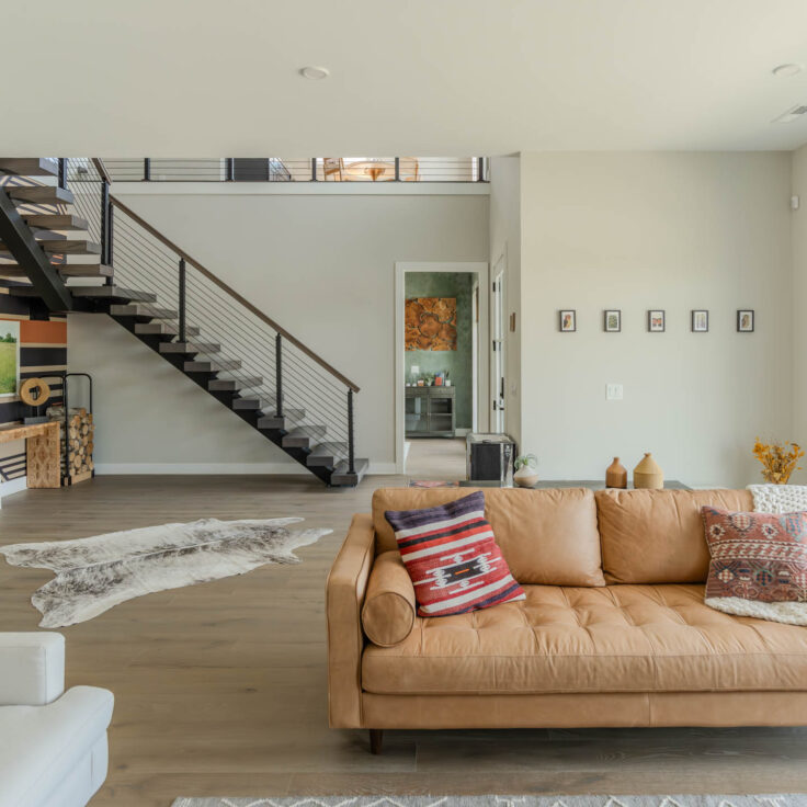 A modern space with a traditional touch. This FLIGHT Mono includes industrial-style Onyx rods, flat-top wood handrail, and modern treads. With this finishing touch to a gorgeous living room, this homeowner is ready to sit back, relax, and let the centerpiece shine.