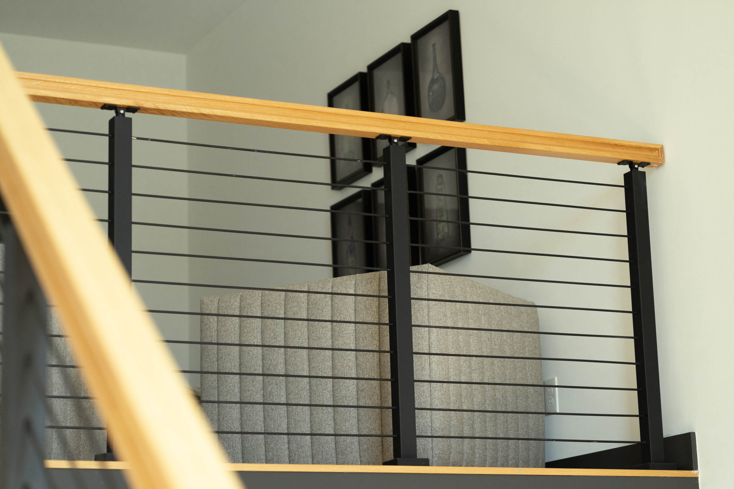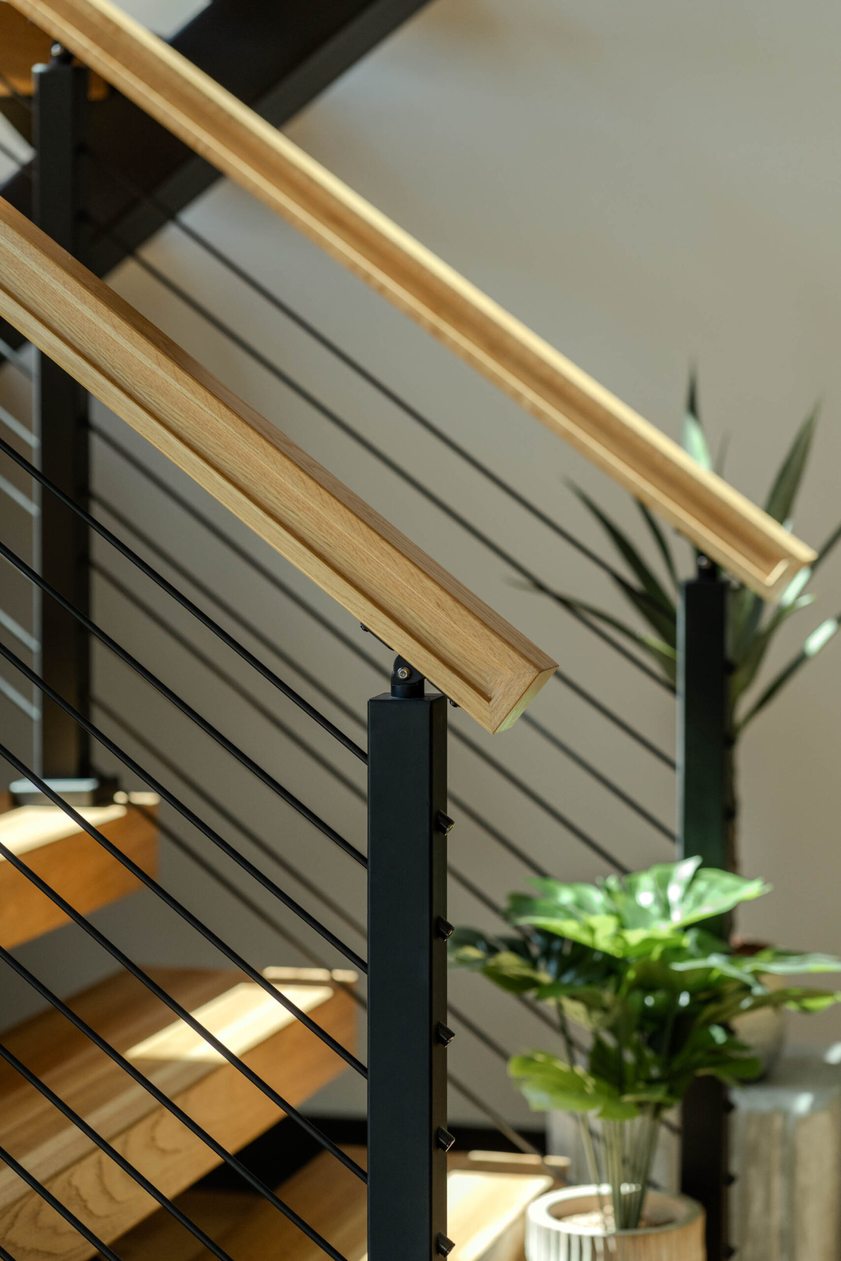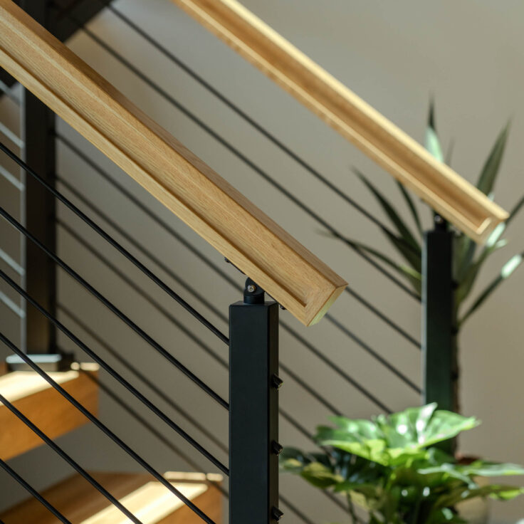 A FLIGHT Mono transitions one floor to the next with a sleek Rod railing and wooden handrail.
