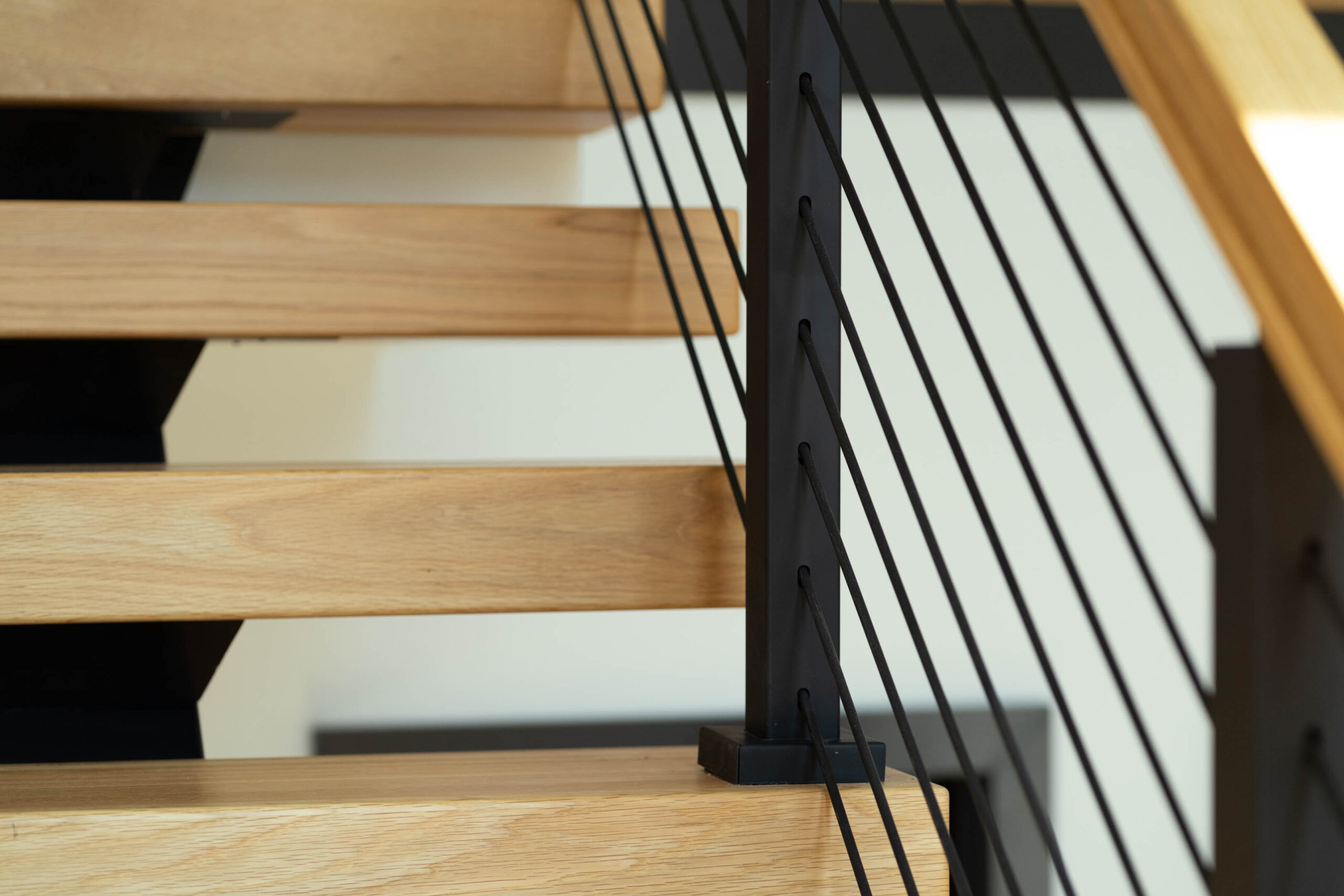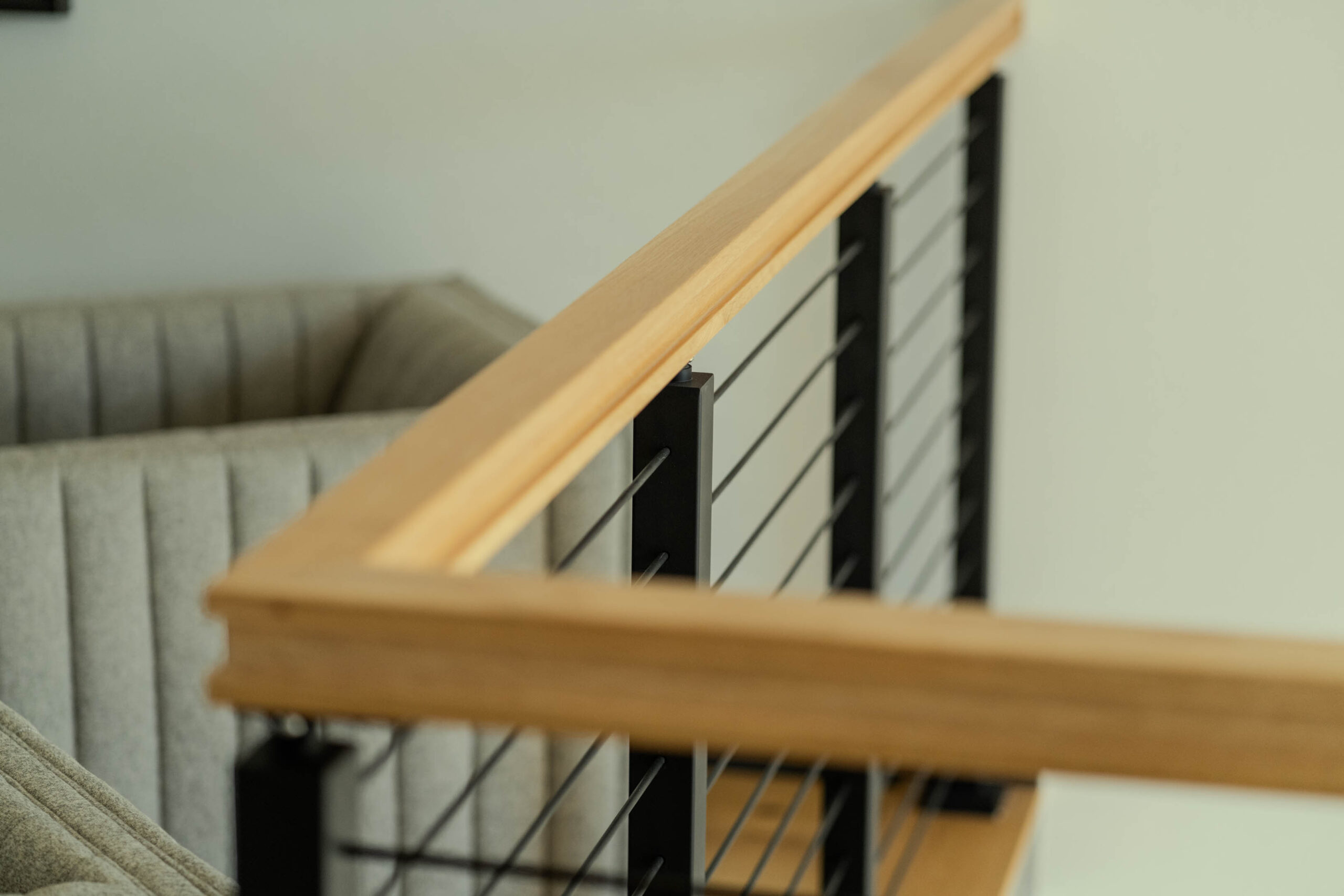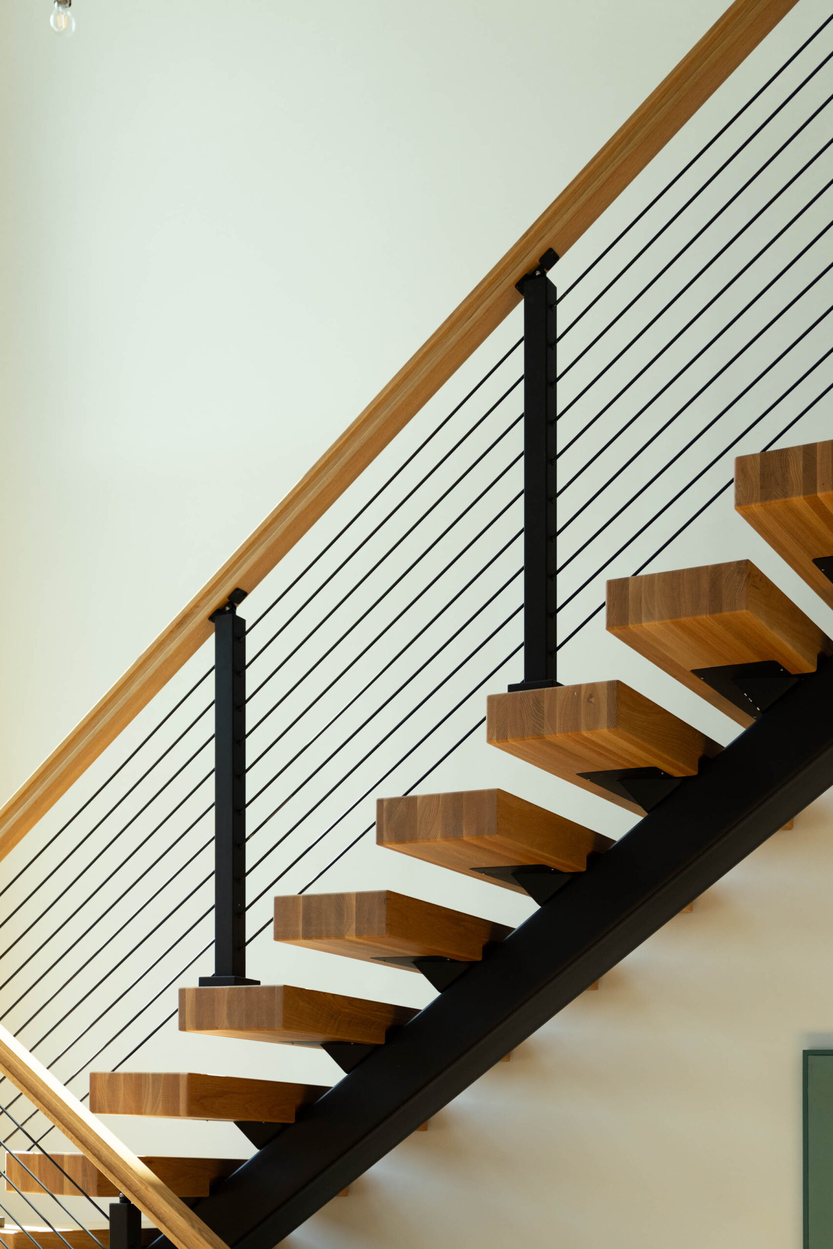 A FLIGHT Mono transitions one floor to the next with a sleek Rod railing and wooden handrail.