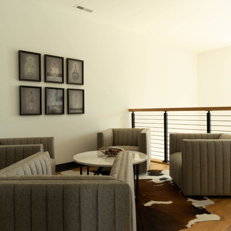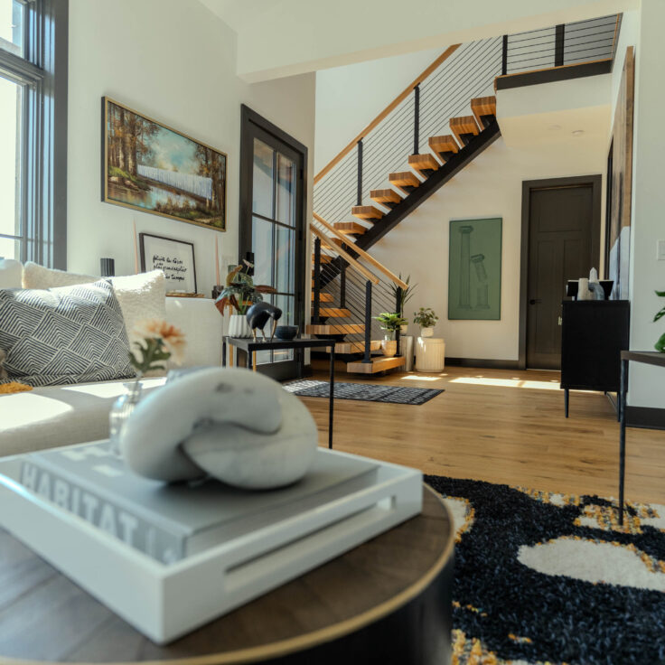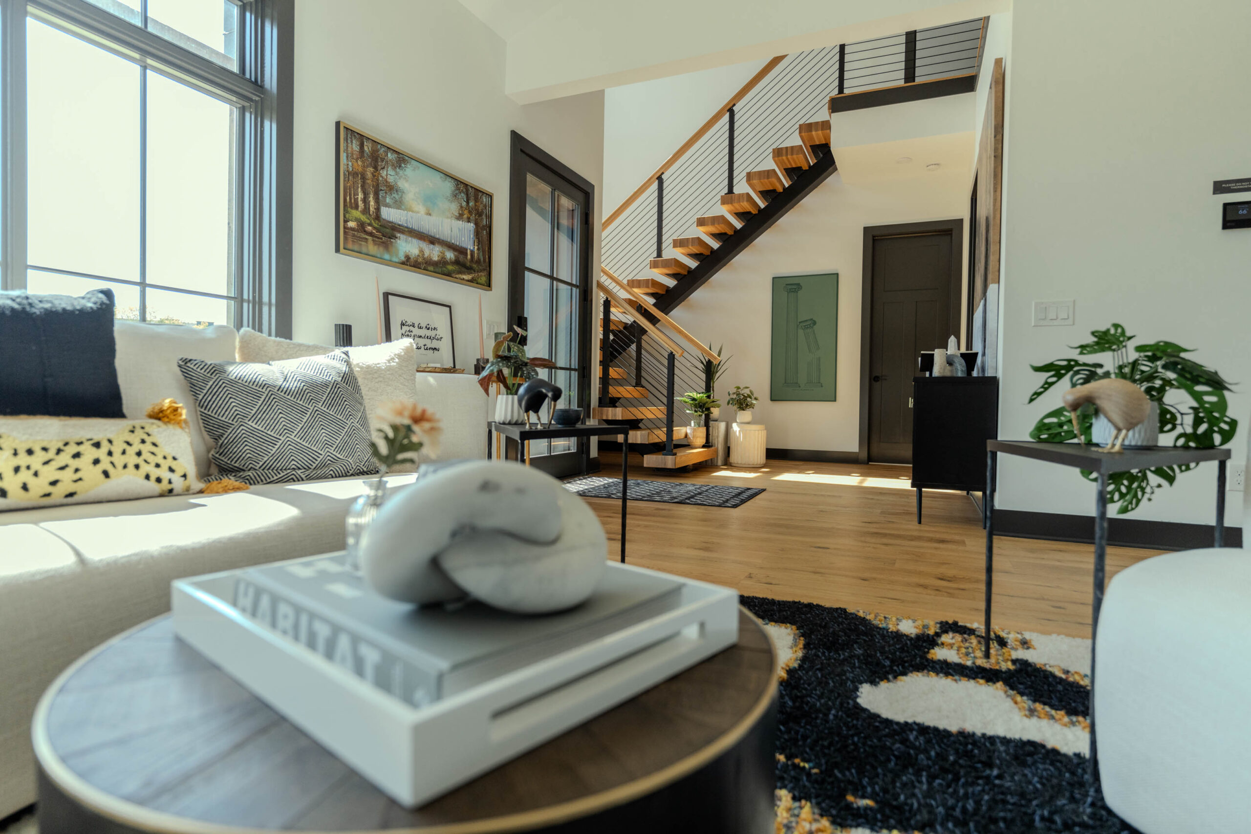A FLIGHT Mono transitions one floor to the next with a sleek Rod railing and wooden handrail. Warm stained treads enhance the darker railing to make it pop. With a focal point on the staircase, this customer used wall decor to personalize the room, while natural lighting added the finishing touches.